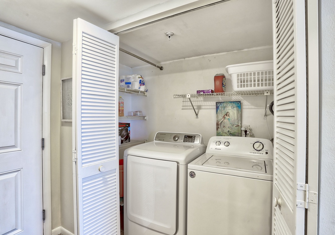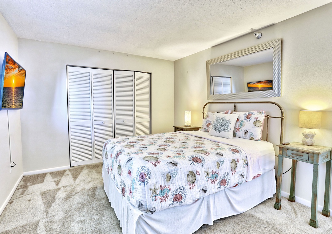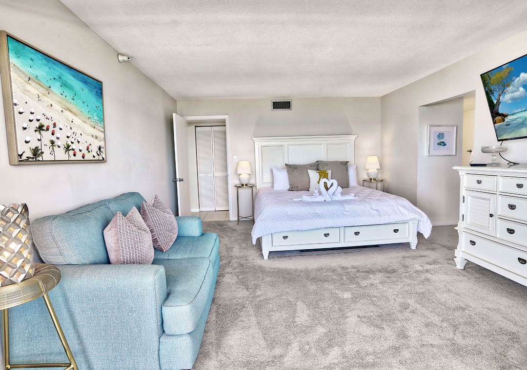 Retreat to the large master bedroom at the end of your day, featuring a king bed, TV, and an attached bathroom, plus direct access to the balcony. The guest bedroom offers a cozy full-sized bed and another TV for your convenience. You'll also find a washer and dryer in the unit for added convenience.