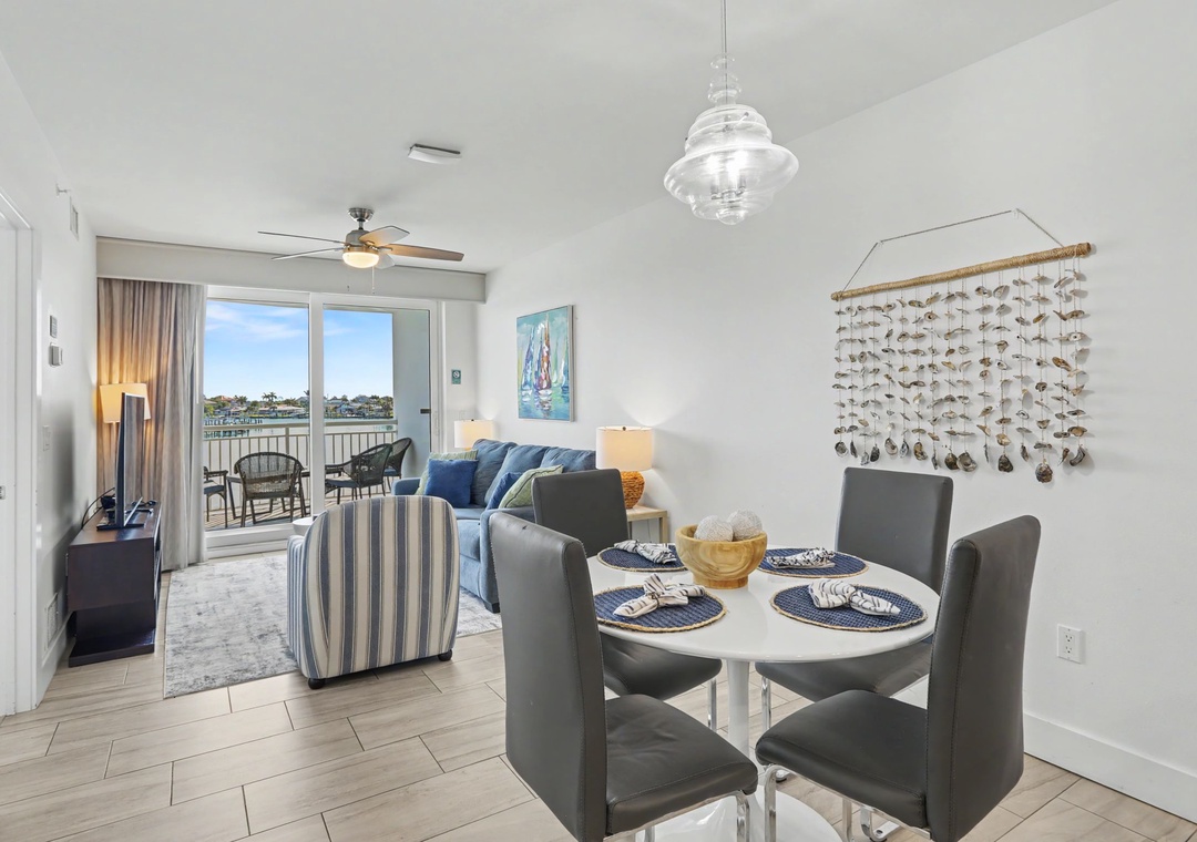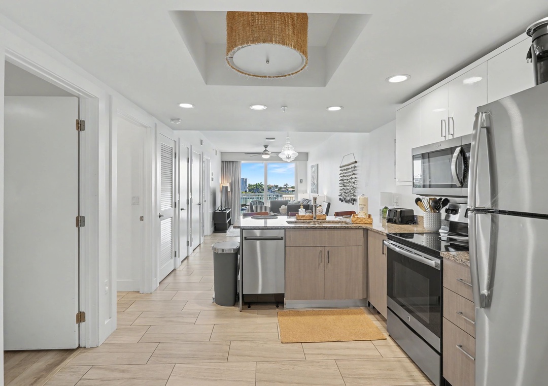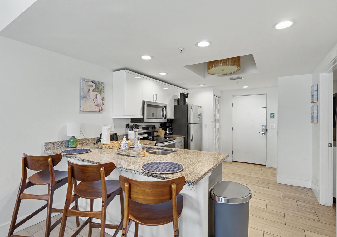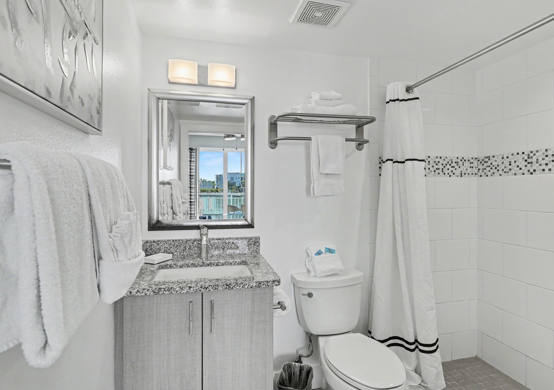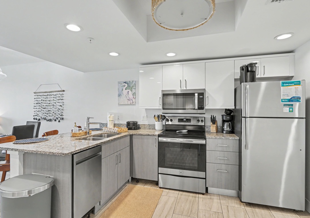 Enjoy a night in and cook up a storm. The kitchen is a chef's dream, offering new, top of the line shiny stainless appliances, upscale granite countertops, utensils, and cookware needed to whip up a 5 star feast. Whether you are indoors at the dining table, on the plush living room sofa, or outside on one of the balconies, you are sure to get that vacation feel. When you are ready to retire, unit 204 offers 2 bedrooms, with flat-screen TVs, as well as the sleeper sofa for a total sleeping capacity of 6 guests. The main bedroom consists of a king bed and a private bathroom, which has a walk-in shower. The second bedroom has a queen bed and access to a full bathroom. This condo is sure to provide the comfortable accommodations your group is looking for on your Treasure Island beach vacation.