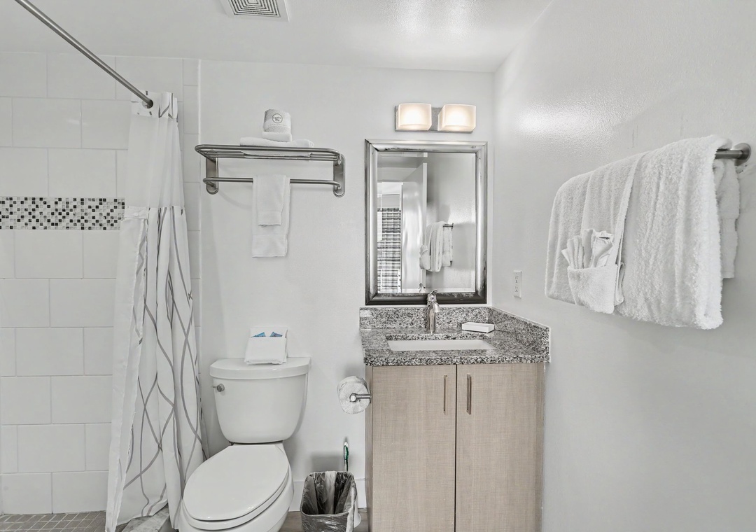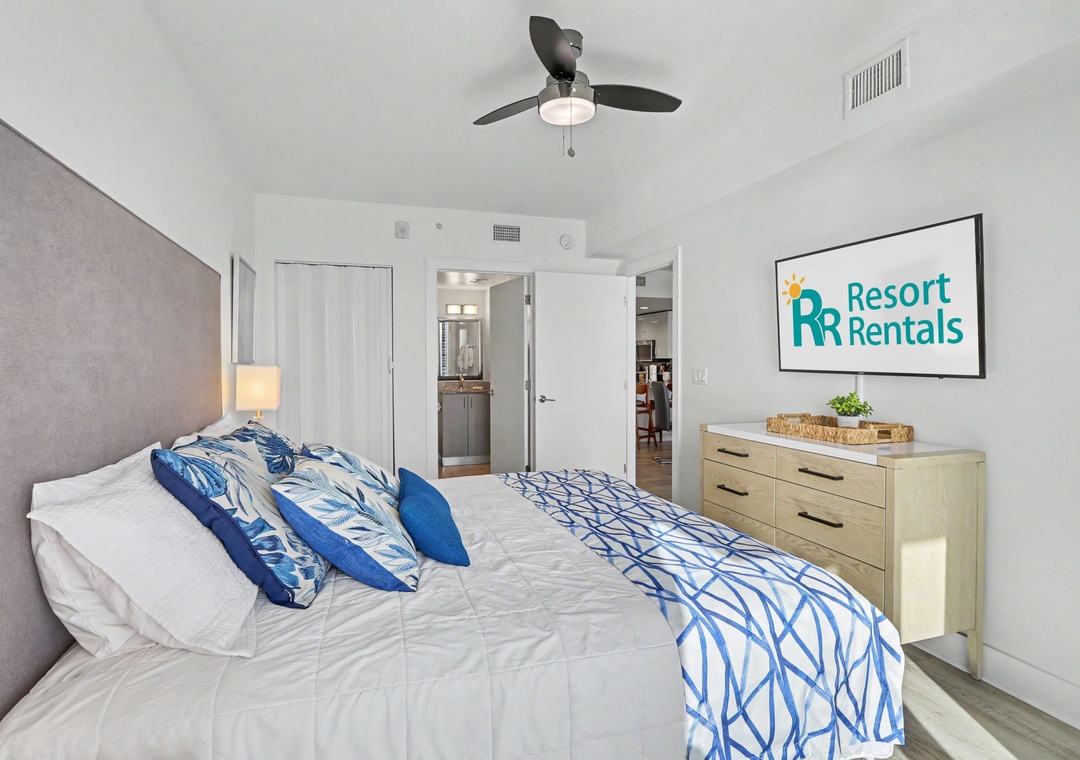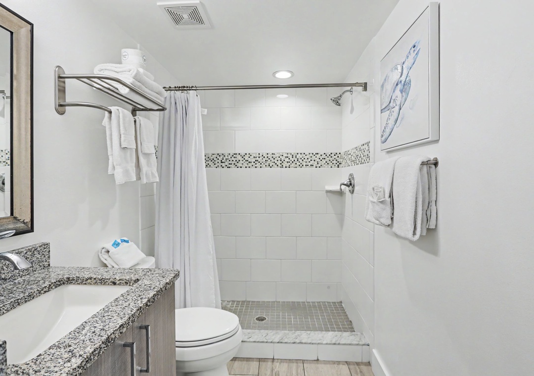 The main bedroom features a king bed and a private bathroom, which has a walk-in shower. The second bedroom has a queen bed and direct access to another full bathroom. Treat yourself on your next vacation by staying at this charming 2-bedroom, 2-bathroom vacation rental!
