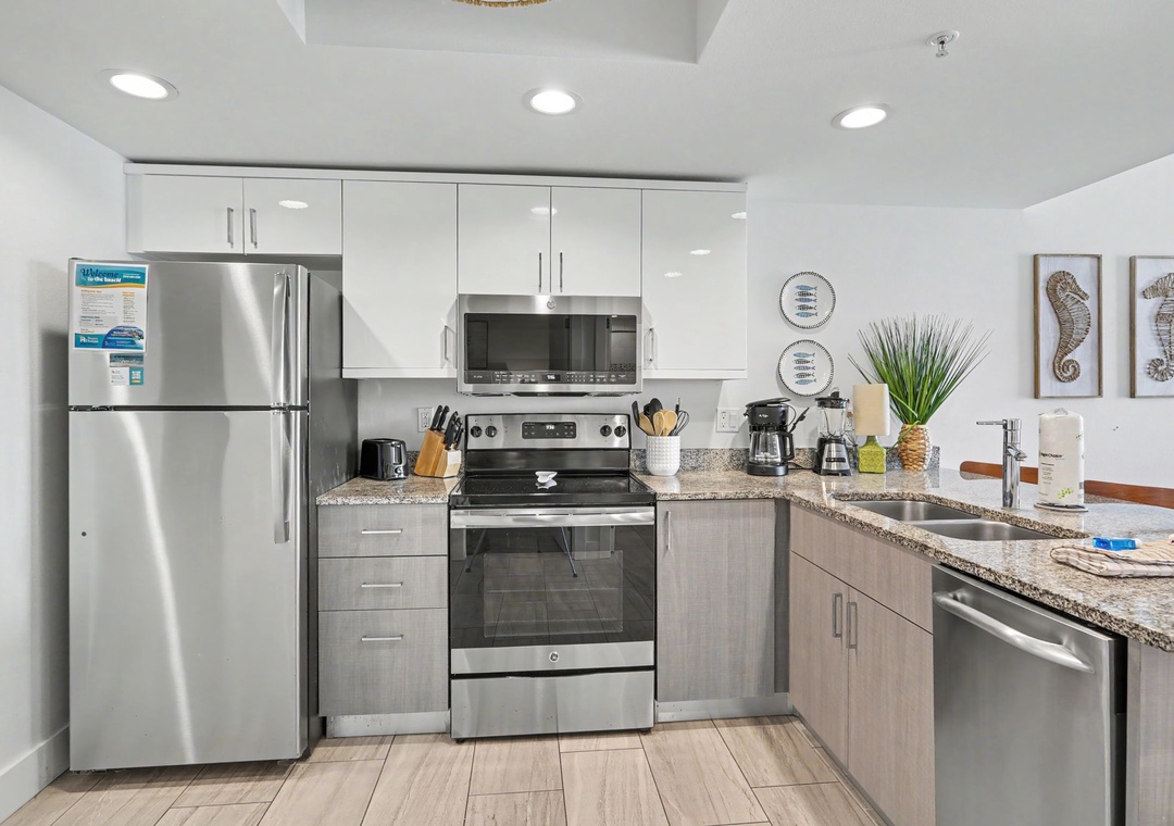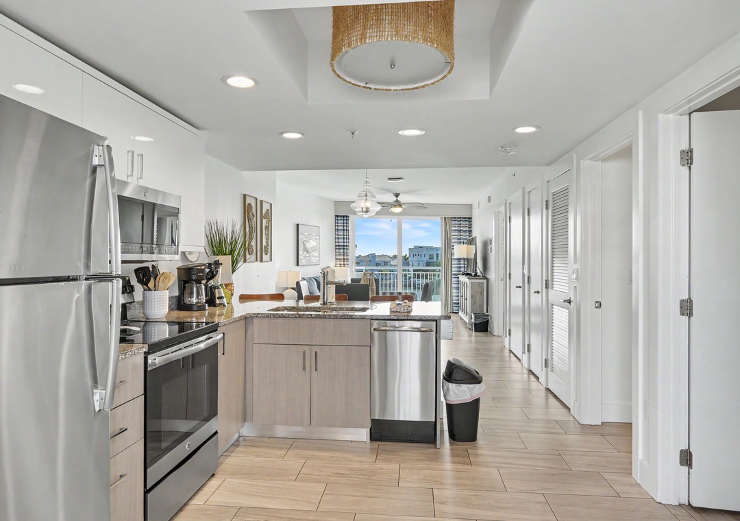 The kitchen is fully stocked with all the cookware needed to whip up your family’s favorite meal. You’ll be sure to enjoy the spacious living room with a large flat screen TV and comfortable sofa as this is the perfect place to relax after a long day of sunbathing, swimming, and adventure taking! Whether you are indoors at the dining table, or outside on one of the balconies, you are sure to get that vacation feel.