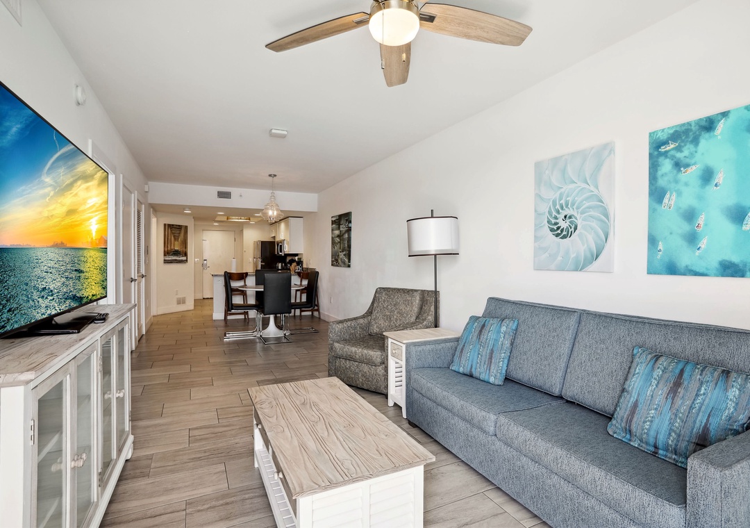 The kitchen is fully stocked with all the cookware needed to whip up your family’s favorite meal. You’ll be sure to enjoy the spacious living room with a large flat screen TV and comfortable sofa as this is the perfect place to relax after a long day of sunbathing, swimming, and adventure taking! Whether you are indoors at the dining table, or outside on one of the balconies, you are sure to get that vacation feel.