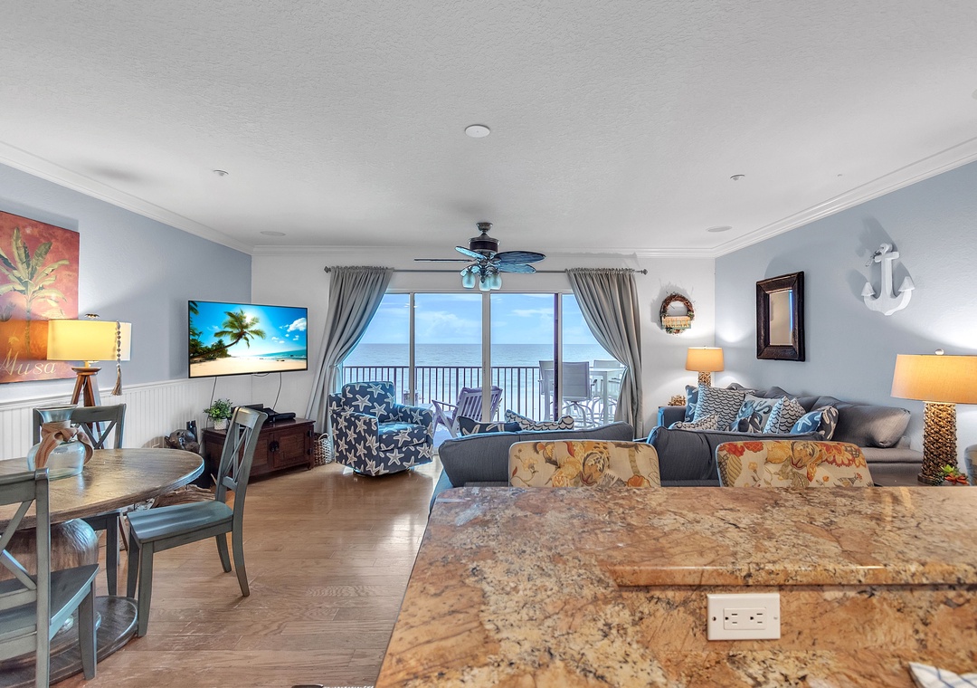 If you are looking for charming beachfront location with outstanding views, and a welcoming atmosphere this is it! Unit 302 at Oceanside Condominiums is an inviting spacious condo filled with natural light. Tastefully decorated and comfortable, this condo feels like paradise. Unit 302 has an open floor plan that the whole family can enjoy. The living area has access to the fully furnished balcony. From sunrise to sunset the views from inside and out here are gorgeous! The kitchen is fully stocked with all appliances, pots, pans, cooking utensils, plates and glassware that you'll need to make yourself at home during your vacation. The connecting dining area seats four at the table. Two additional bar stools are found at the kitchen bar, or you can choose outside seating and enjoy watching the beautiful waves washing in and dolphins splashing by. The spacious master bedroom has a king bed for maximum relaxation, a TV, large roomy dresser (no hanging closet) and an attached bathroom with a walk in shower. The second bedroom features two queen size beds and hall bathroom with a tub/shower combo.