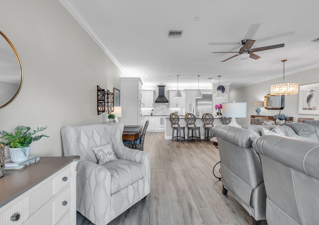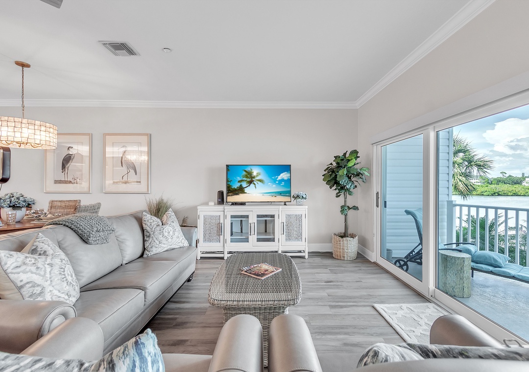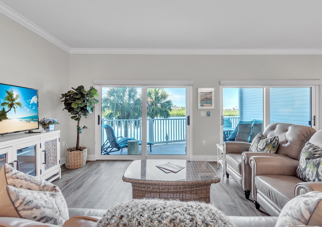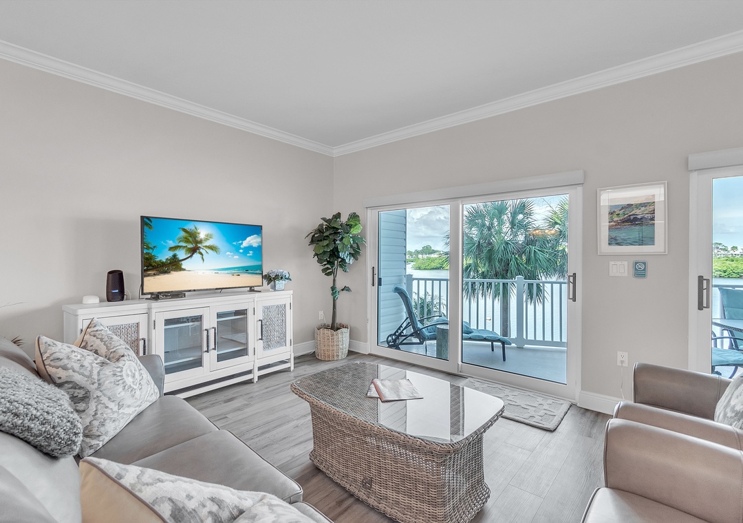 Experience relaxed coastal living in this beautifully updated 2-bedroom, 2- bathroom condo at Palm Beach Condominiums, perfectly situated with stunning views of the Intracoastal Waterway. This spacious, open-concept retreat features stylish décor and a soothing color palette throughout. The living room offers a plush couch, two oversized chairs, a large Smart TV, and access to a private balcony where you can unwind while watching boats glide by. A cozy reading nook and convenient desk area in the living room provide great spots to relax or catch up on work.