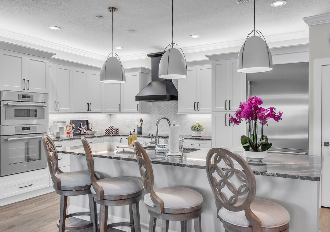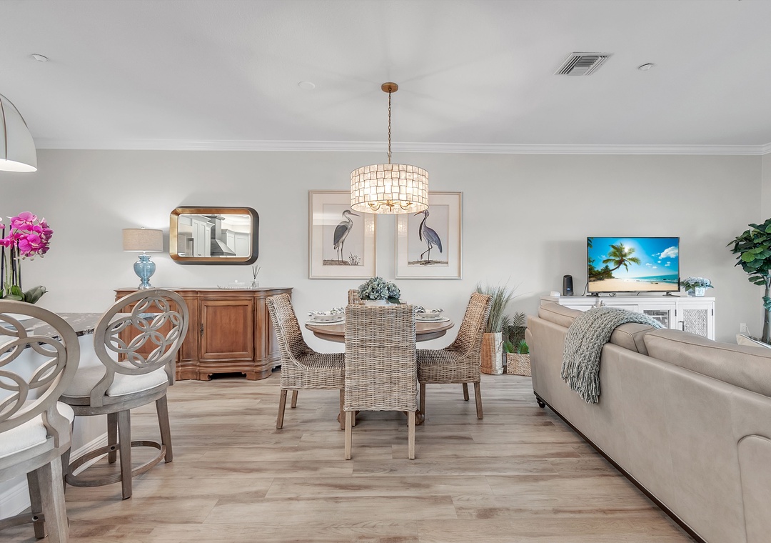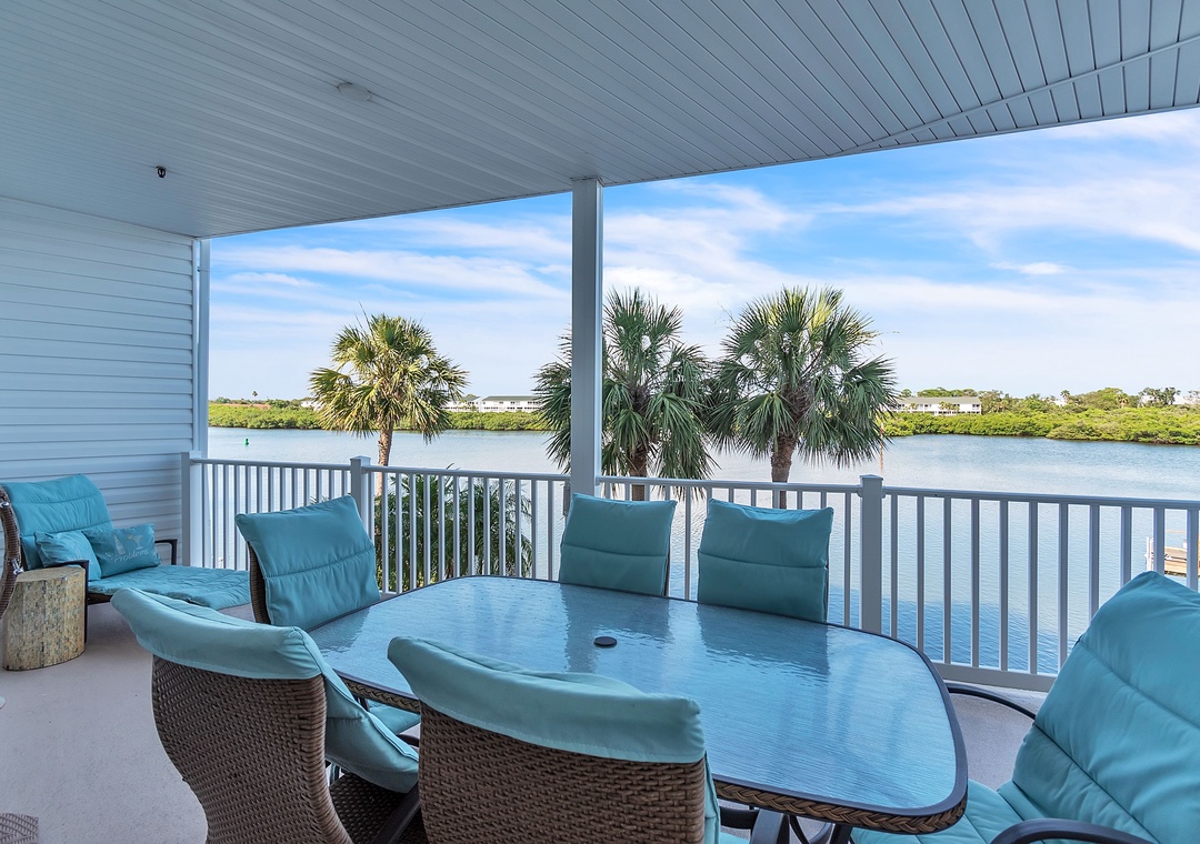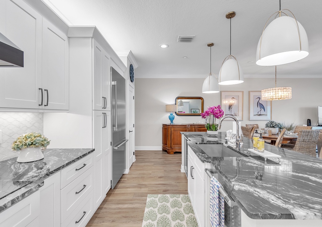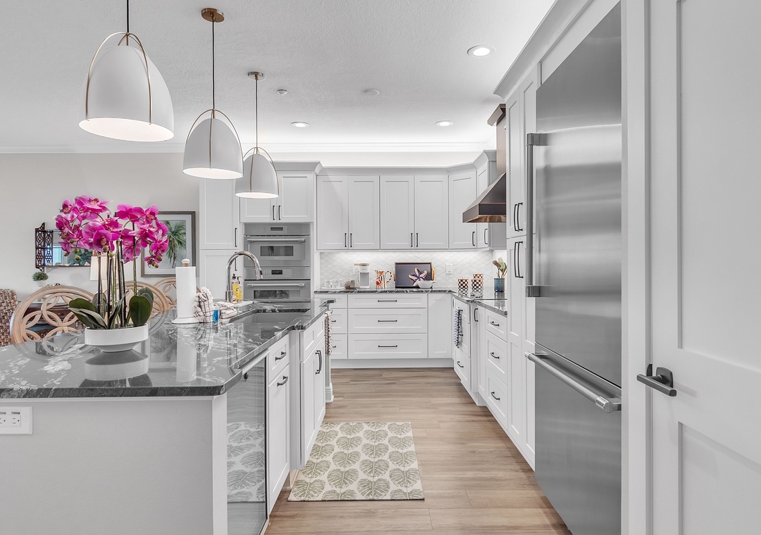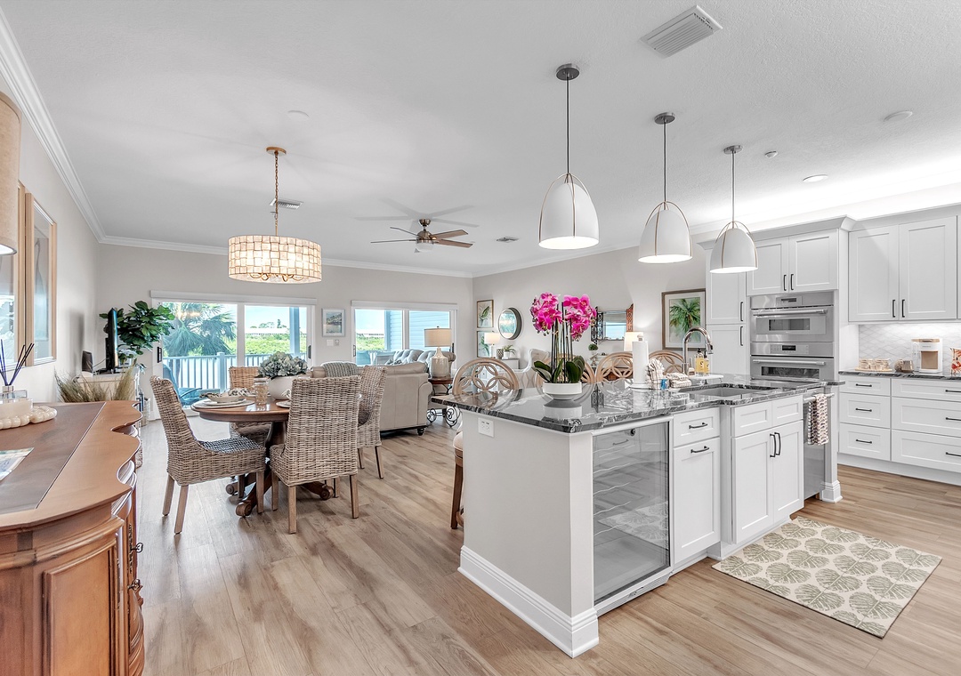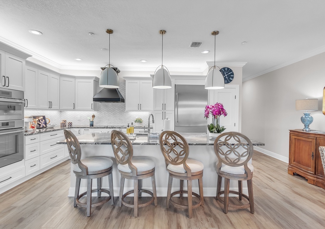 The fully equipped kitchen is a chef’s dream, featuring top-of-the-line stainless steel appliances and a generous counter with bar seating—perfect for casual meals or entertaining. The inside dining table comfortably seats four, or take it outside and dine al fresco on the balcony, complete with a table and chairs overlooking the water.