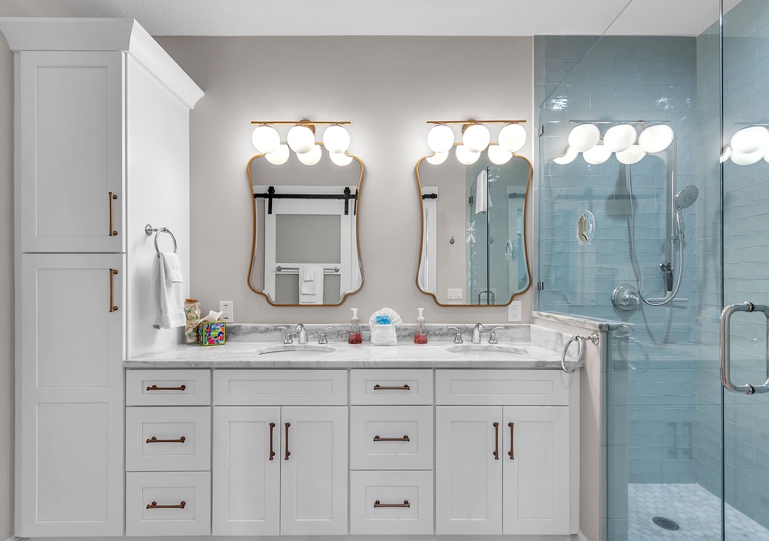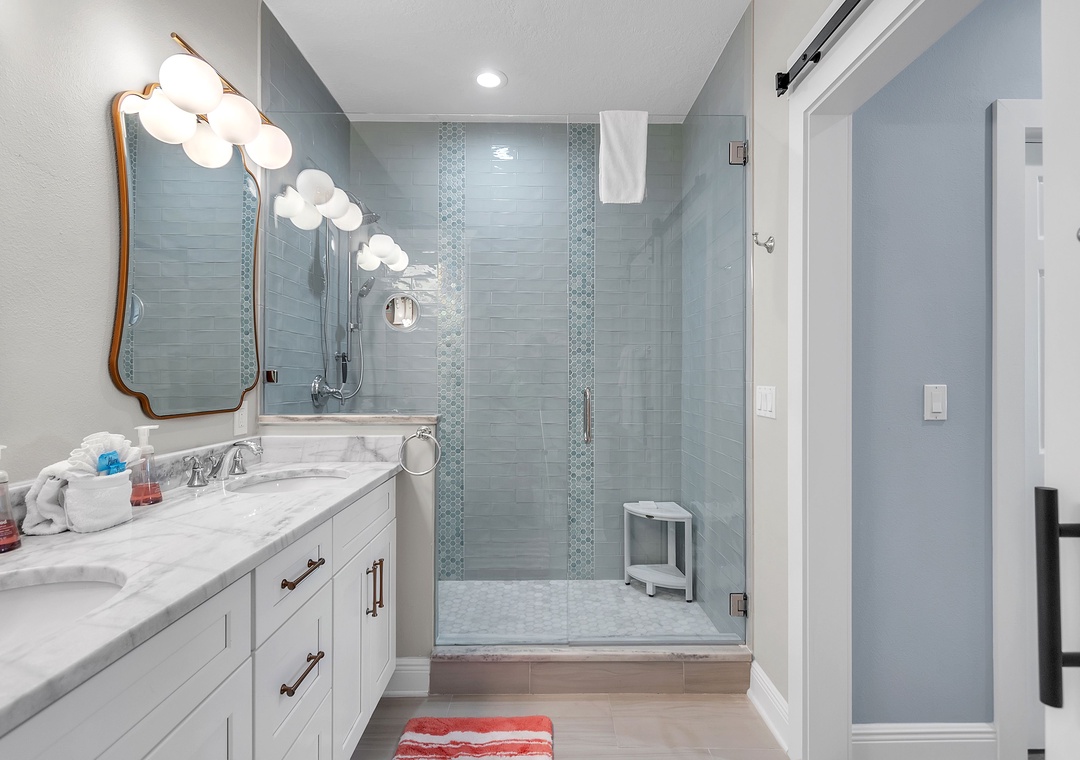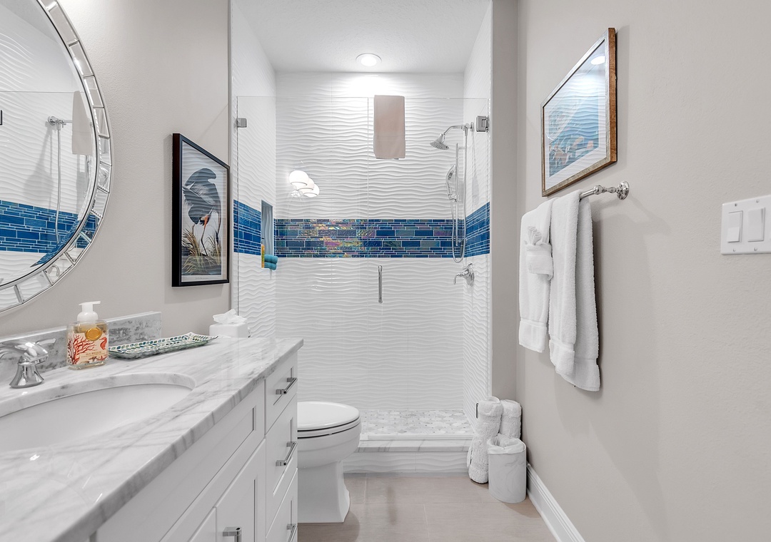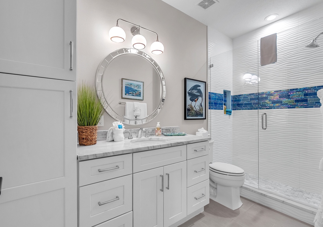 The master bedroom is a serene escape with a king-size bed, a second desk area, and an elegant en-suite bathroom with a double vanity and spacious walk-in shower. The guest bedroom offers two twin beds and easy access to the second full bathroom. A washer and dryer are conveniently located within the unit adding to the comfort here.