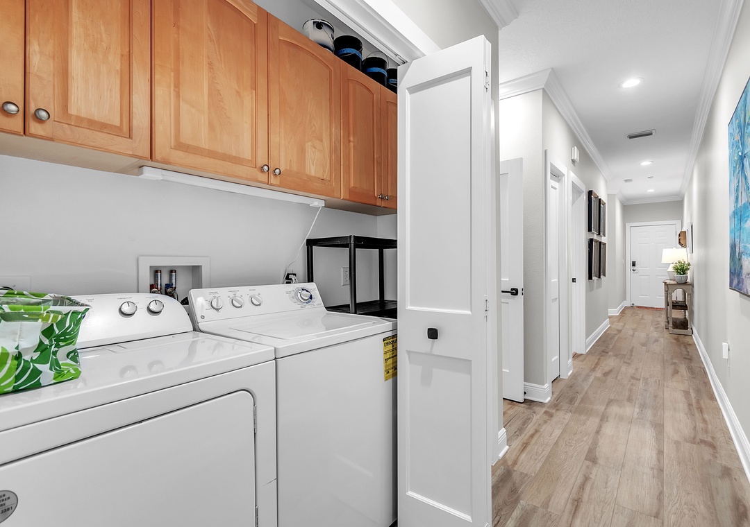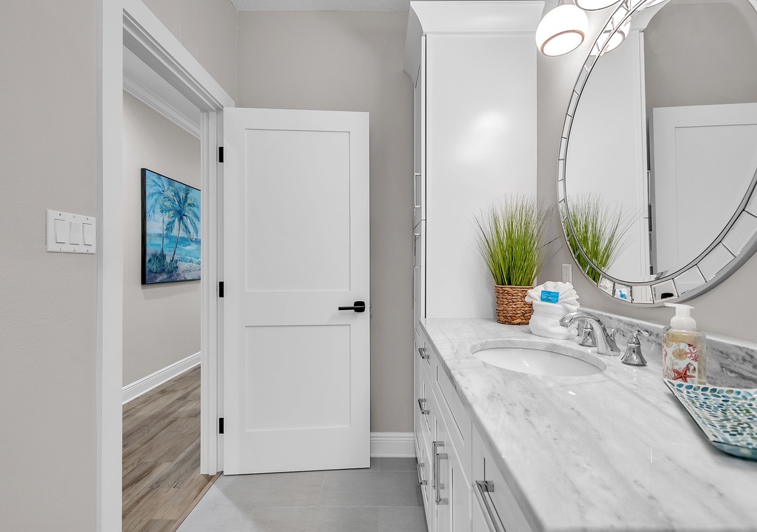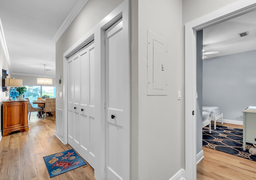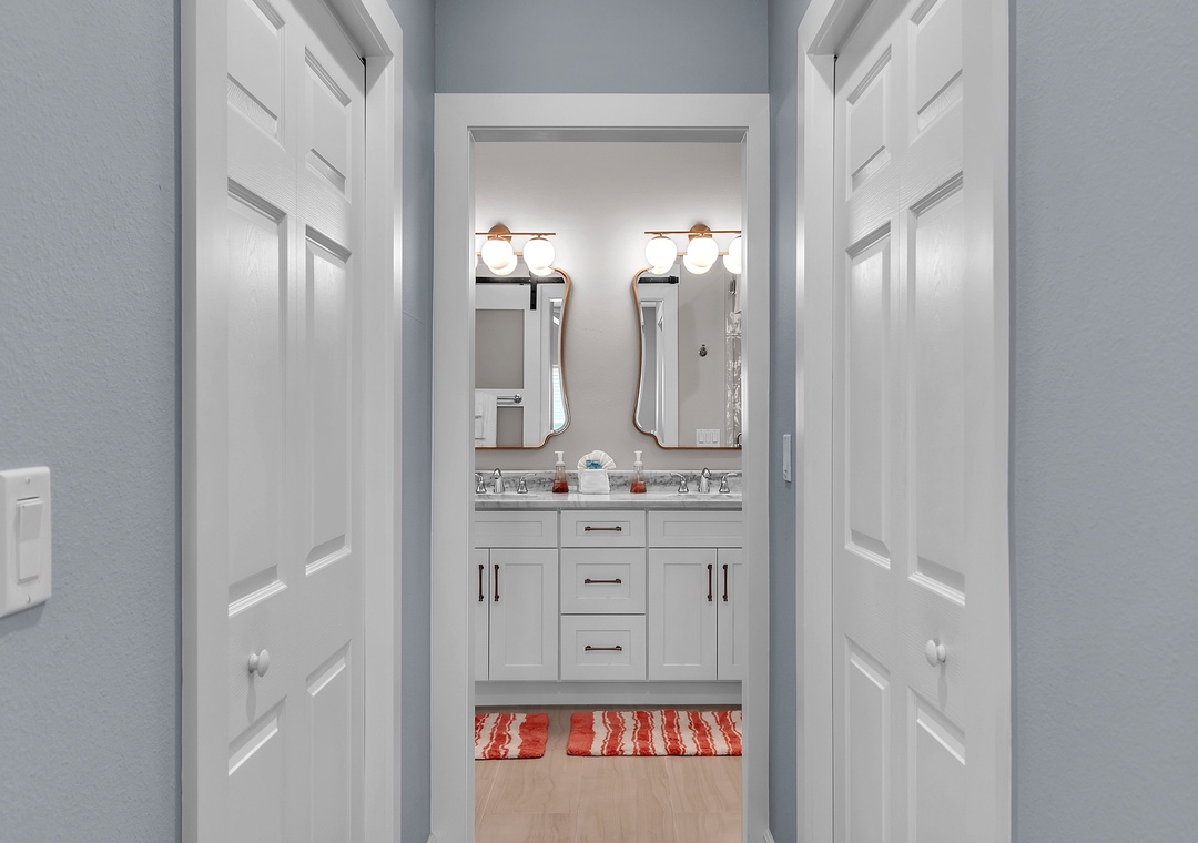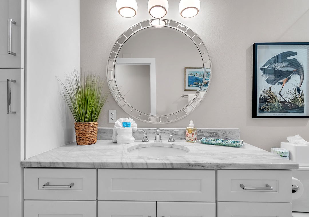 The master bedroom is a serene escape with a king-size bed, a second desk area, and an elegant en-suite bathroom with a double vanity and spacious walk-in shower. The guest bedroom offers two twin beds and easy access to the second full bathroom. A washer and dryer are conveniently located within the unit adding to the comfort here.