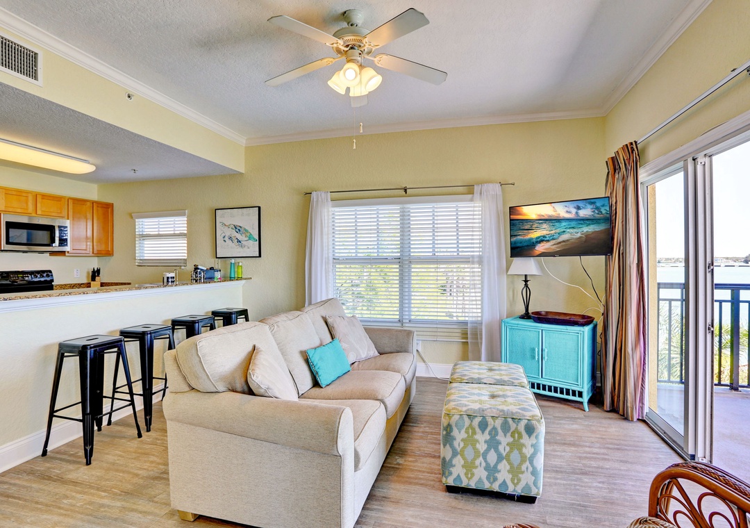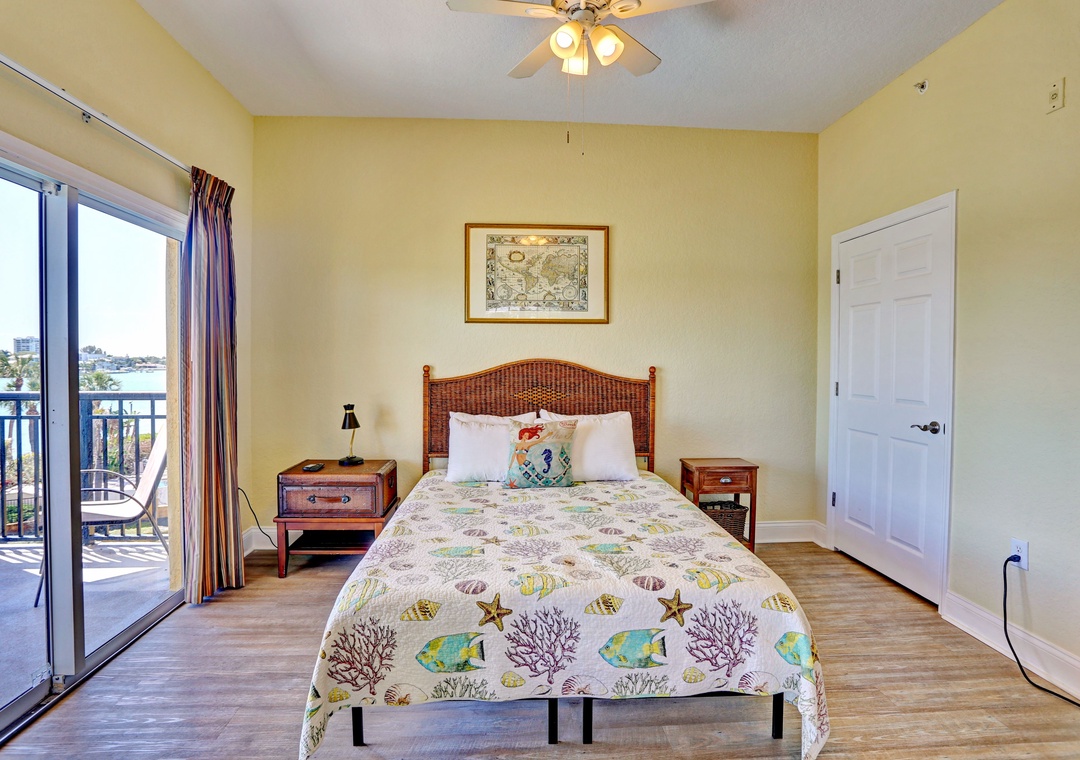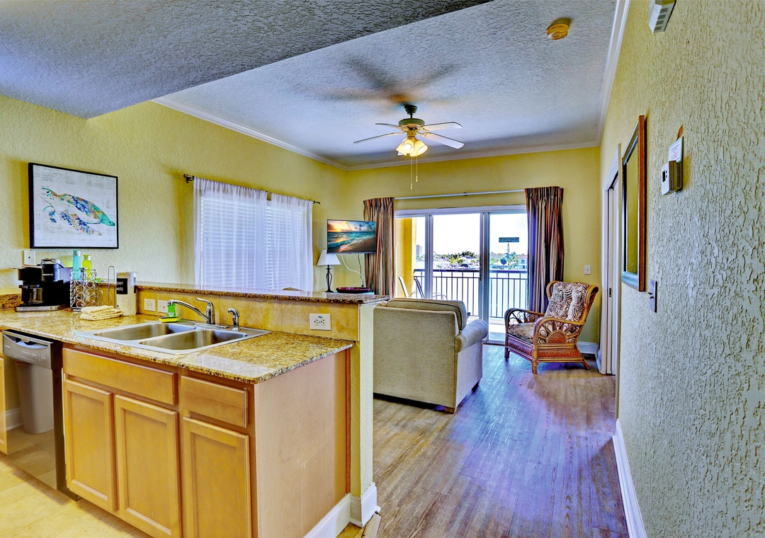 Indulge in the comforts of this two-bedroom, two-bathroom corner condo, where you'll find a luxurious King bed in the master suite, a cozy full bed in the guest room, and the convenience of a sleeper sofa in the living area. The master bedroom boasts an en-suite complete with a generous Jacuzzi tub for your relaxation. Step onto the spacious private balcony and savor the breathtaking waterfront views. An open concept design features a generously sized living room, perfect for unwinding and equipped with a flat-screen TV for your entertainment and a fully equipped kitchen is ready to meet all your culinary needs. The kitchen is adorned with granite countertops and eat in bar. Experience the ultimate in comfort and convenience during your stay.