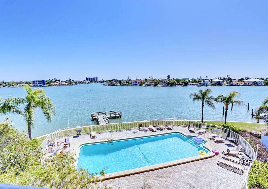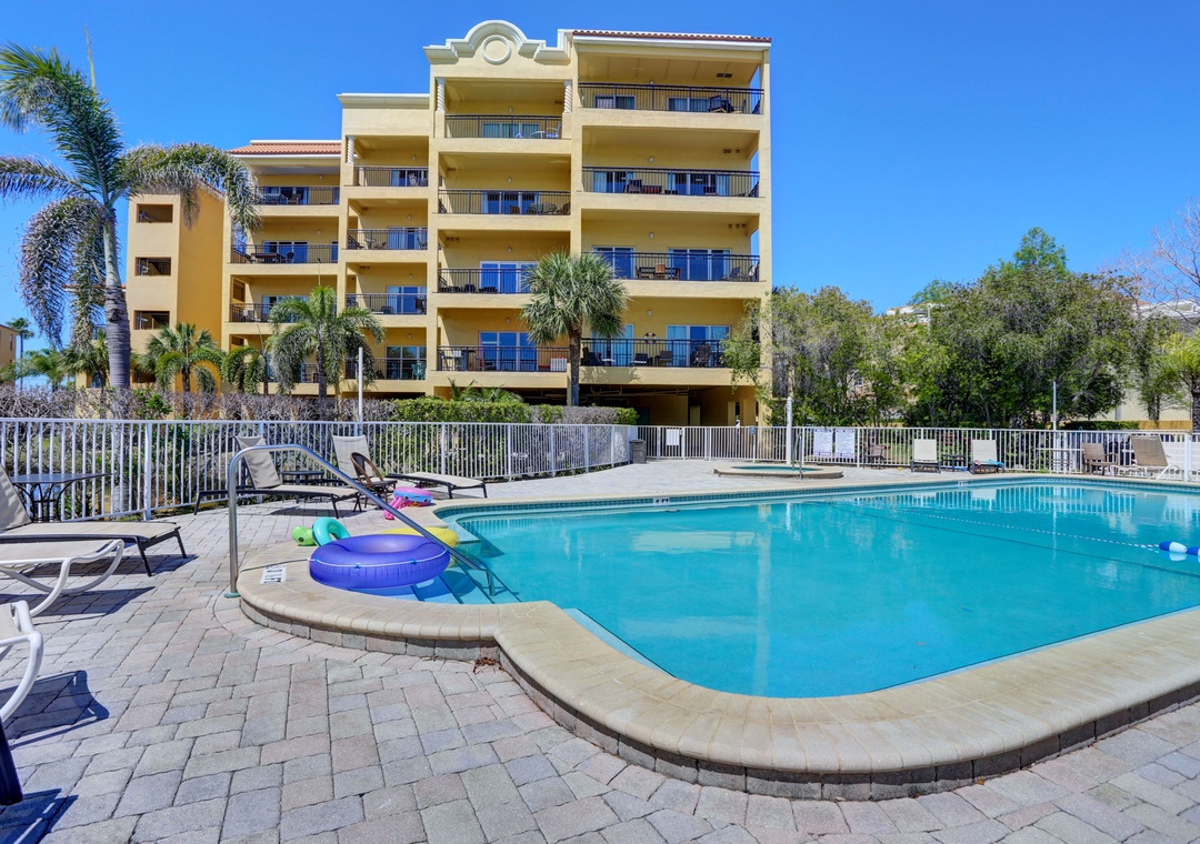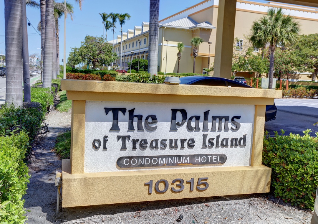 Palms of Treasure Island Resort is a modern condo building in Treasure Island. The resort offers a perfect location, fabulous views, a waterfront swimming pool and hot tub, parking and just steps across from the best section of sand on the Island. Situated in the heart of Treasure Island, you are in easy walking distance of great restaurants, entertainment, grocery stores, shopping, activities, and just moments from Johns Pass Village on the Beach Trolley. Please note - Palms of Treasure Island is a non-smoking resort. There are smoking areas nearby in the garage area, but smoking is not allowed in any part of the building (including the balconies).