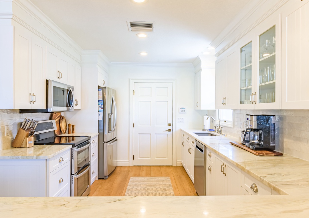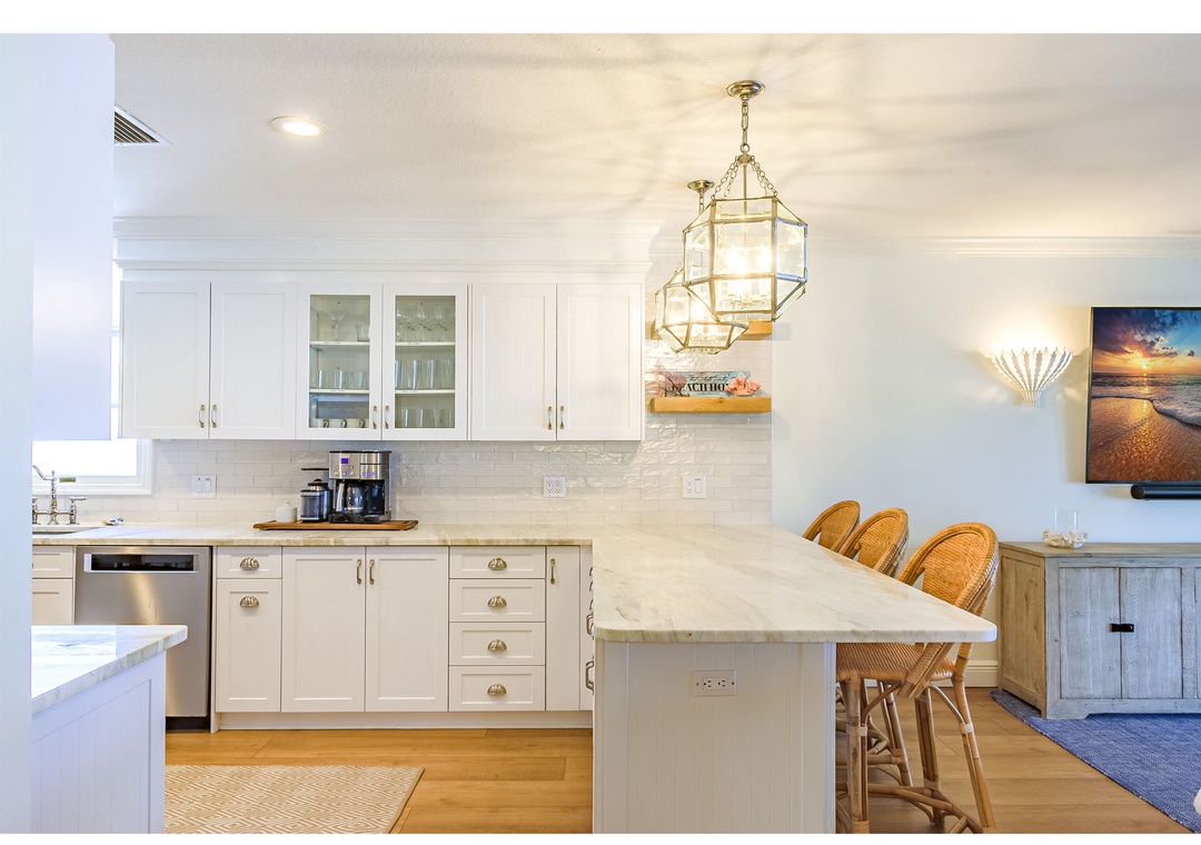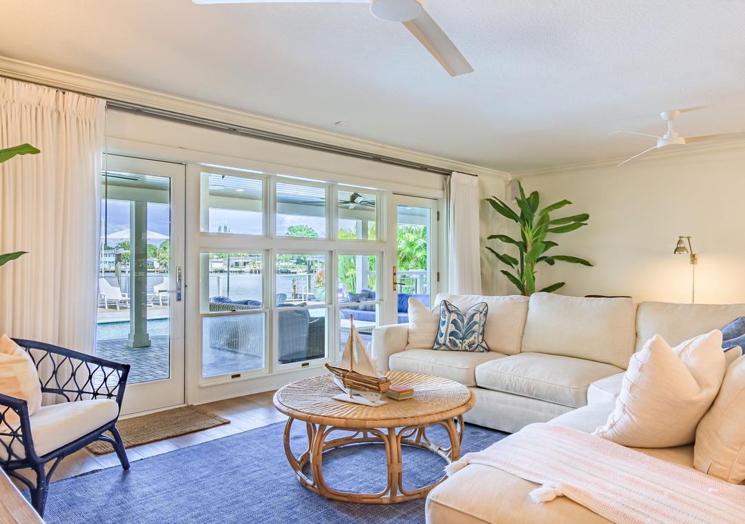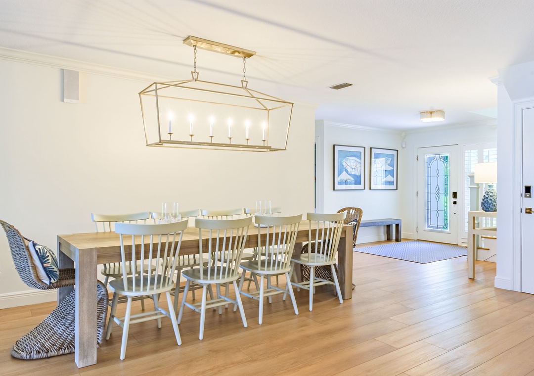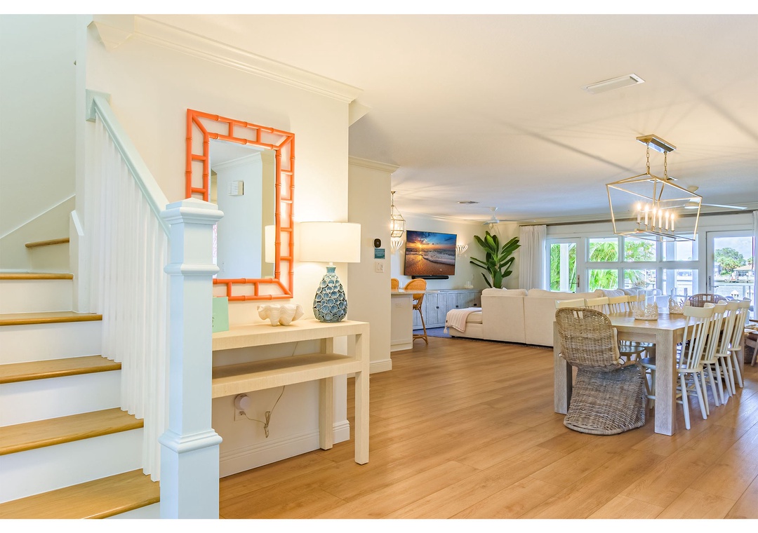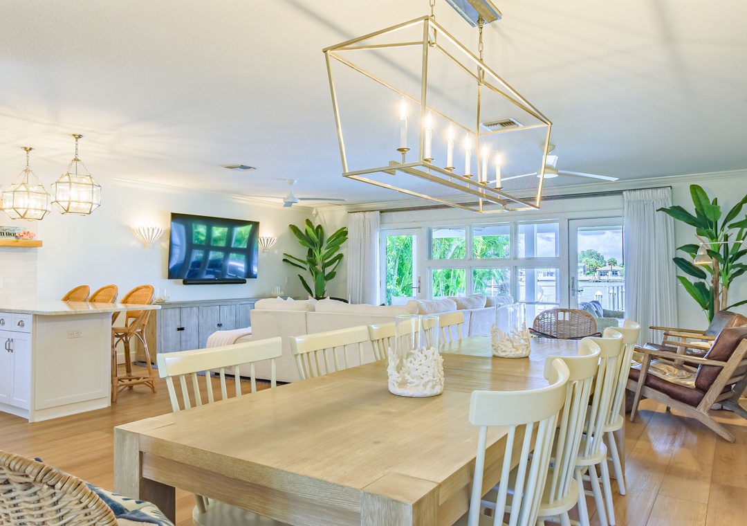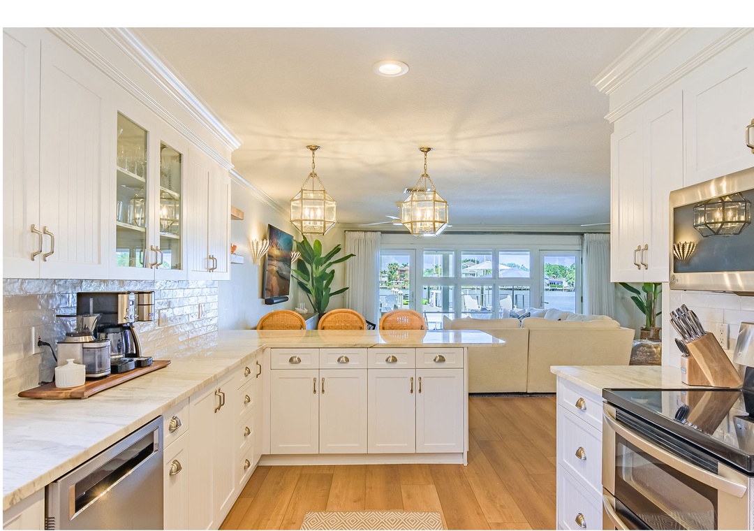 Welcome to Paradise Cove, where you are sure to experience elegance, comfort and style! This 4-bedroom, 3-bathroom home is perfectly situated on the Intracoastal Waterway offering wide water views and unparalleled luxury. When you enter the home you will notice the stunning finishes, coastal decor, and elegant lighting that provide a stylish and inviting atmosphere throughout. Relax in the open and spacious living room featuring an oversized, comfy couch, a big screen TV, and direct access to the amazing outside deck. Off of the living room is the gourmet kitchen; bright and open boasting top-of-the-line appliances and fully stocked with dishware, utensils and cooking essentials needed to create your family meals. Enjoy those meals at the impressive dining table that seats 10. Extra seating is available at the extended kitchen counter.