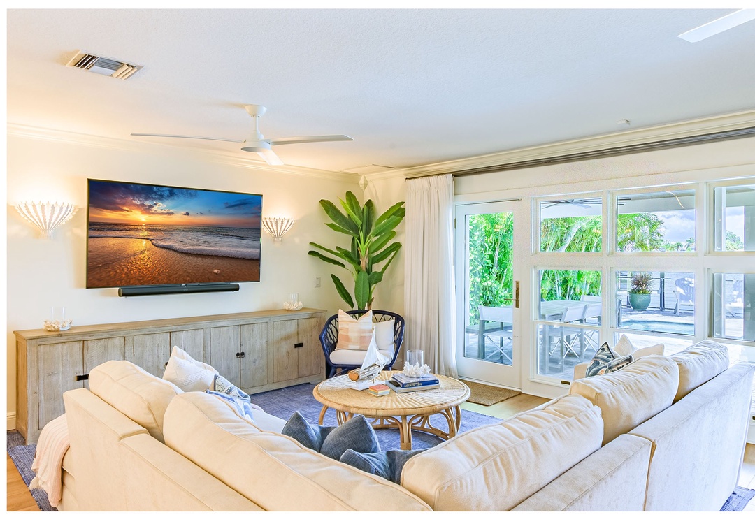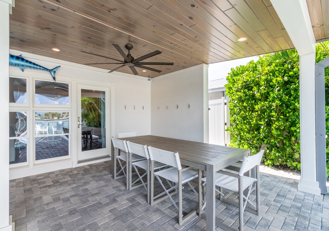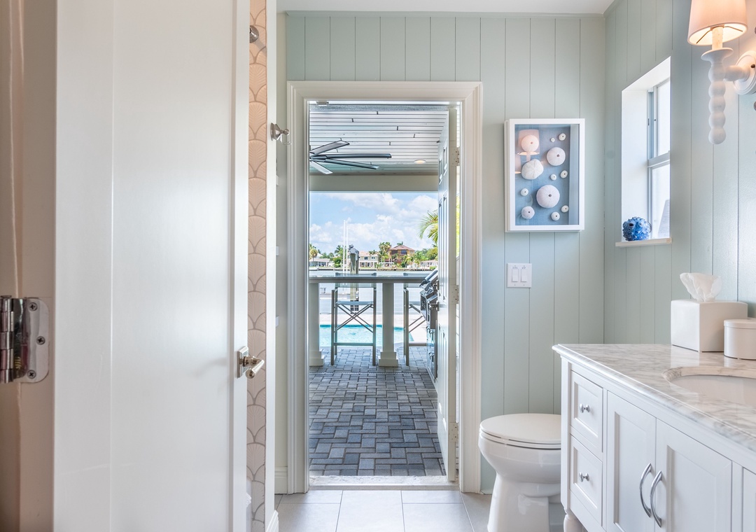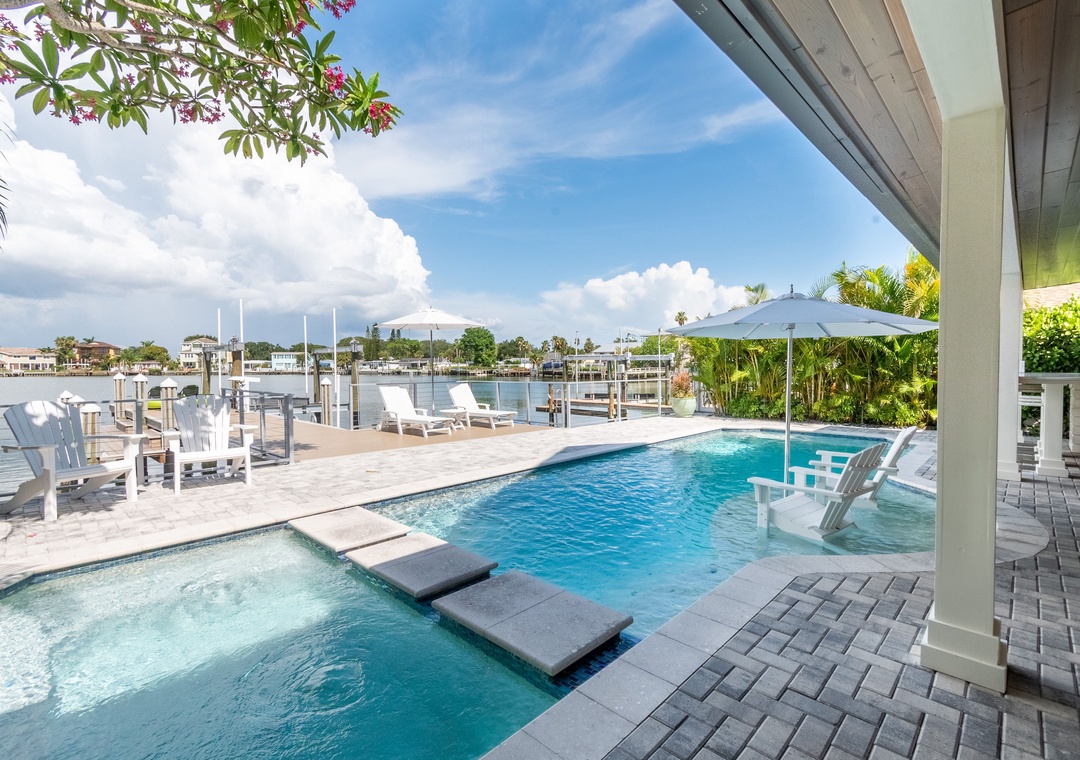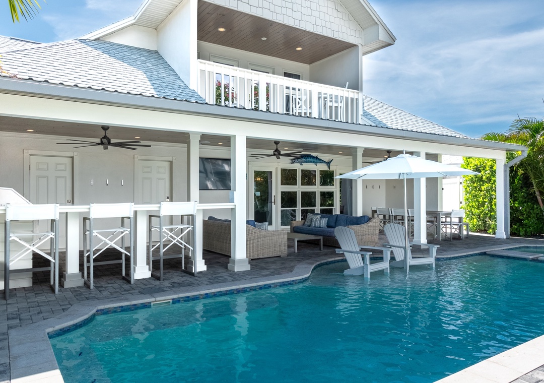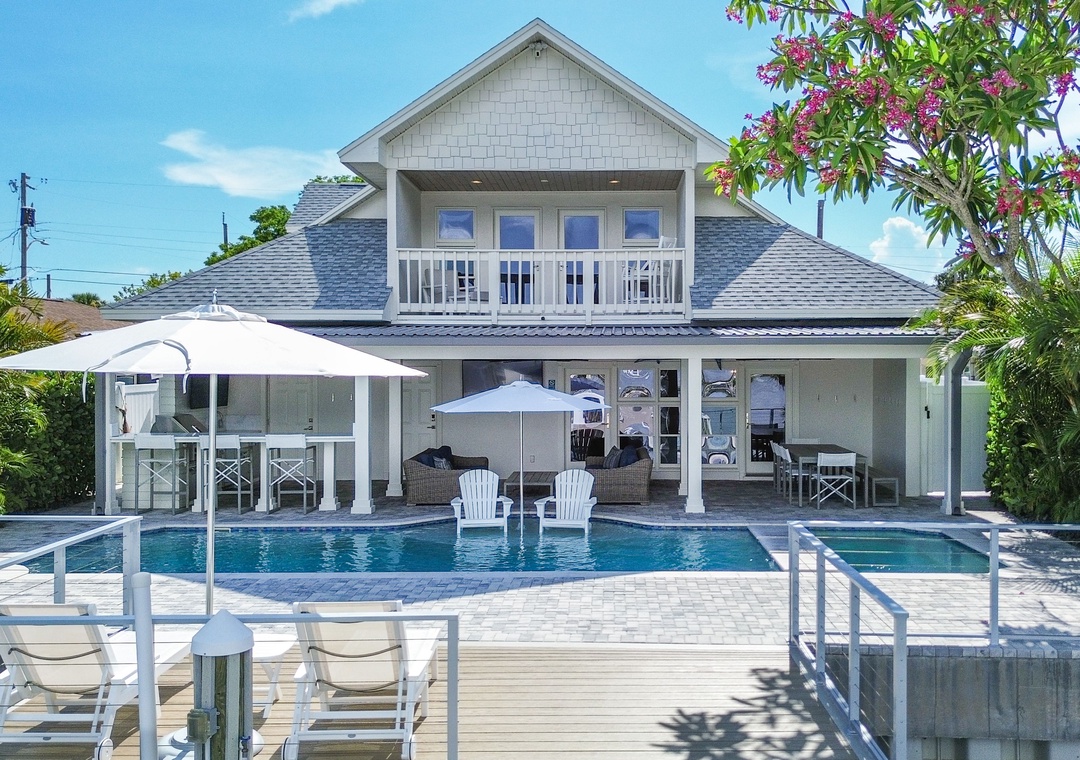 Are you ready for outdoor paradise without leaving? You found it here! The huge, covered deck is perfect for entertaining and relaxation. It features comfortable couches, 2 big screen TVs, a dining table and chairs, and a full outdoor kitchen with a 32” natural-gas grill, double side burner, prep sink, and beverage refrigerator. The deck is adjacent to the refreshing pool and hot tub (not jetted), offering an awesome hangout area. Spend time on the private dock, ideal for sunbathing, fishing, or hopefully seeing the dolphins go by! Football Sunday’s, card games at the table, sunbathing on the deck, a dip in the pool, fish off the dock…..it doesn’t get much better than this!! NOTE: *** The pool and hot tub heat is an additional cost and will not be on without prior set up. We recommend you add pool heat between November and mid April. It is optional. Cost is $35/day for the heat addition****
