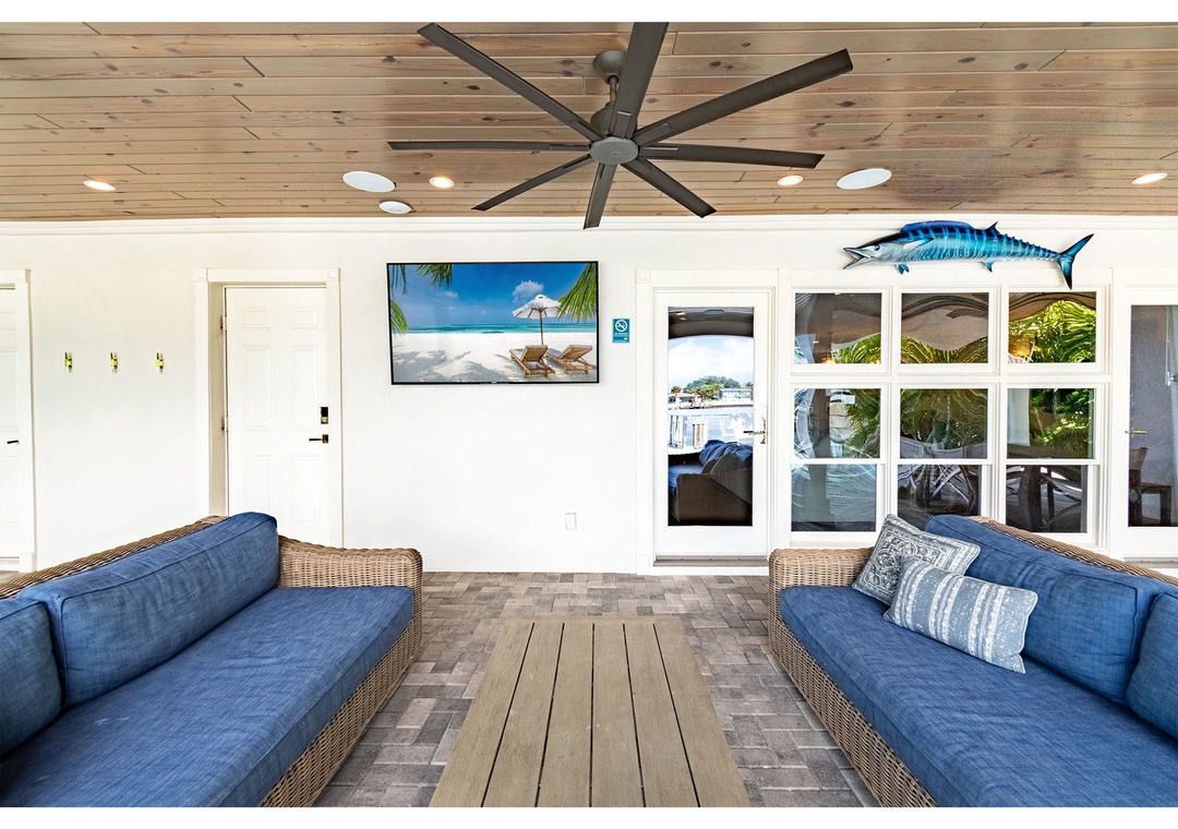 *Covered Outside Deck with Couches, TVs and Dining Table