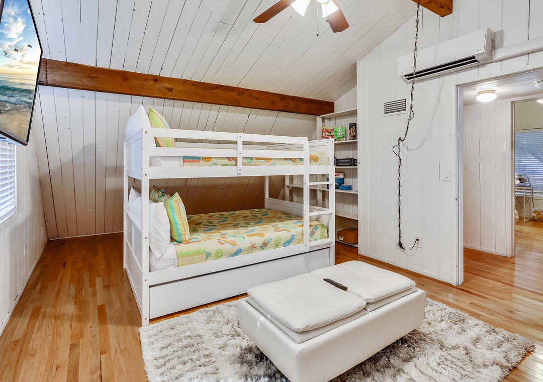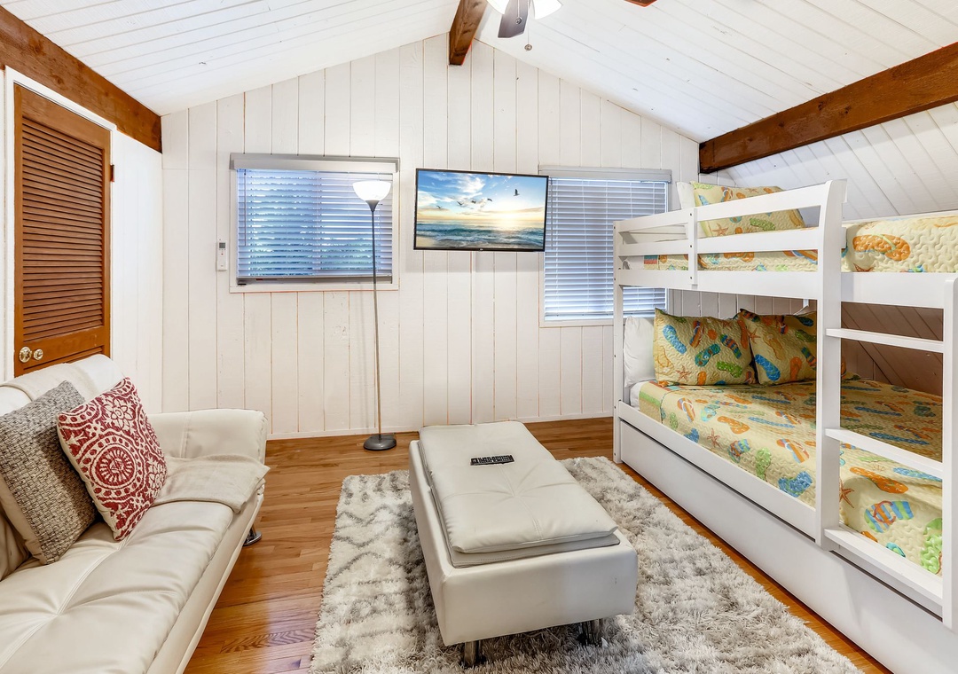 Bedroom 3 – 1 Twin. 1 Trundle bed that is Full size on top and a Twin pullout underneath. There is also a convertible couch that lies flat to a bed in this same room.