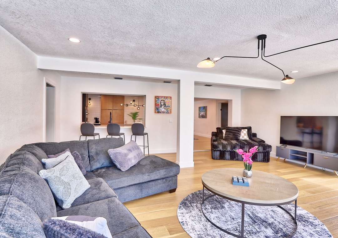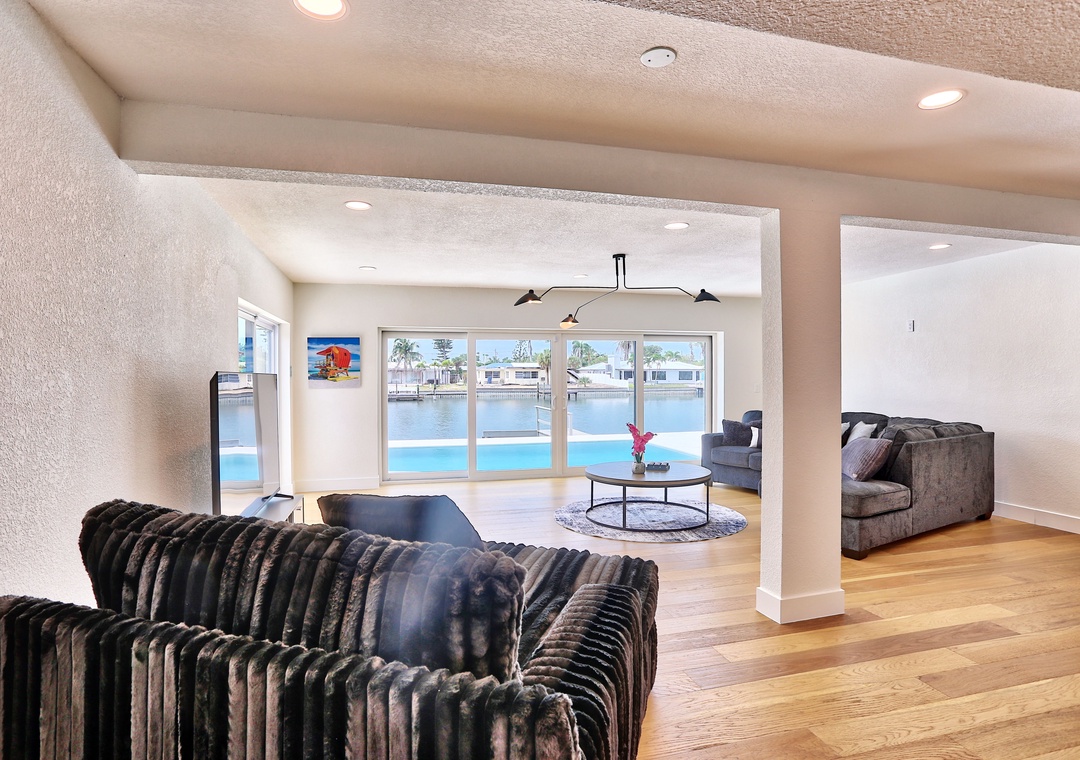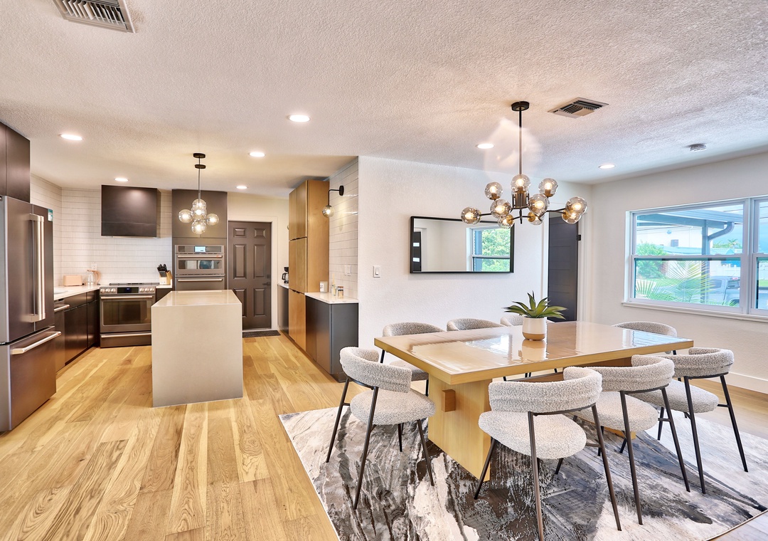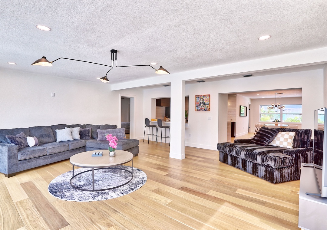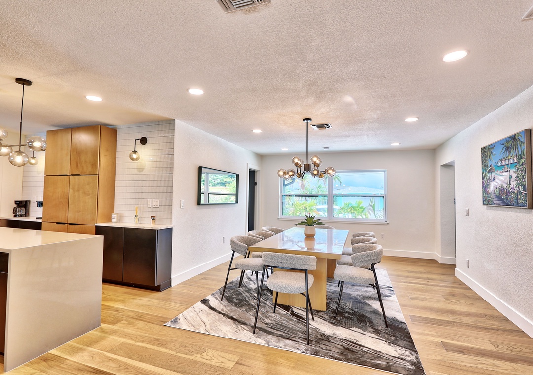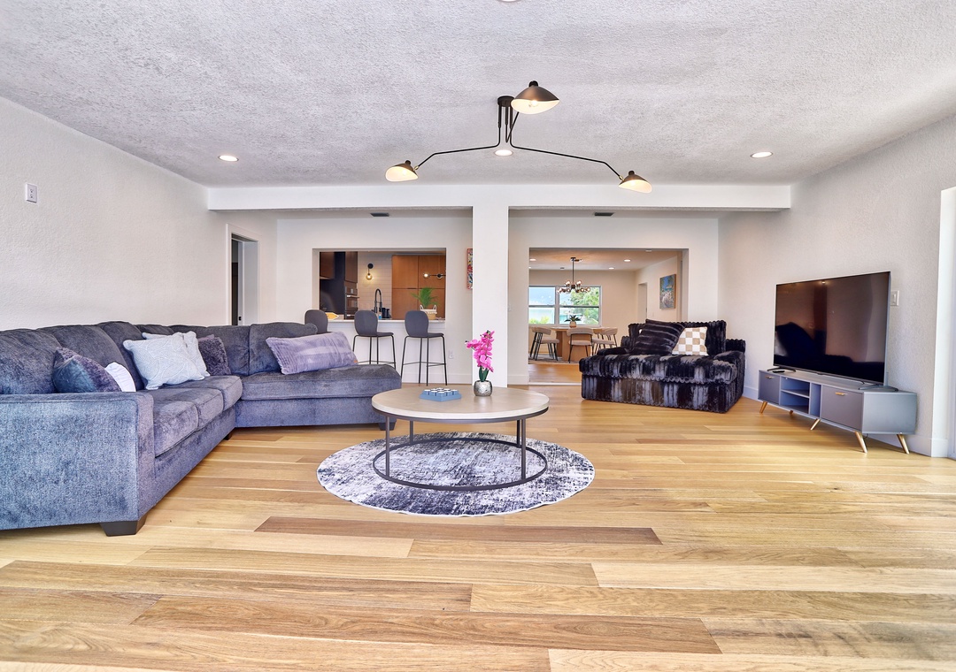 Welcome to Parrots Cove! This spacious, single-level 3-bedroom, 3-full bathroom home offers everything you need for a relaxing and memorable vacation. Inside, you'll find a bright and open living room with oversized, ultra-comfy couches, a large-screen TV, and sliding glass doors that fully open to a stunning outdoor pool deck—bringing the outdoors in. The large dining room table is ideal for shared meals or game nights, while additional stool seating at the kitchen counter keeps everyone connected as meals are prepared. The fully equipped kitchen includes all appliances, cookware, dishes, and utensils to make you feel right at home.