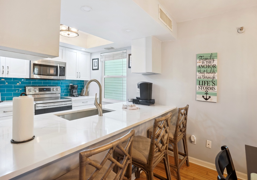 Experience many breathtaking sights of the Gulf of Mexico right from your balcony with Pelican Pointe – a tastefully updated, two-story townhouse. This unique getaway is only steps away from the beach and sits in a modern complex with only 14 other units. From the end of your spiral staircase, you’re only a hop, skip and jump away from the stunning teal waters of the Gulf and many picturesque viewpoints. Enjoy a home away from home with plenty of sun and sand at your fingertips. Located on the west coast of Florida, Pelican Pointe offers many amenities to completely satisfy your stay. The main level of the home features a fully equipped, all new kitchen to cook a delicious feast for the family, and a glass sliding door connects the spacious living/dining area to gulf views and beach side living. The large balcony area with comfortable new outdoor furniture allows you to privately soak in the sun and even enjoy meals close to the water’s edge.