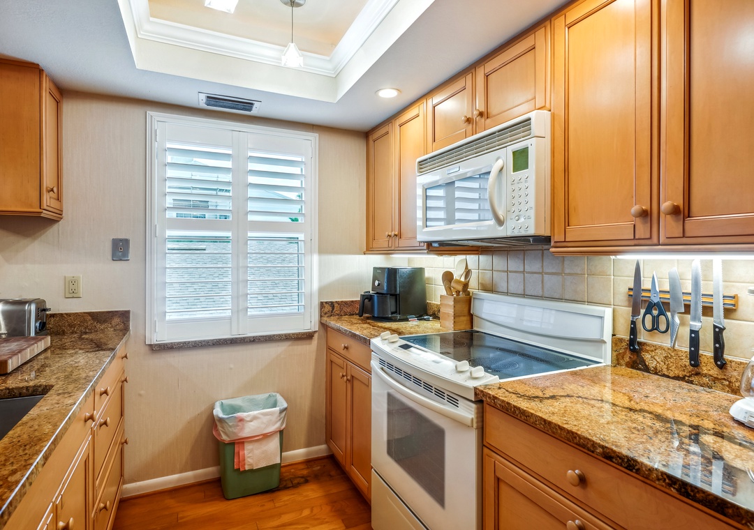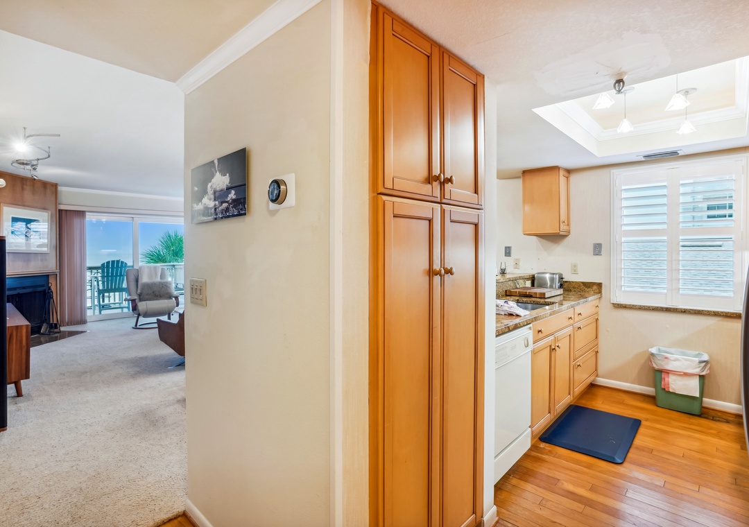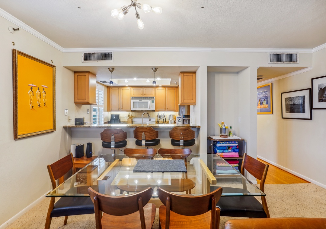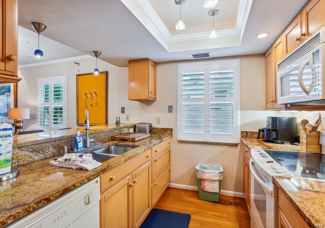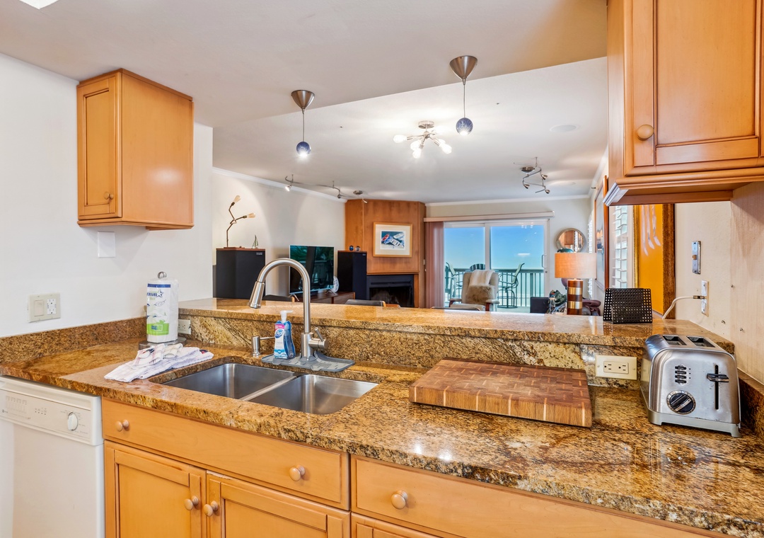 After a long day of adventure enjoy the spacious living area which has plenty of plush seating and generous views of the gulf. Extending your indoor living space outdoors is your private balcony, which overlooks the Gulf of Mexico—a great spot for conversation, watching the gorgeous gulf sunsets, and making long lasting memories. The dining table has enough space for six people plus three more at the breakfast bar. The fully functional kitchen has beautiful granite countertops, and an array of cooking amenities for your daily use.