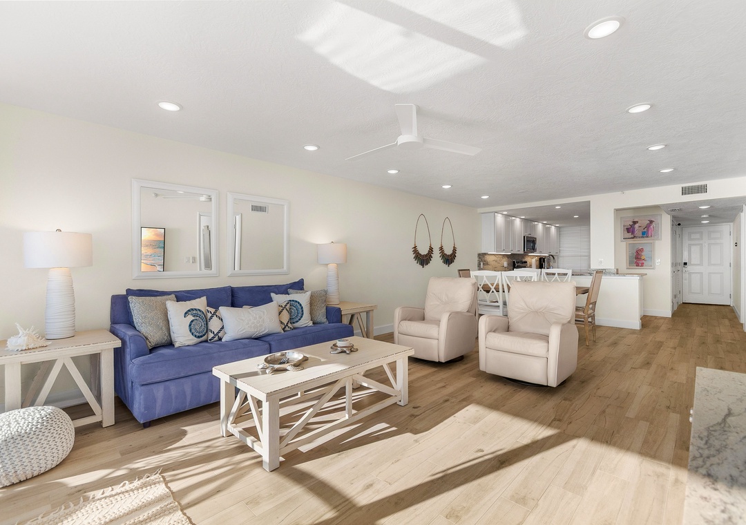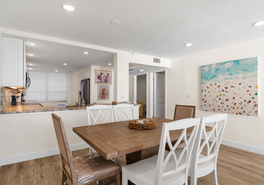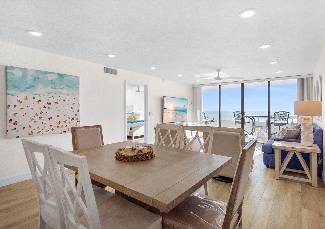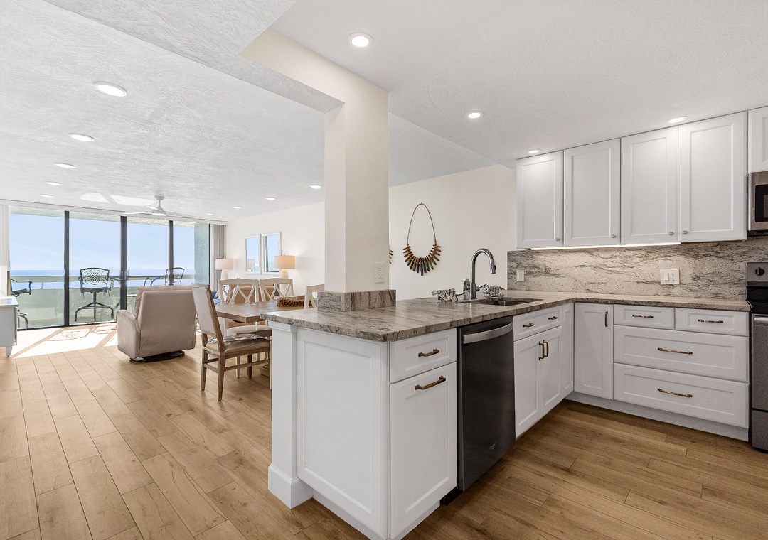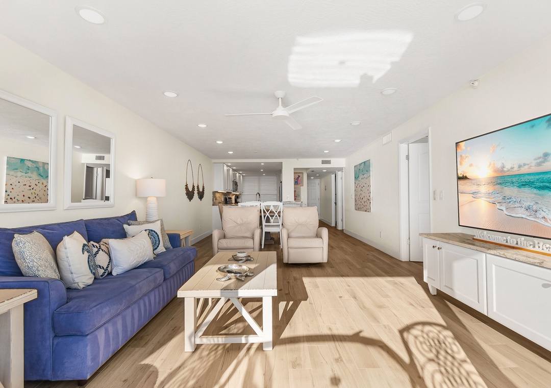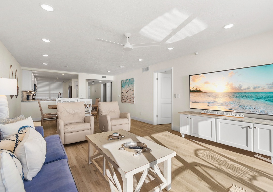 This spacious, bright retreat is filled with natural light and designed for comfort. The inviting living room features a cozy sofa, two sitting chairs, a large smart TV, and direct access to the private balcony. The open layout flows seamlessly into the dining area—set for six—and the nicely updated kitchen, complete with stunning countertops, stylish backsplash, newer stainless-steel appliances, and a fully stocked selection of dishes, cookware, and utensils to create delicious meals.