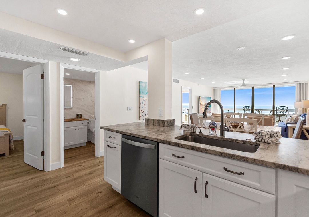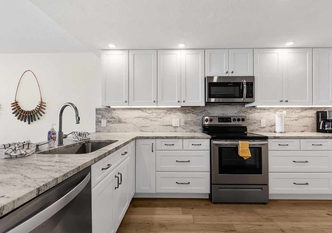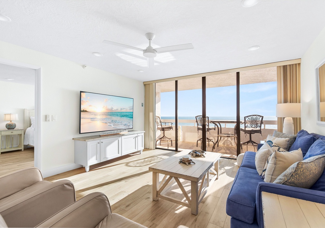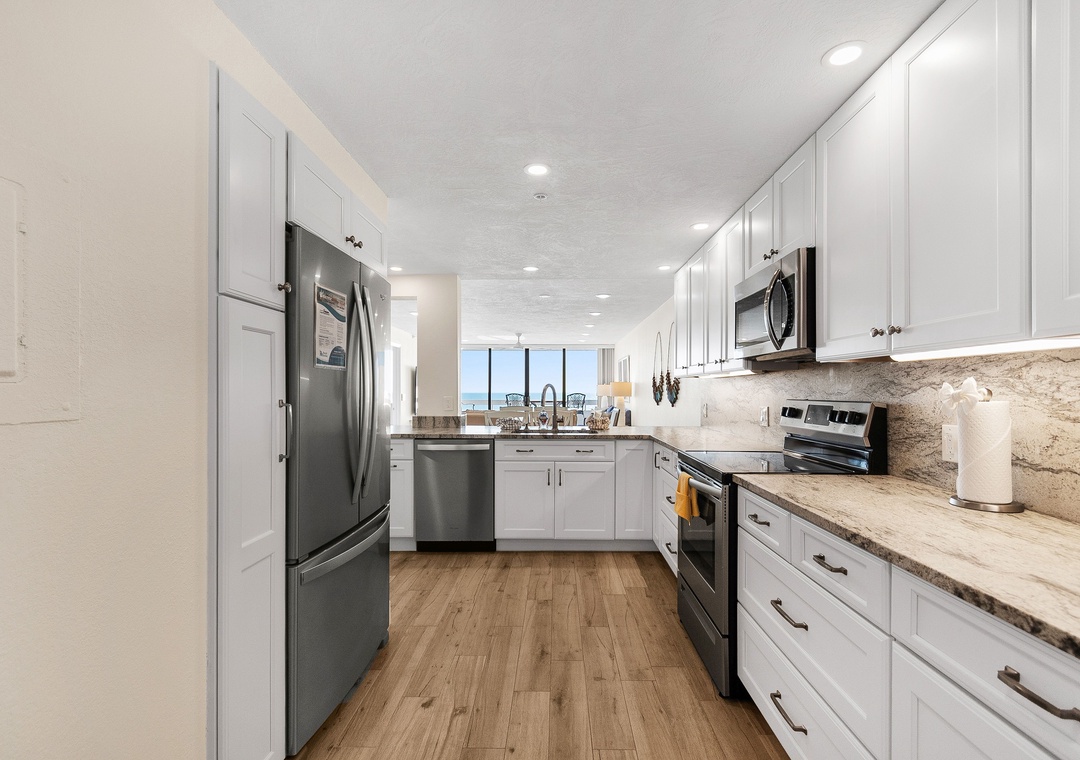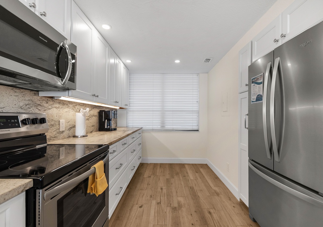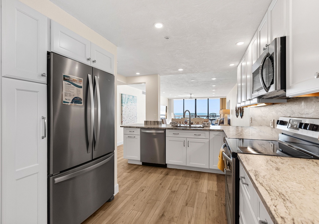 This spacious, bright retreat is filled with natural light and designed for comfort. The inviting living room features a cozy sofa, two sitting chairs, a large smart TV, and direct access to the private balcony. The open layout flows seamlessly into the dining area—set for six—and the nicely updated kitchen, complete with stunning countertops, stylish backsplash, newer stainless-steel appliances, and a fully stocked selection of dishes, cookware, and utensils to create delicious meals.