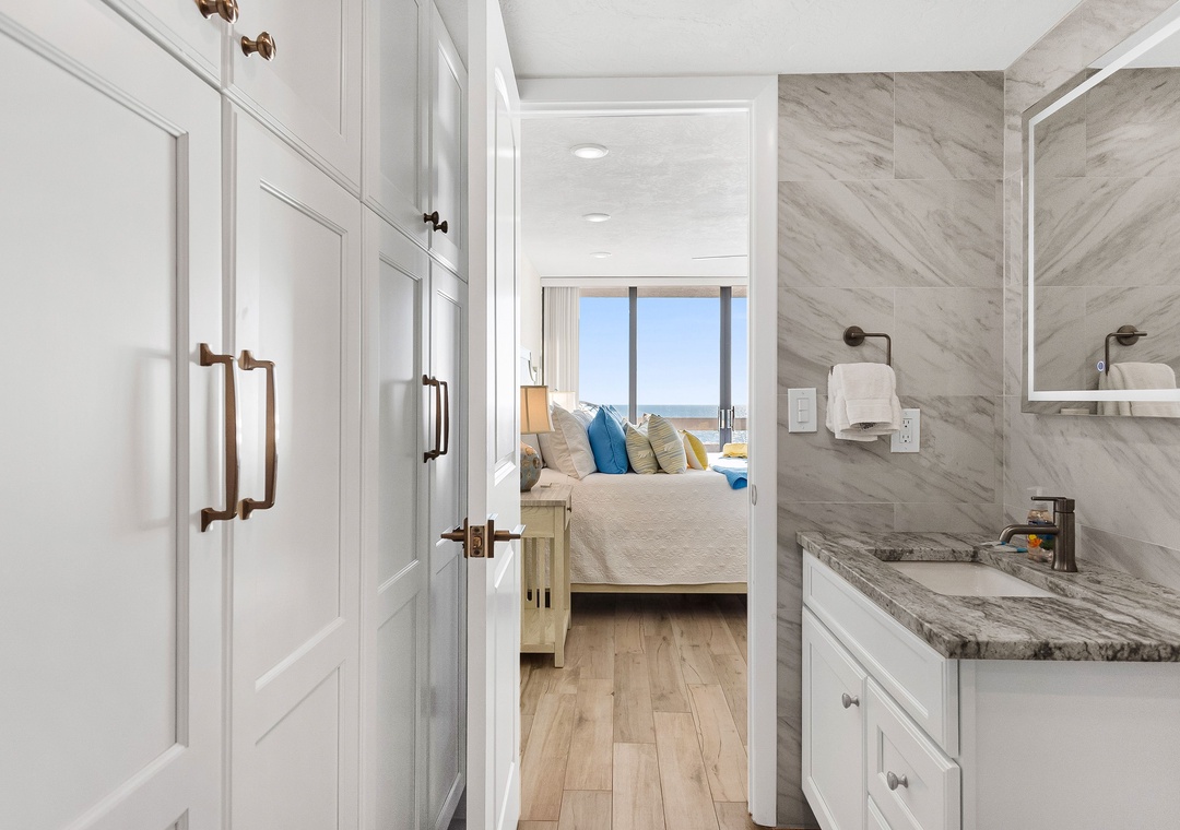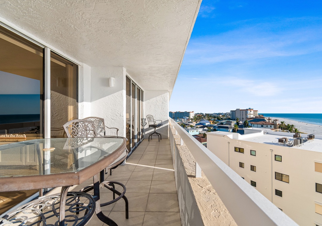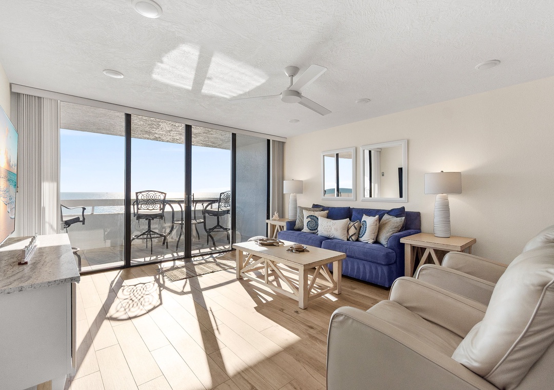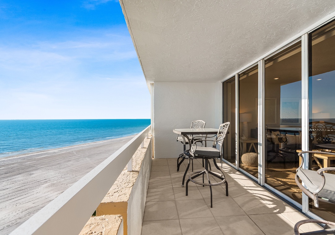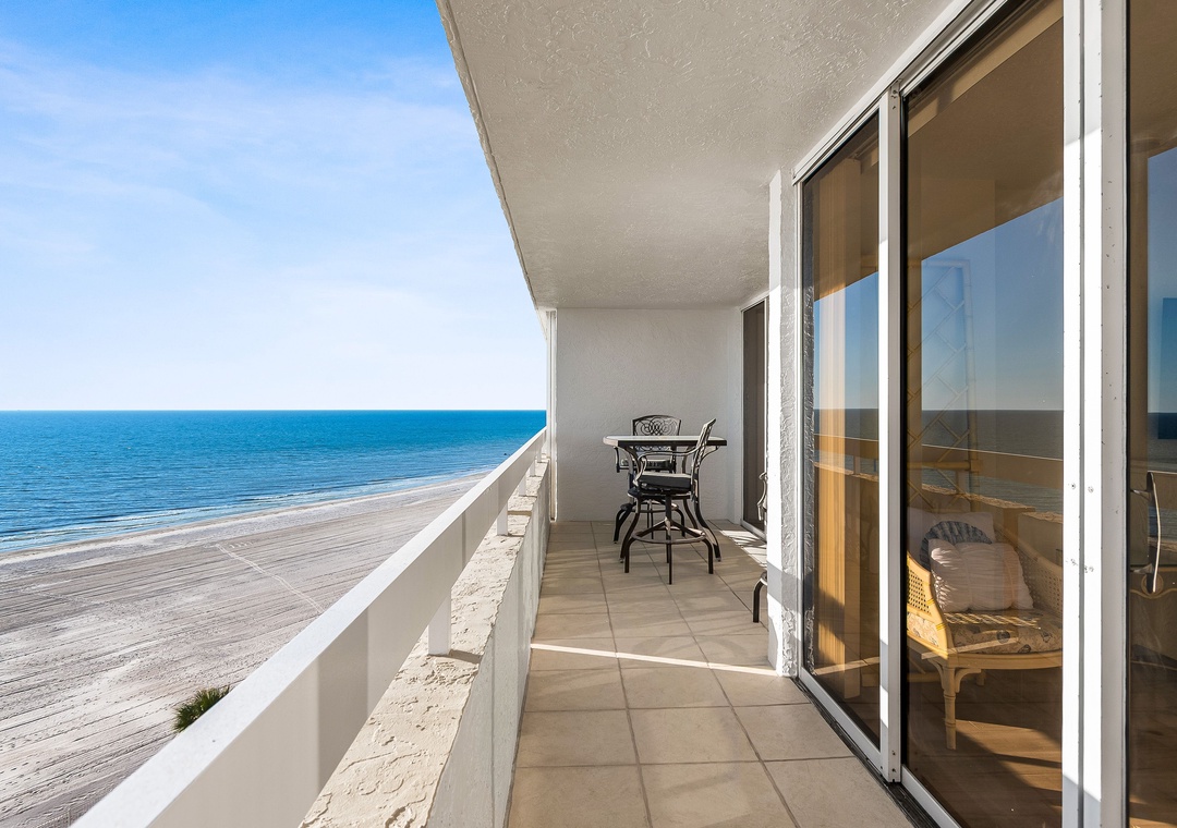 Step outside to the private balcony stretching along the living room and master bedroom. Relax at the table and chairs while enjoying direct Gulf views, watching beachgoers during the day, and taking in breathtaking sunsets every evening—the perfect setting for your beachfront escape.