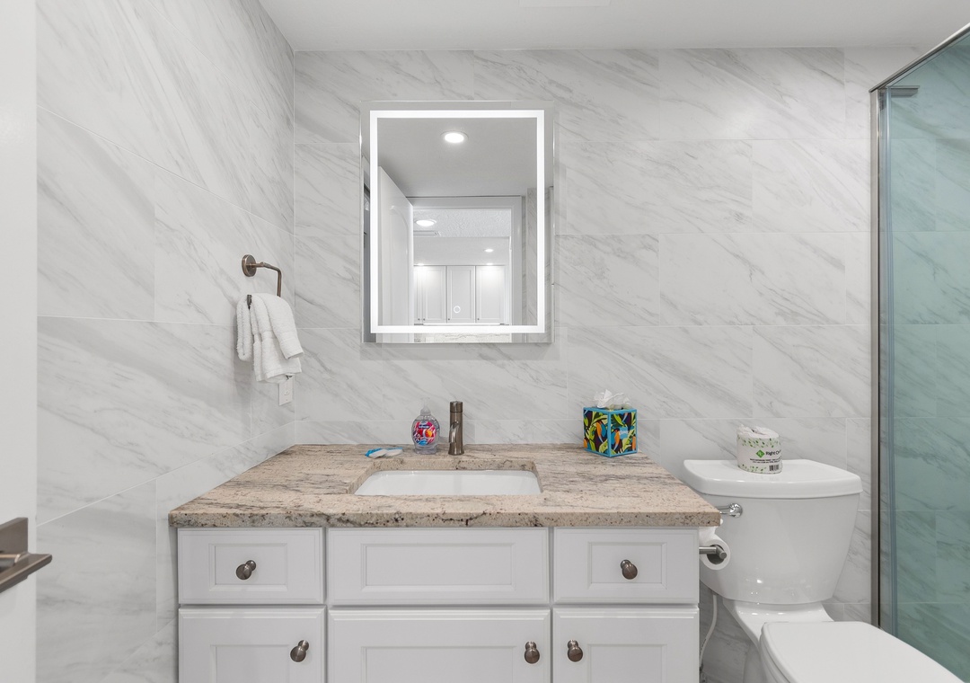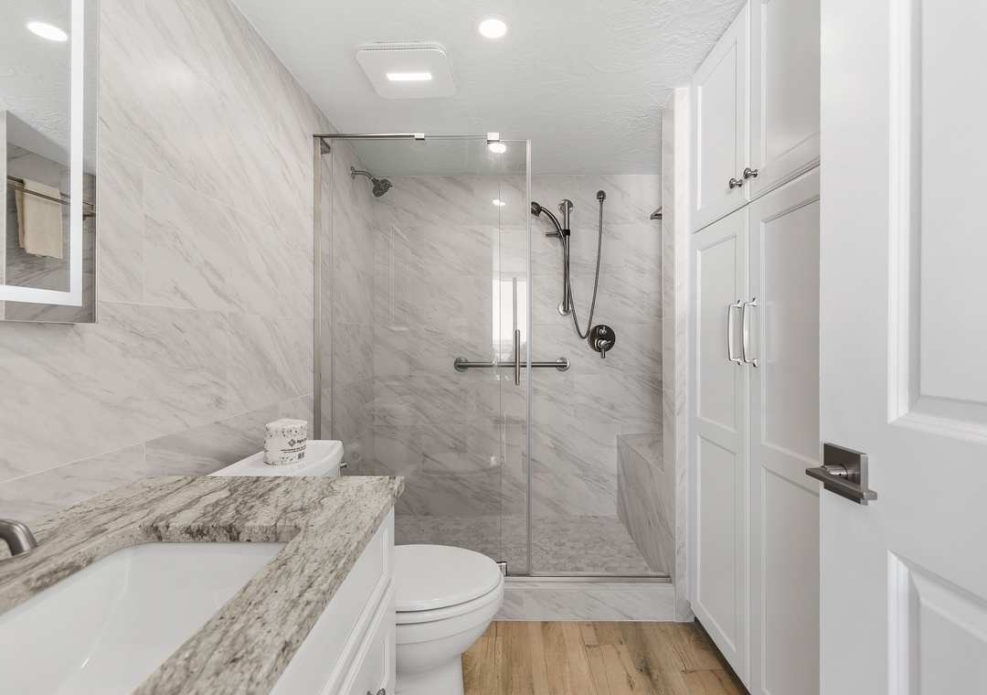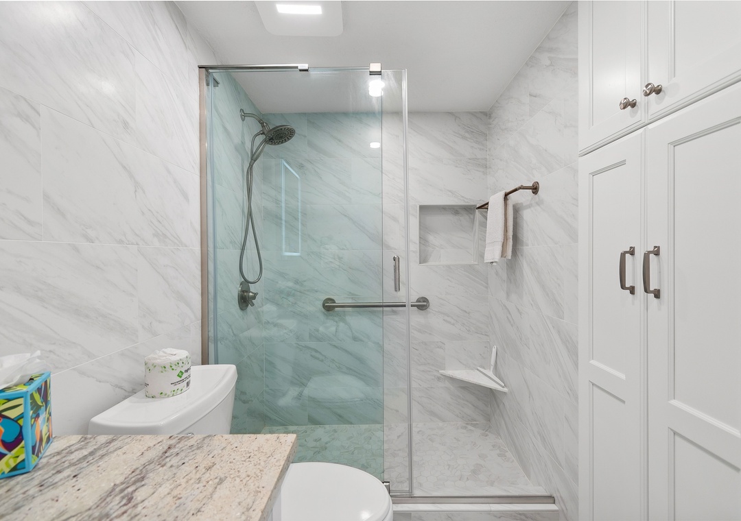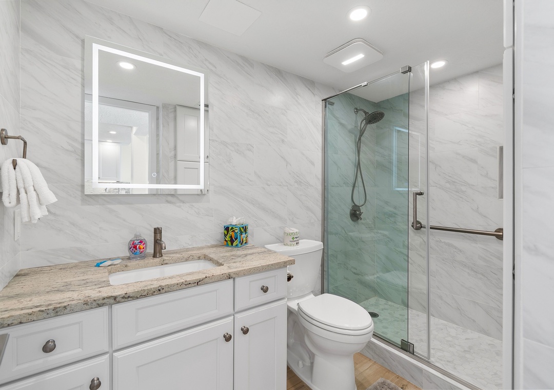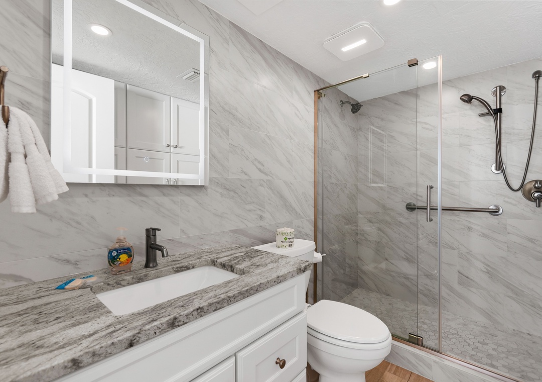 The large master bedroom offers a king bed, smart TV, balcony access, and an attached, beautifully updated bathroom with elegant tile work and a roomy walk-in shower. The guest bedroom includes two double beds and a smart TV, while the guest bathroom is equally updated with impressive tile details and another spacious walk-in shower.