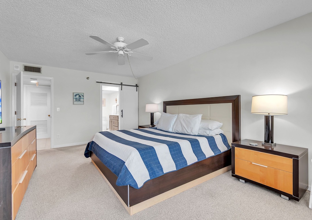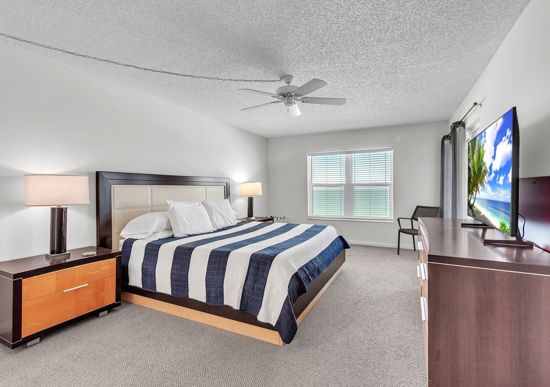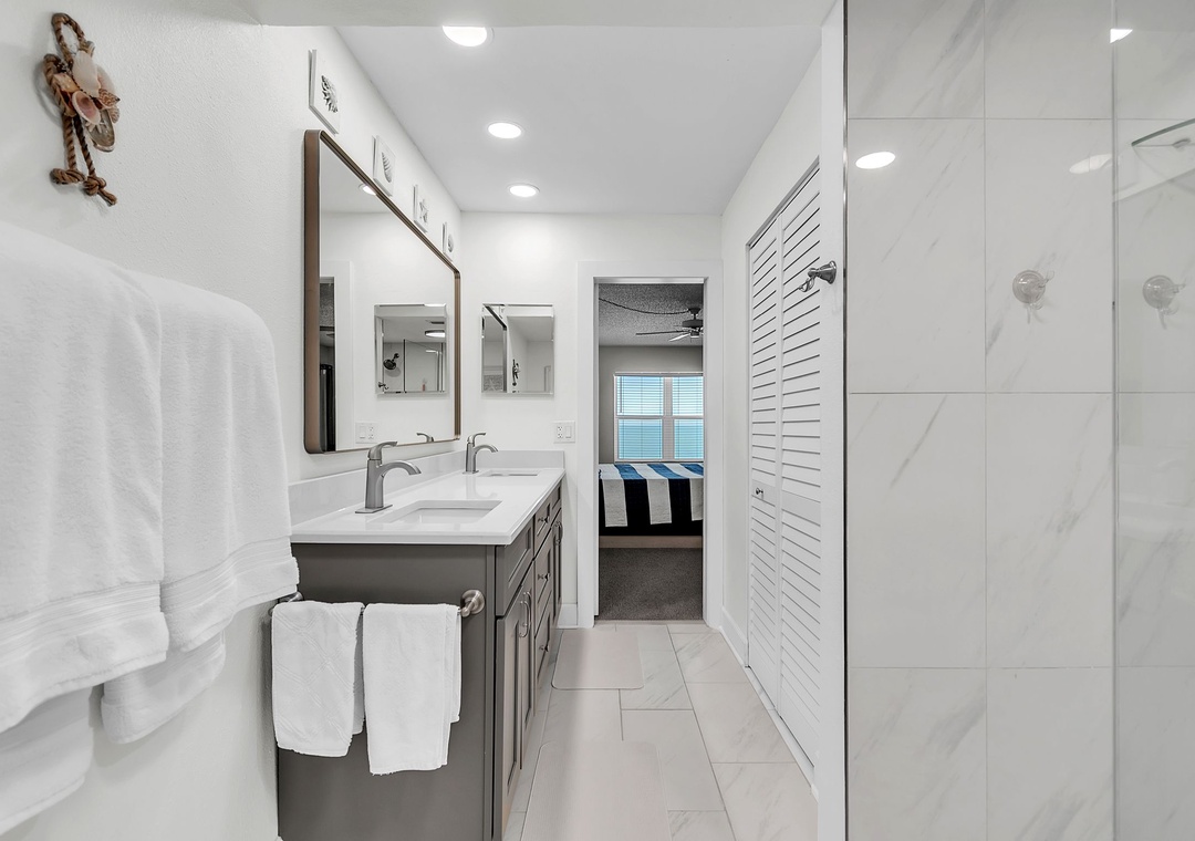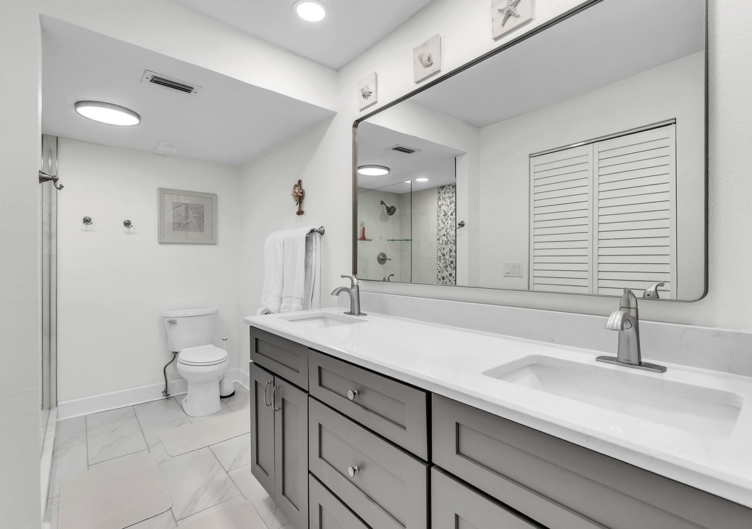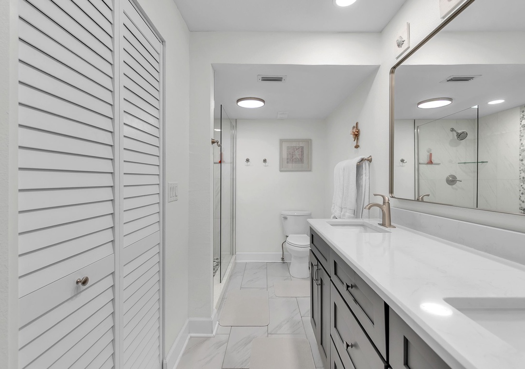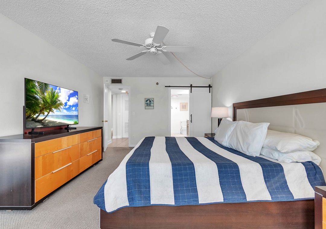 The master bedroom includes a king bed, new large SmartTV, private updated bathroom with dual sinks and a large walk-in tiled shower, and balcony access, while the guest bedroom features a queen bed, TV, and easy access to the updated guest bath with a tub/shower combo. You will also find a washer and dryer in the condo for your private use.