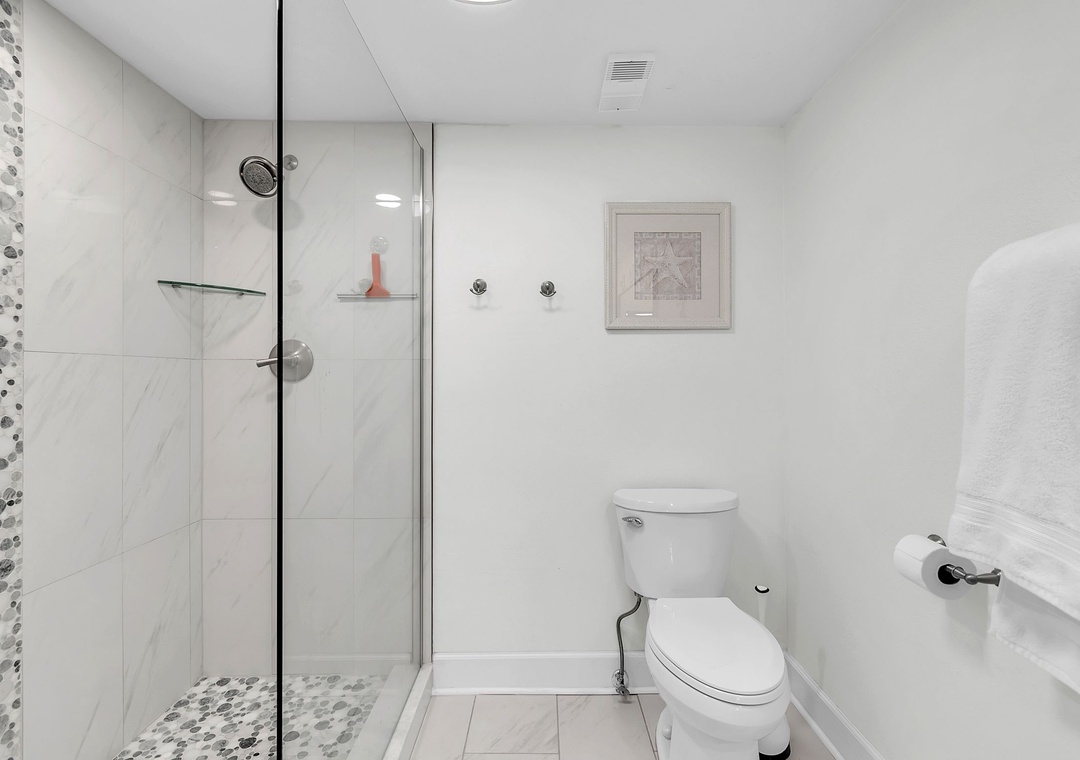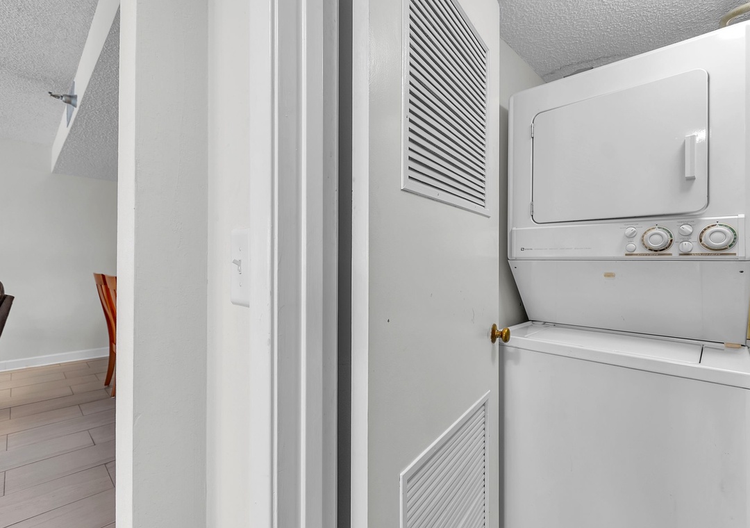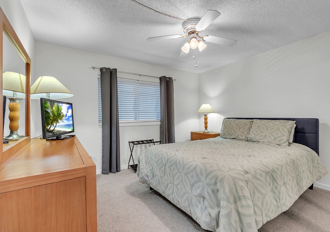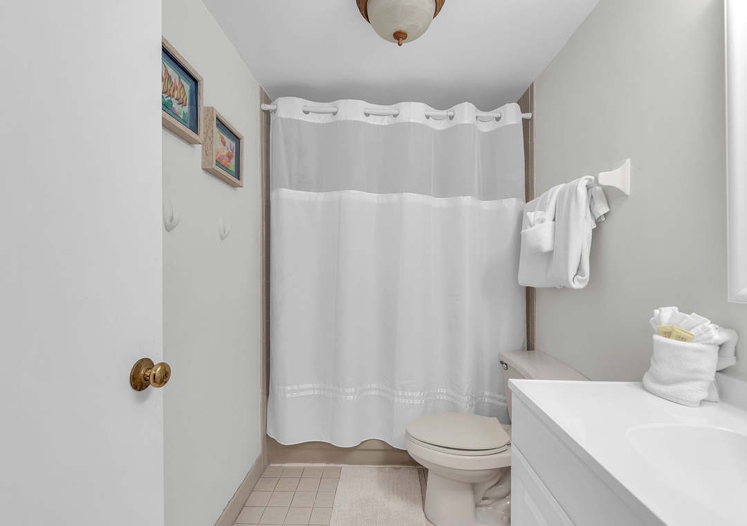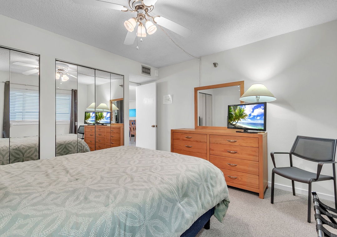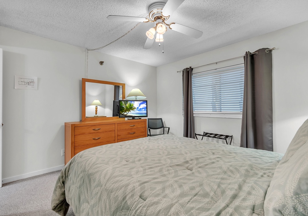 The master bedroom includes a king bed, new large SmartTV, private updated bathroom with dual sinks and a large walk-in tiled shower, and balcony access, while the guest bedroom features a queen bed, TV, and easy access to the updated guest bath with a tub/shower combo. You will also find a washer and dryer in the condo for your private use.