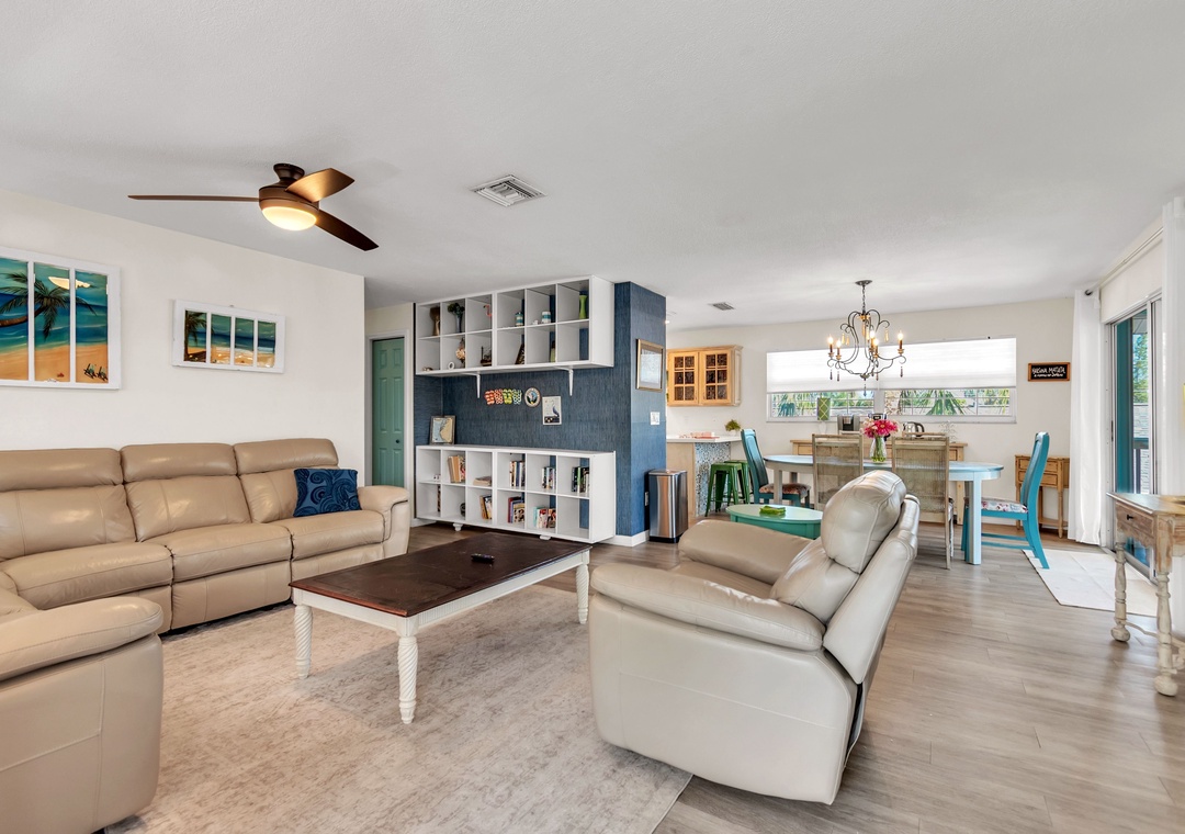 This beautiful home features three bedrooms including a King, Queen, and two Twin beds, along with two full bathrooms, ensuring comfort and convenience for all guests. The open floor plan is designed for relaxation and entertainment, featuring a bright and airy living space with a plush leather recliner sectional sofa, rocking/recliner chair, and a 55" Roku Smart TV with streaming apps for your enjoyment. The dining area overlooks the expansive covered porch and comfortably seats six, with additional seating for two at the breakfast bar. The fully stocked kitchen boasts an array of cookware, bakeware, and appliances including a mixer, blender, food processor, toaster, and kettle, making meal preparation a breeze. Each bedroom is thoughtfully furnished for your comfort, with Roku-enabled flat-screen TVs, plush bedding, and ample storage space. The master bedroom features a luxurious King bed with gel-infused memory foam mattress, a private en suite bathroom, and access to a covered rear deck for added relaxation. The backyard oasis is fully enclosed and offers a hot tub, wood burning fire pit, and a play area, perfect for outdoor gatherings and leisure activities. The garage is stocked with beach items to enhance your beach experience.