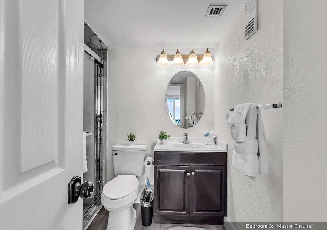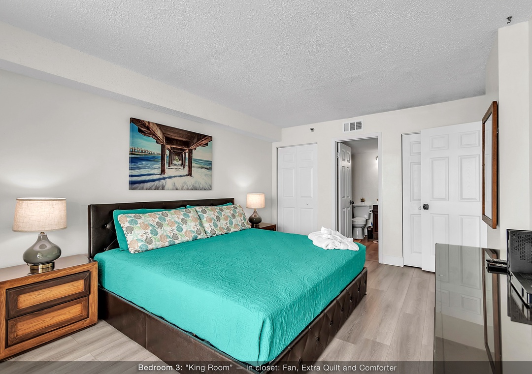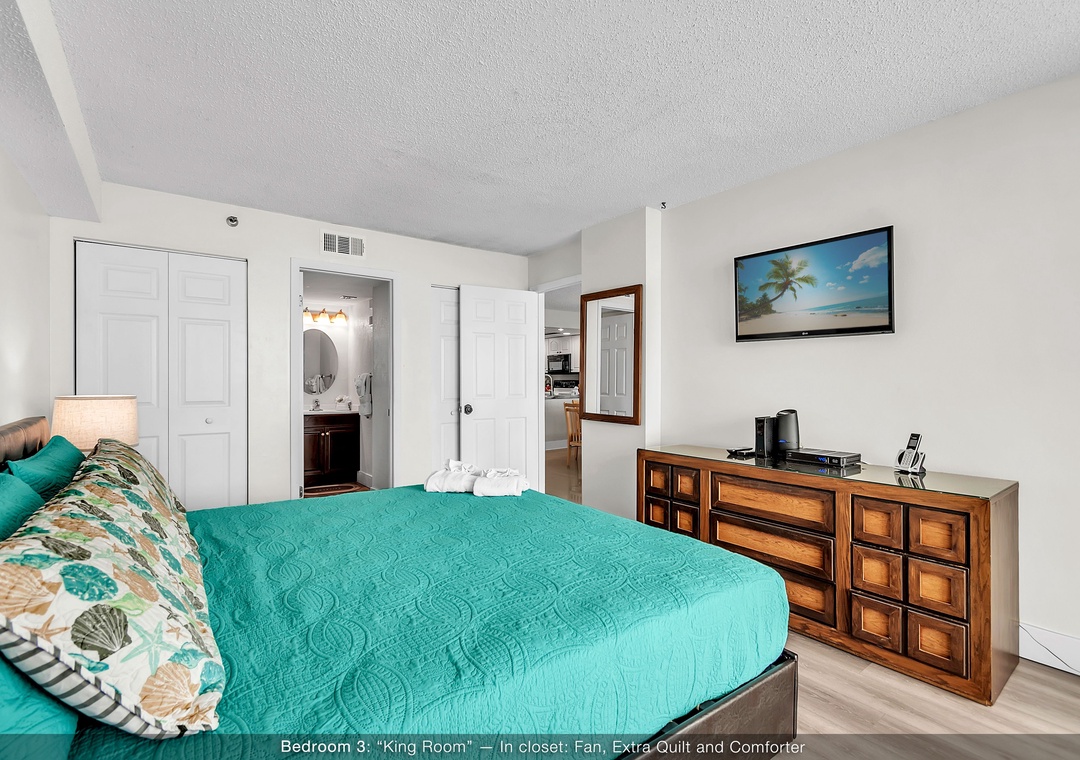 Master Bedroom – own private walkout to the balcony; new modern platform king bed with cooling gel memory foam mattress, ensuite walk-in shower, smart cable TV, room for clothes whether a weeks stay or longer
