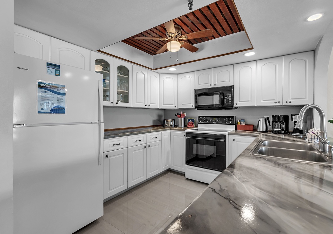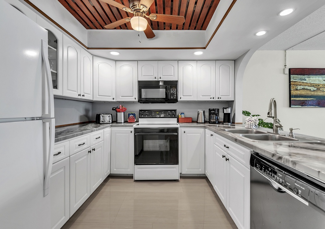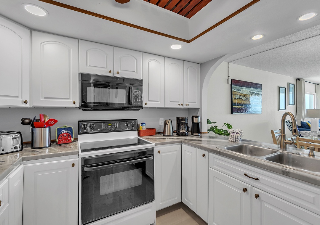 Open concept kitchen – ample counter space, fully equipped including drip coffee and pod 2 in 1 maker for hot and cold drinks. Overlooks dining and living to stay connected.