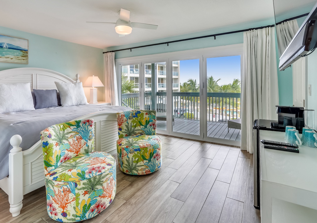 Bedroom 1 - 1 King sized bed, balcony access, 60” Smart TV and refrigerator