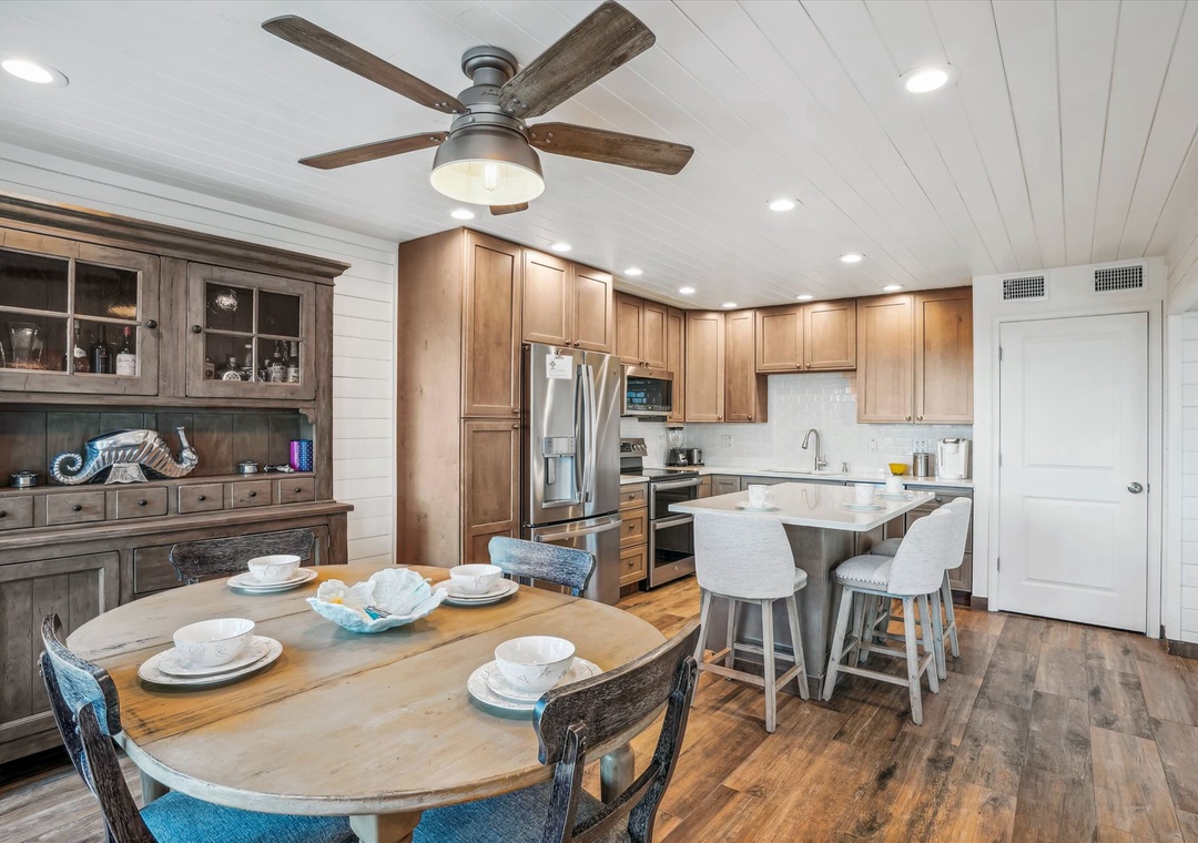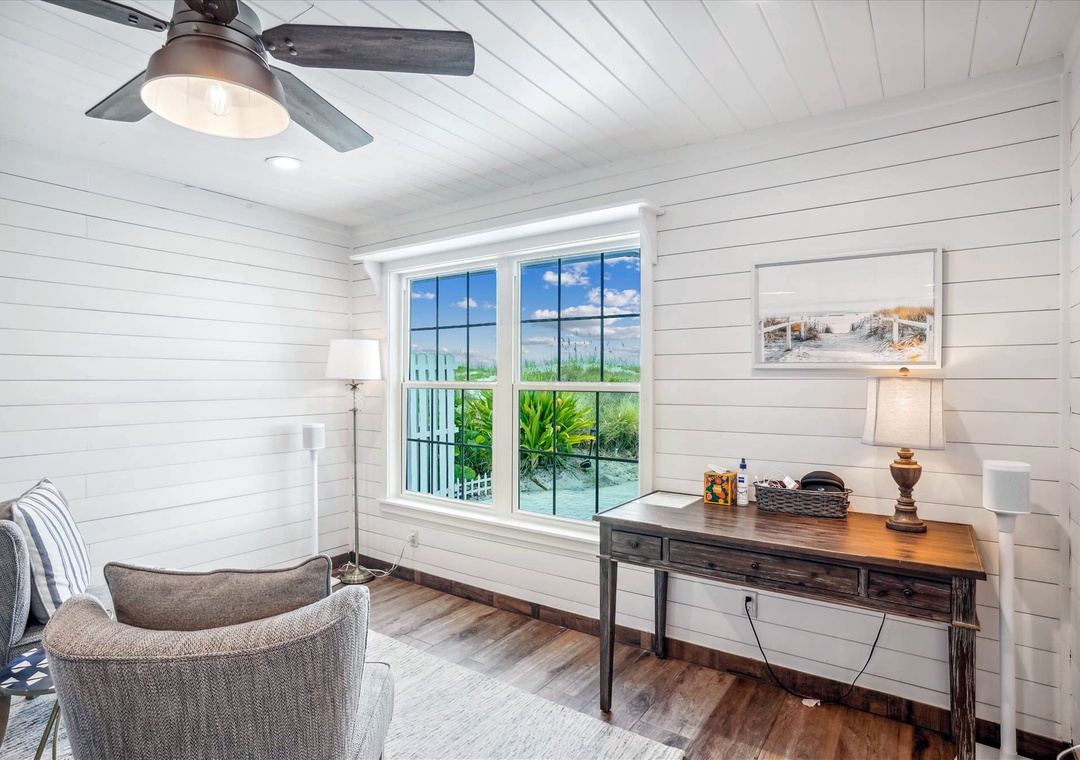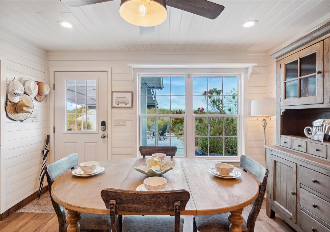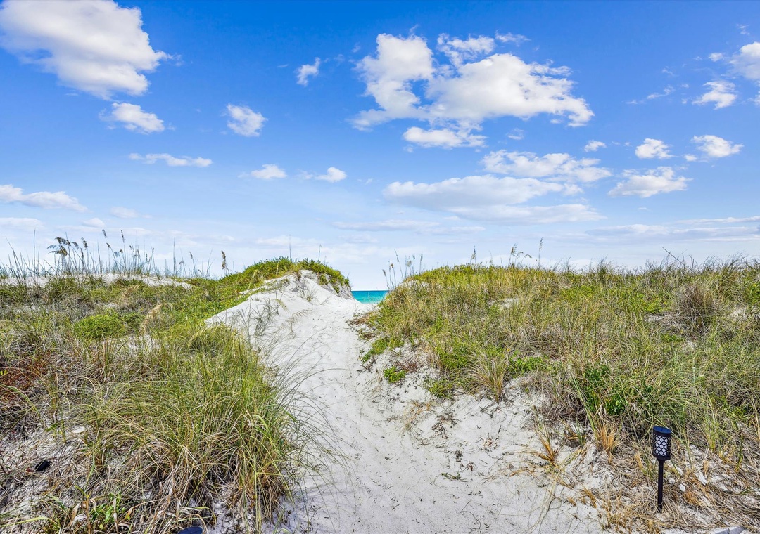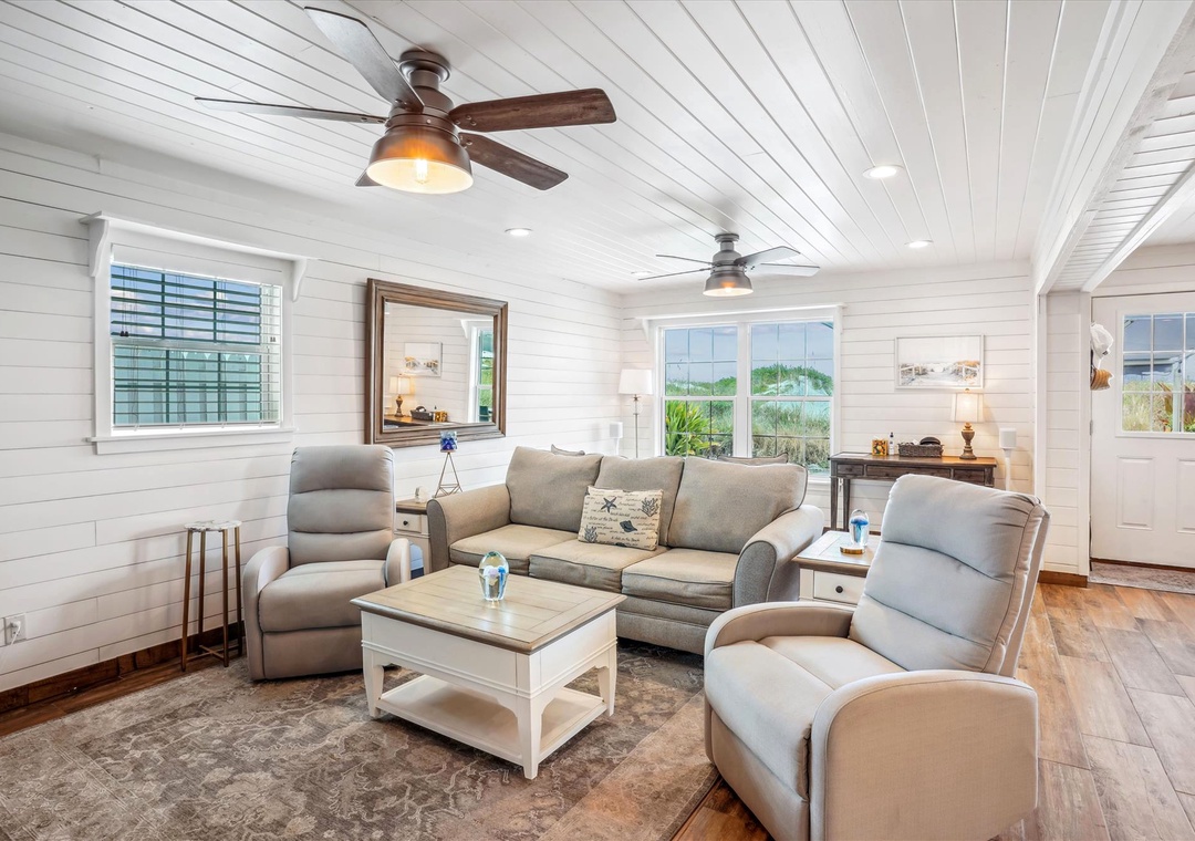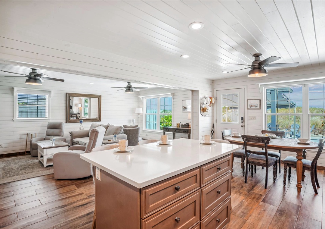 Enjoy a much-deserved beach vacation at this dreamy coastal retreat. This beautiful, family-friendly, beach house features quartz countertops, stainless steel appliances, plenty of seating for dining, free WiFi, and a flatscreen TV in each bedroom. Be sure to take advantage of the outdoor oasis and enjoy a favorite beverage in the sunshine while listening to the waves crash against the shore in the distance. The main living space in this charming beach house is decorated with soft colors and cozy furnishings. There is comfortable seating and a large flat screen tv located in the living room. Just off the living area is the spacious kitchen with an island. The kitchen has new appliances and is fully stocked with all the pots, pans, cooking utensils, plates, and glassware you'll need to make yourself at home. There is also convenient beach storage located outside of the home where you can store all your beach necessities at night.