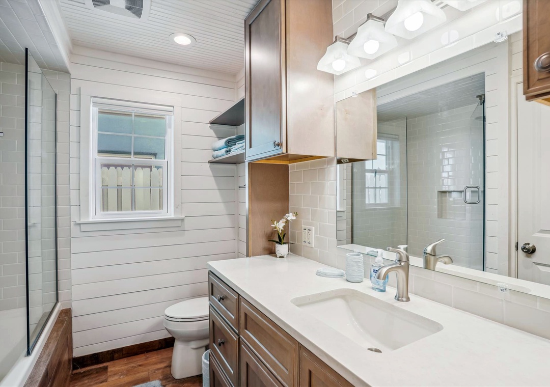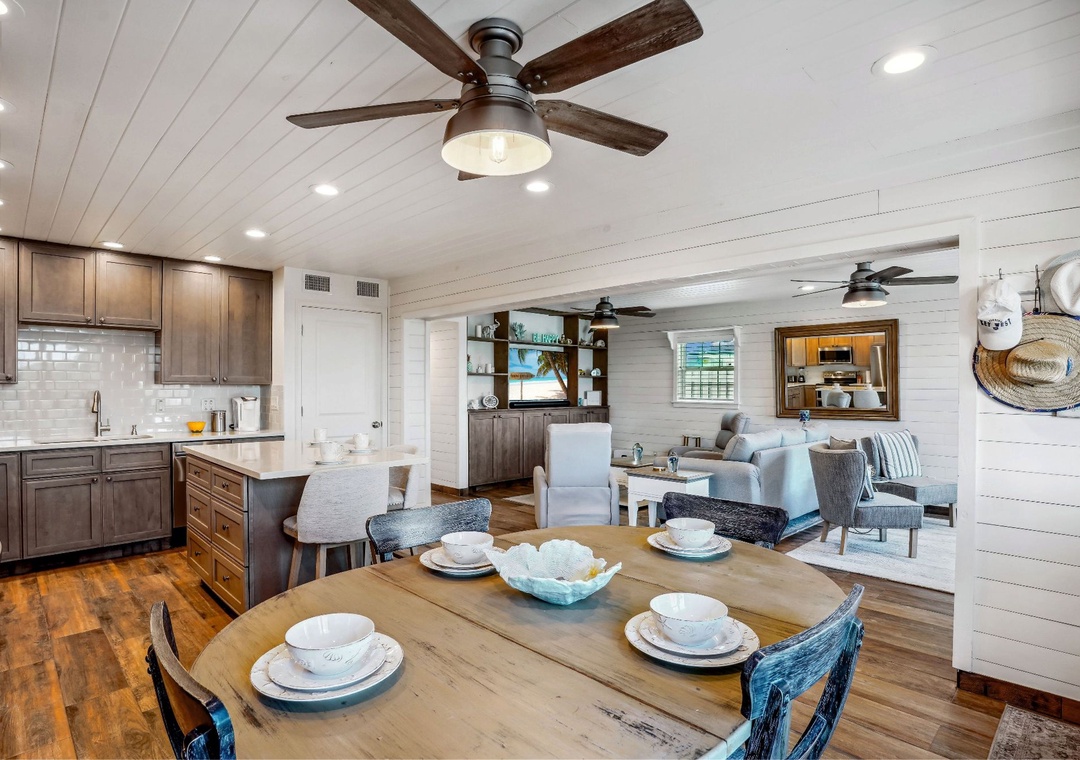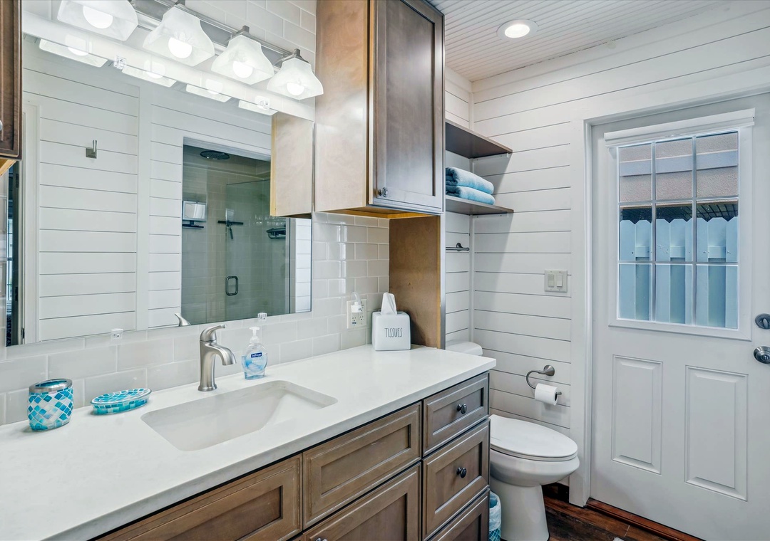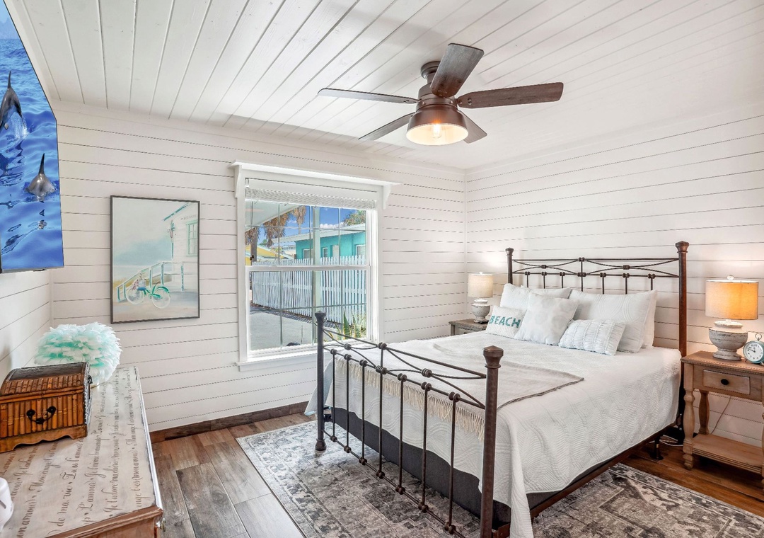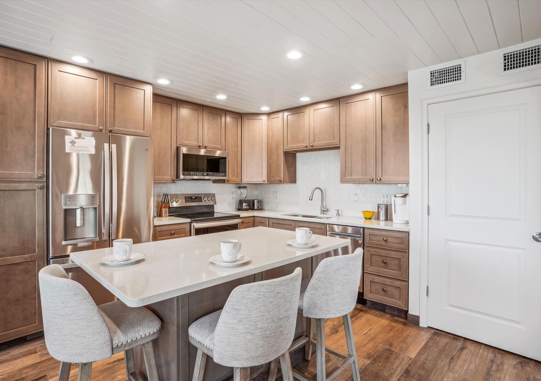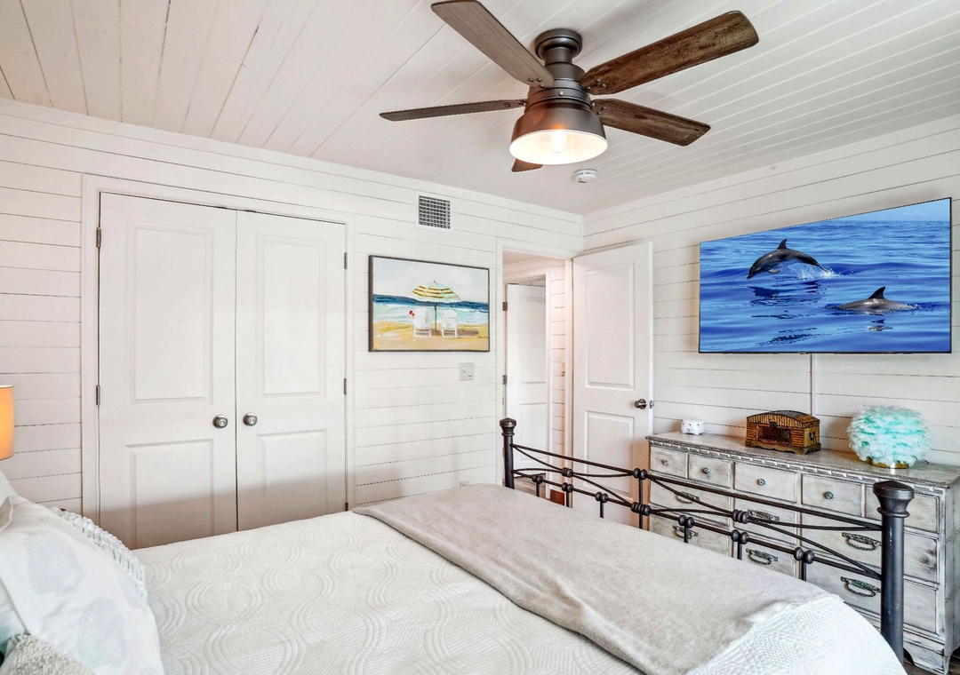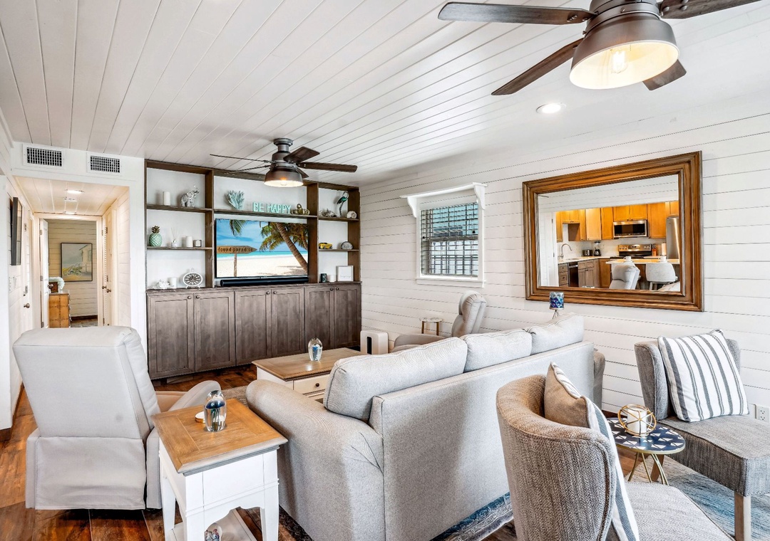 Enjoy a much-deserved beach vacation at this dreamy coastal retreat. This beautiful, family-friendly, beach house features quartz countertops, stainless steel appliances, plenty of seating for dining, free WiFi, and a flatscreen TV in each bedroom. Be sure to take advantage of the outdoor oasis and enjoy a favorite beverage in the sunshine while listening to the waves crash against the shore in the distance. The main living space in this charming beach house is decorated with soft colors and cozy furnishings. There is comfortable seating and a large flat screen tv located in the living room. Just off the living area is the spacious kitchen with an island. The kitchen has new appliances and is fully stocked with all the pots, pans, cooking utensils, plates, and glassware you'll need to make yourself at home. There is also convenient beach storage located outside of the home where you can store all your beach necessities at night.