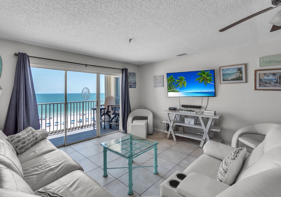 The open living room features a roomy couch with built-in recliners, USB chargers and cup holders, a big-screen TV, and direct access to the balcony. The private west-facing balcony is the perfect place to enjoy our morning coffee, breathtaking sunsets every evening and just watching the beach’s action unfold throughout the day.
