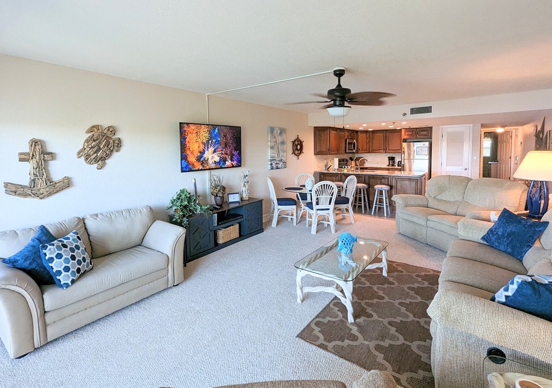 This charming one-bedroom, one-bathroom condo has everything you need to feel right at home. The full kitchen is a chef's delight, featuring upgraded cabinets and countertops, making meal prep a breeze. The living area offers comfortable Lazy Boy seating, perfect for unwinding after a day of fun. The bedroom is equipped with blackout curtains for those mornings when you just want to sleep in, ensuring a restful stay.