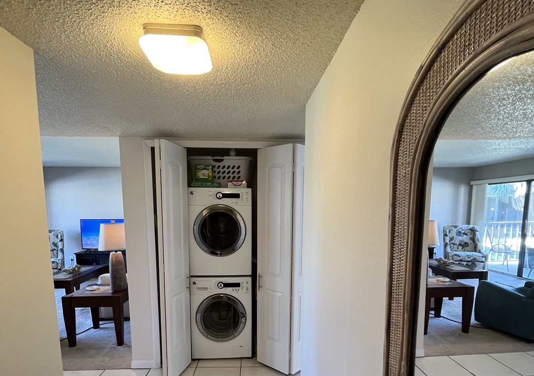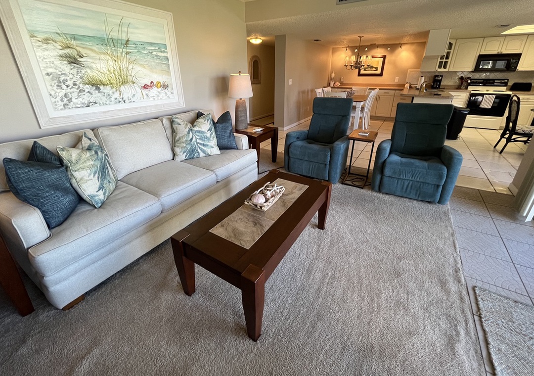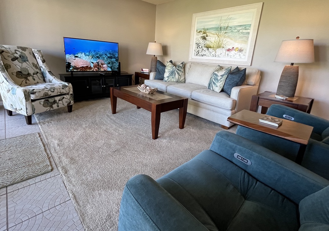 The bedroom is furnished with a queen-size bed, providing a restful retreat after a day of sun and fun. The large living room offers two electric reclining chairs, adding an extra level of comfort for those quiet moments. For added convenience, a mid-size washer and dryer are available inside the condo, so you can easily freshen up your clothes during your stay.