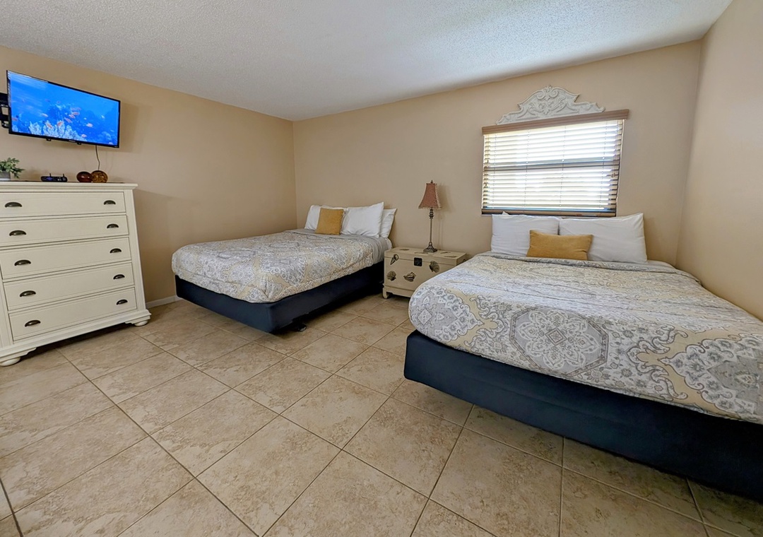 The bedroom is furnished with two queen-size beds, making it ideal for up to four guests. It also features a Roku-enabled TV with premium cable channels for your entertainment. The condo also includes an additional vanity for extra convenience.