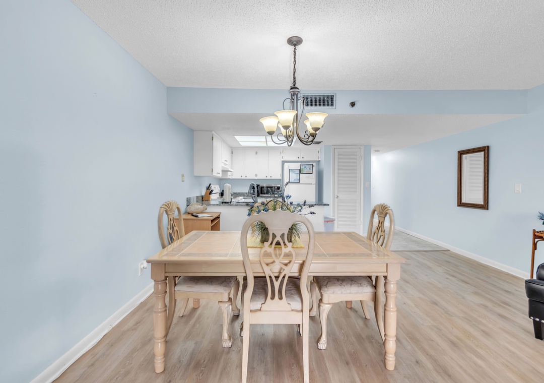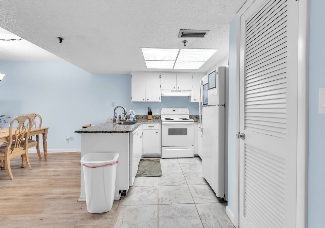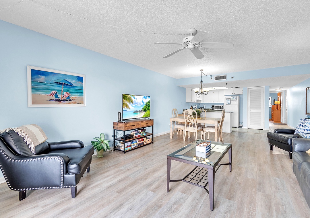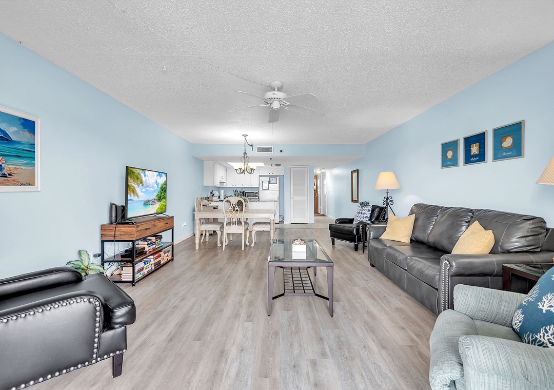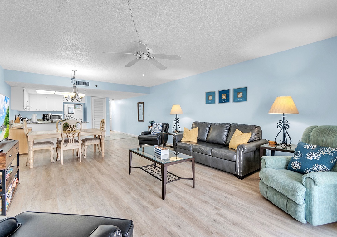 Gone Coastal is designed to provide everything you need for a relaxing stay. The fully equipped kitchen features all the necessary dishes, utensils, and small appliances, allowing you to prepare meals at your convenience. The dining area comfortably seats up to four people, and the leather living room set includes a sofa sleeper for extra guests. Enjoy a flat-screen TV with premium cable channels and stay connected with Wi-Fi throughout the condo. For those needing to work remotely, there is also a desk available.