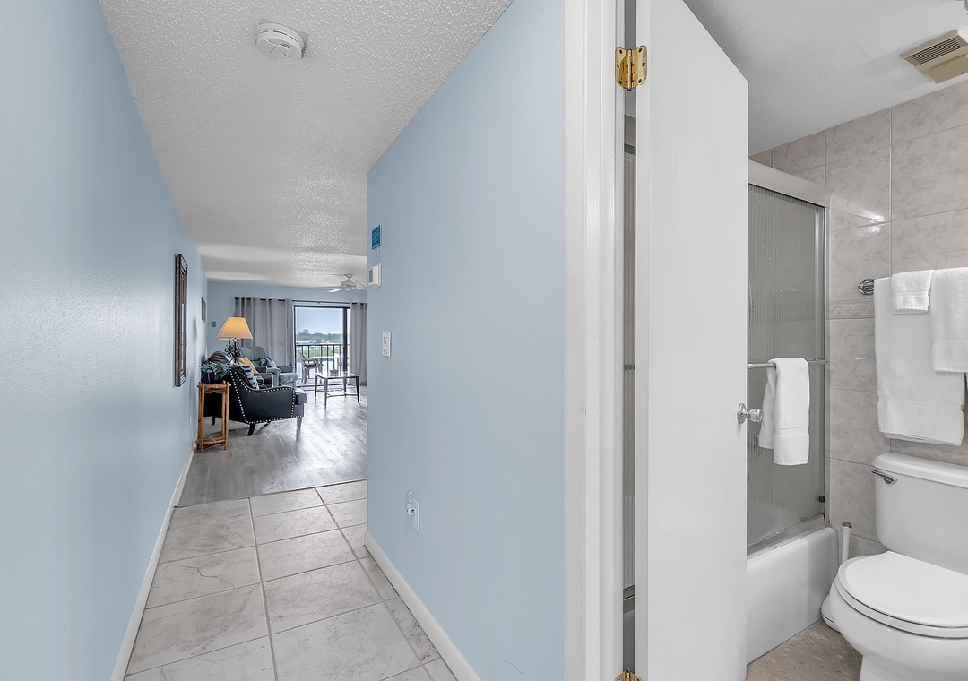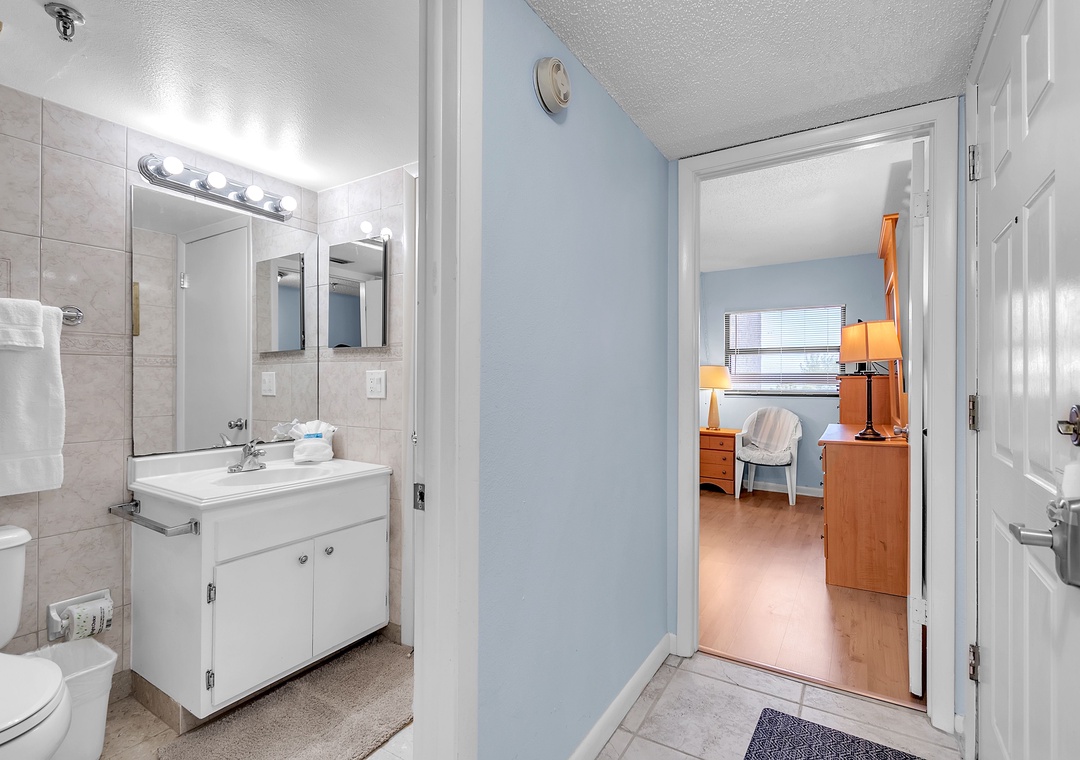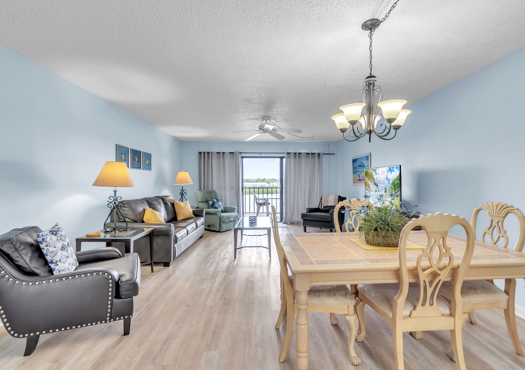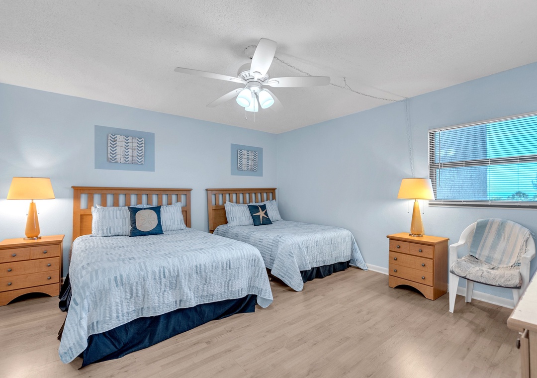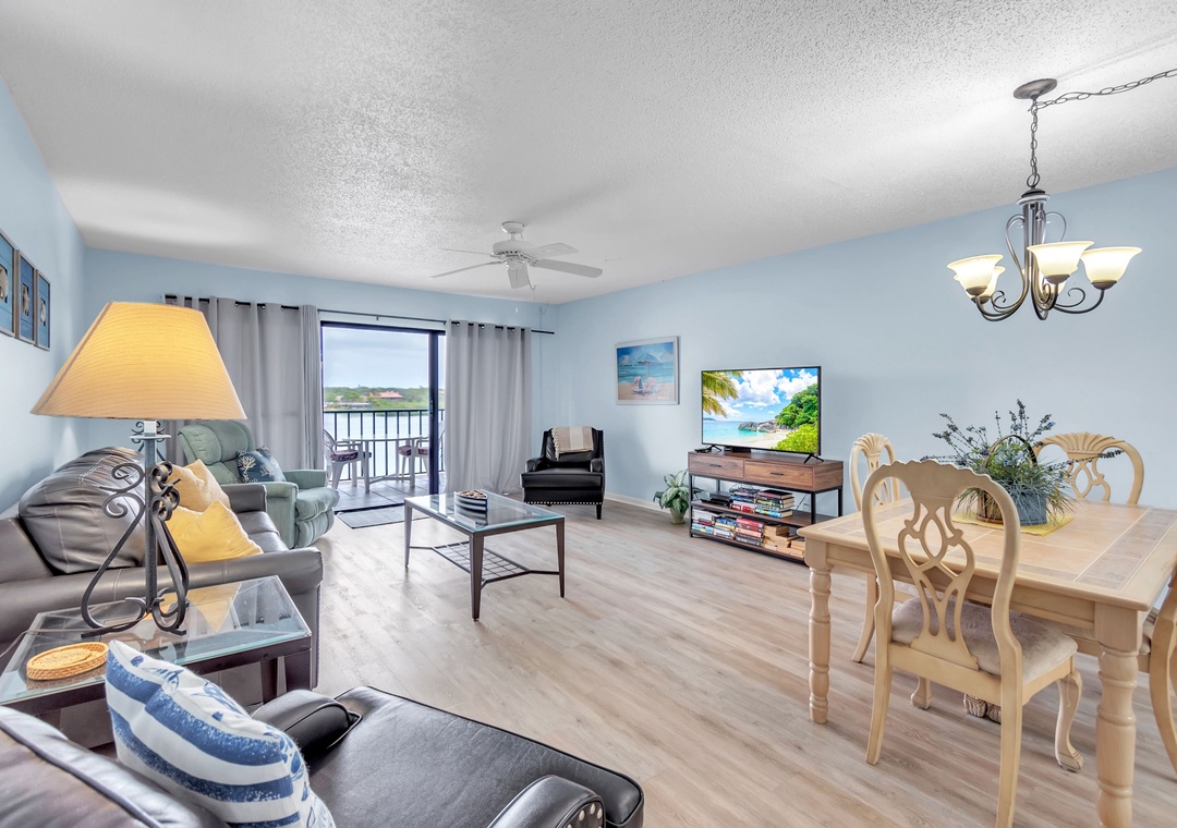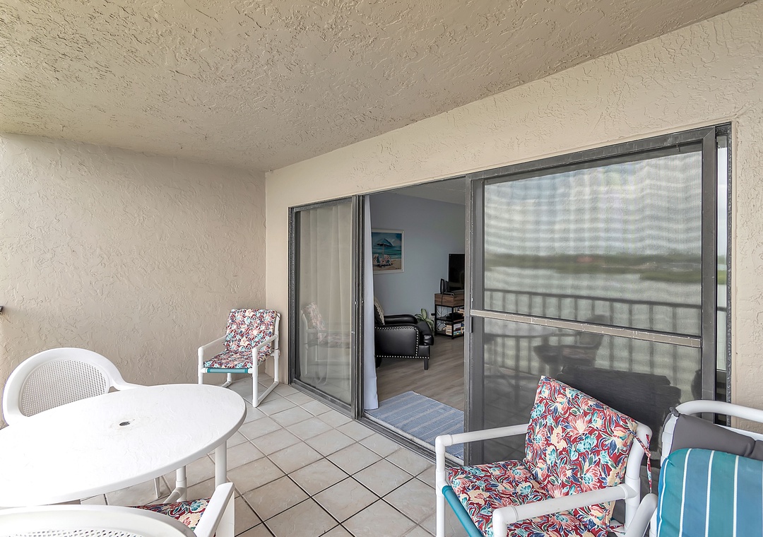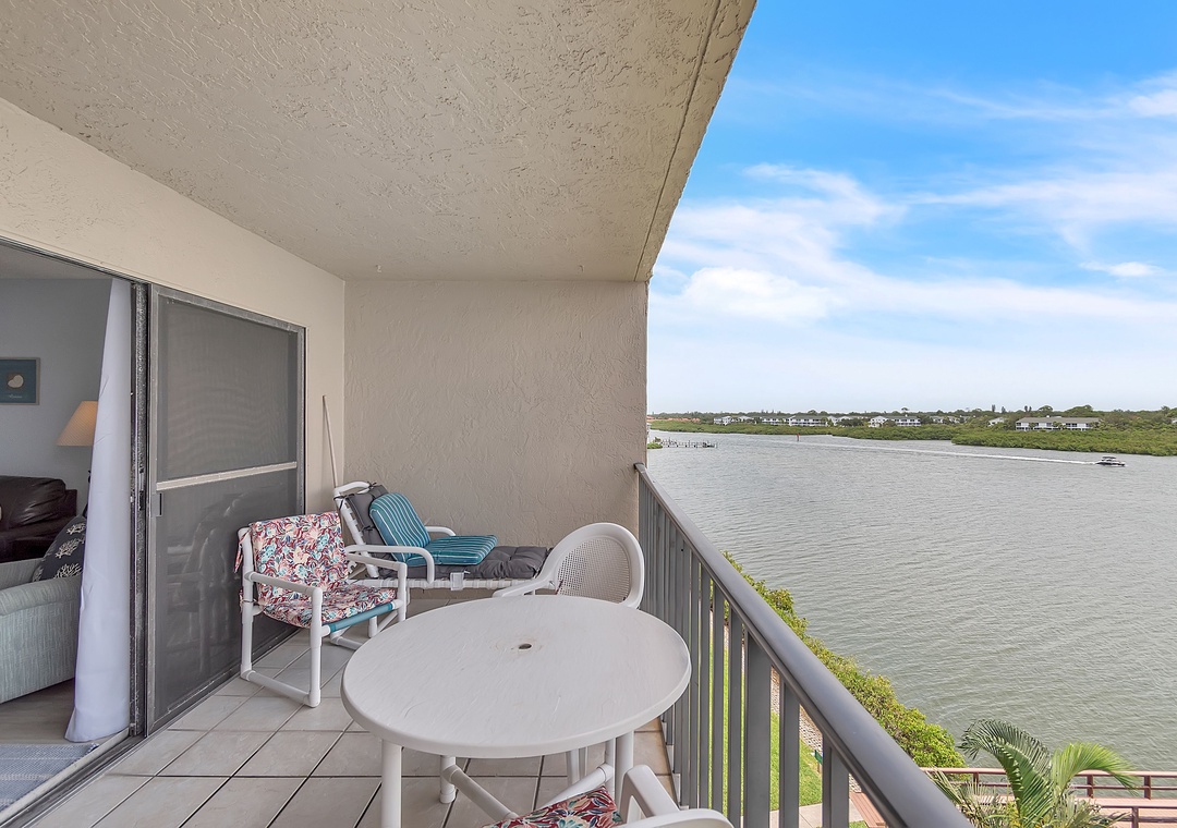 The bedroom features one queen-size bed and one full-size bed, comfortably accommodating up to four guests. The covered balcony/patio provides seating and a lounge chair, where you can enjoy beautiful Intracoastal views while relaxing.