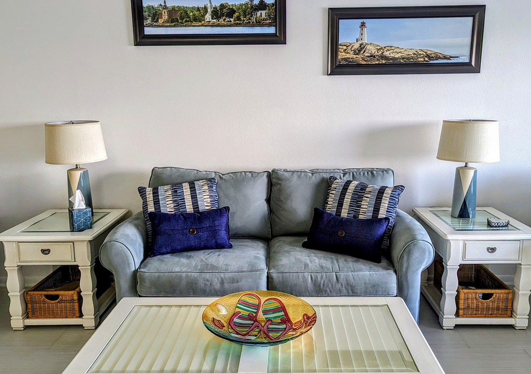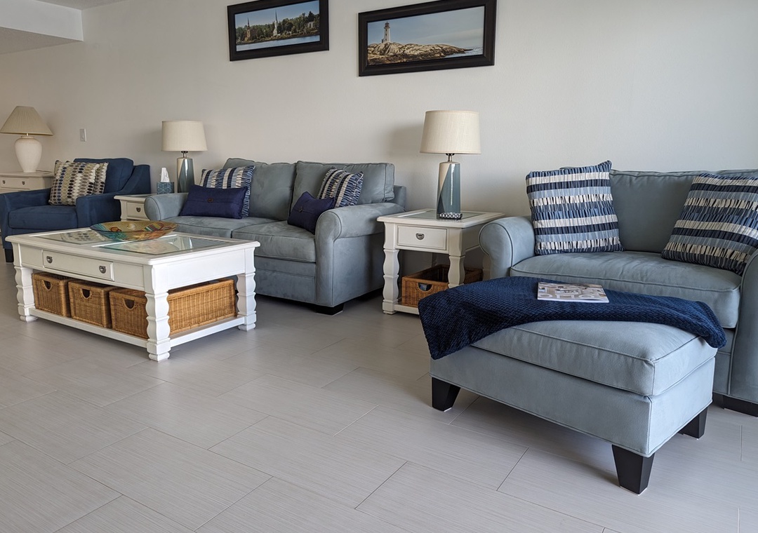 The living room offers comfortable seating with a sofa, loveseat, and lounger. Relax and watch your favorite shows on the Smart TV with an extended channel lineup, or stay connected with the condo’s Wi-Fi.