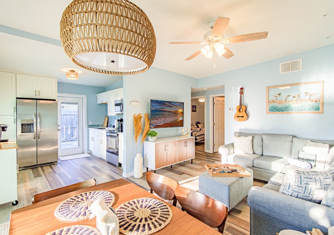 Welcome to Shore La Vie a charming duplex, all to yourself! Just a quick 2-minute drive from Treasure Island Beach, this tropical oasis features two beautifully updated sides with modern touches throughout. Shore Thing is the 1-bedroom, 1-bathroom side, perfect for a couple, with a luxurious king-sized bed. On the other side is Se La Vie offering a spacious 2-bedroom, 1-bathroom layout that comfortably accommodates up to 6 guests, with a king bed in the master, two twin beds in the guest room, and a pull-out sofa in the living room.