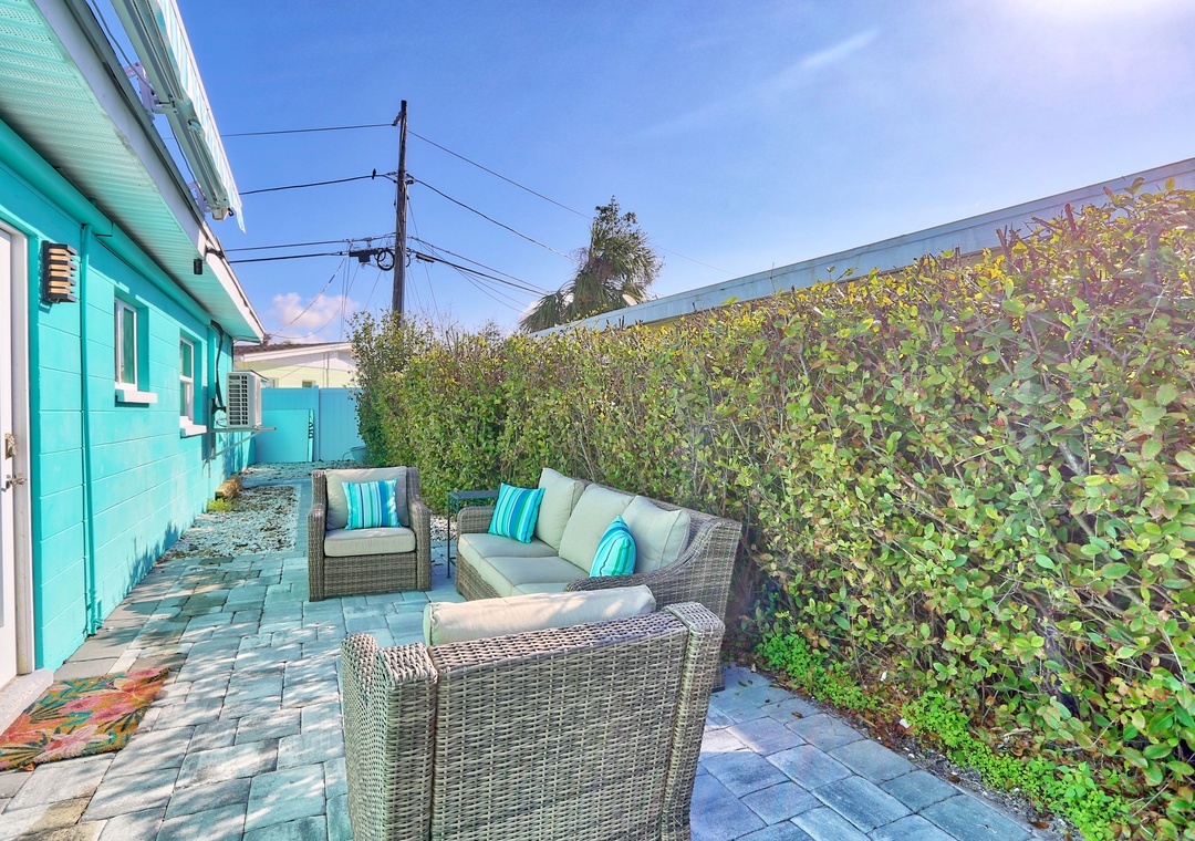 Inside, you'll find a bright and inviting space, decorated with cheerful Florida-inspired decor to set the perfect vacation vibe. The spacious king bedroom ensures a restful night's sleep, while the large, comfy couch in the living area is perfect for lounging. The fully equipped kitchen features stainless steel appliances, along with all the cookware, dishes, and utensils you need to prepare meals at home with counter seating to enjoy it. Have your morning coffee or evening cocktails in your private outdoor seating area, a great spot to unwind. There is a shared washer/dryer onsite for added convenience. Located off the main road and close to shopping, dining, and the beach, this getaway offers both tranquility and easy access to all the local attractions.