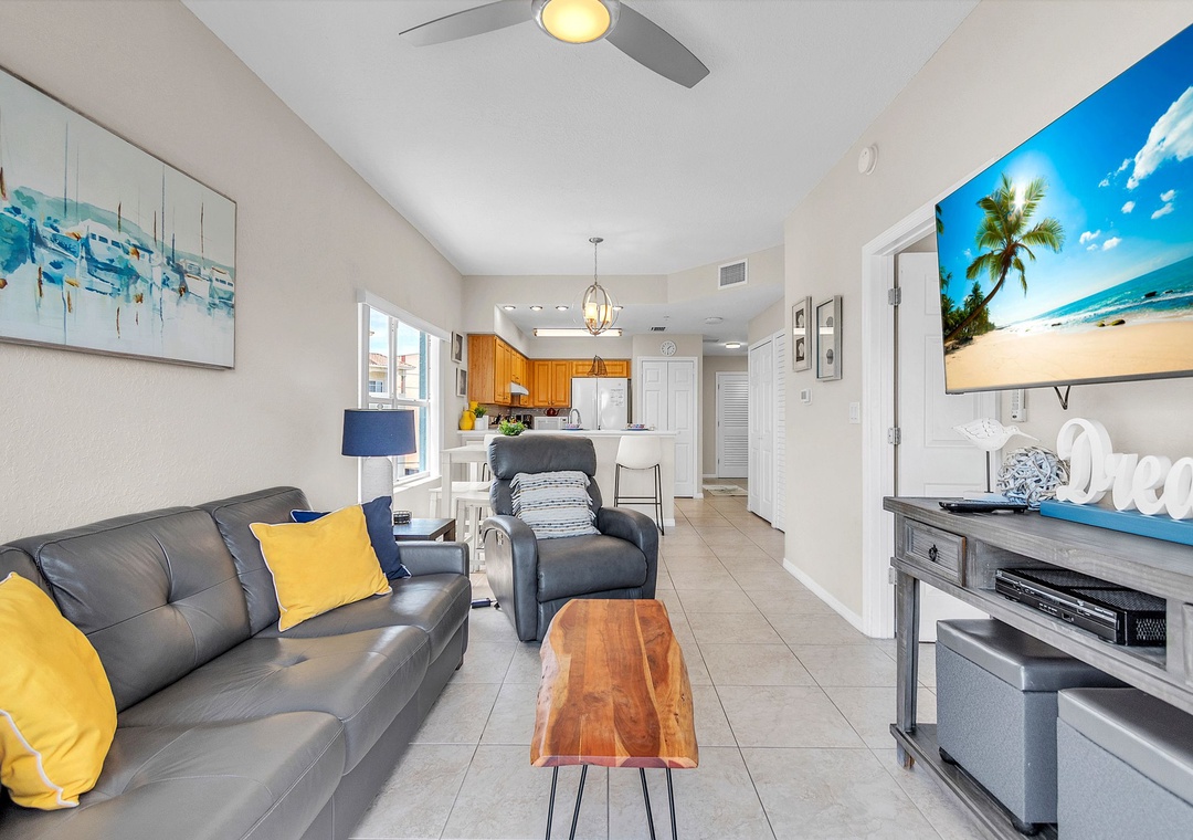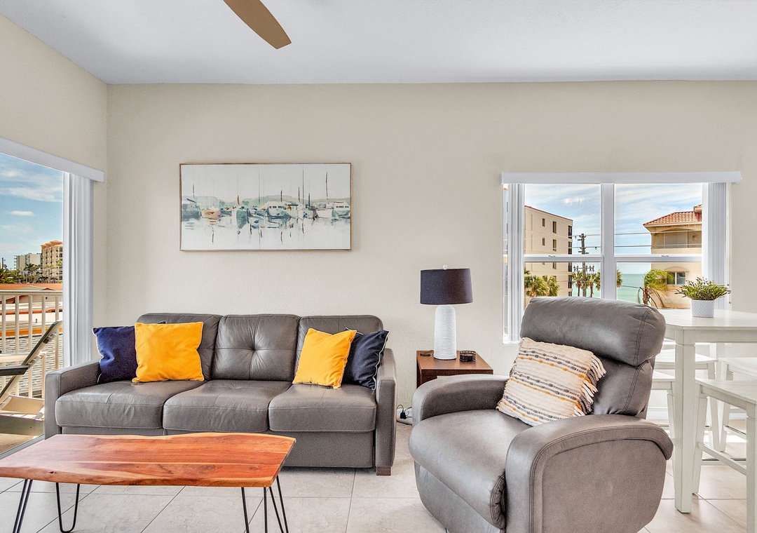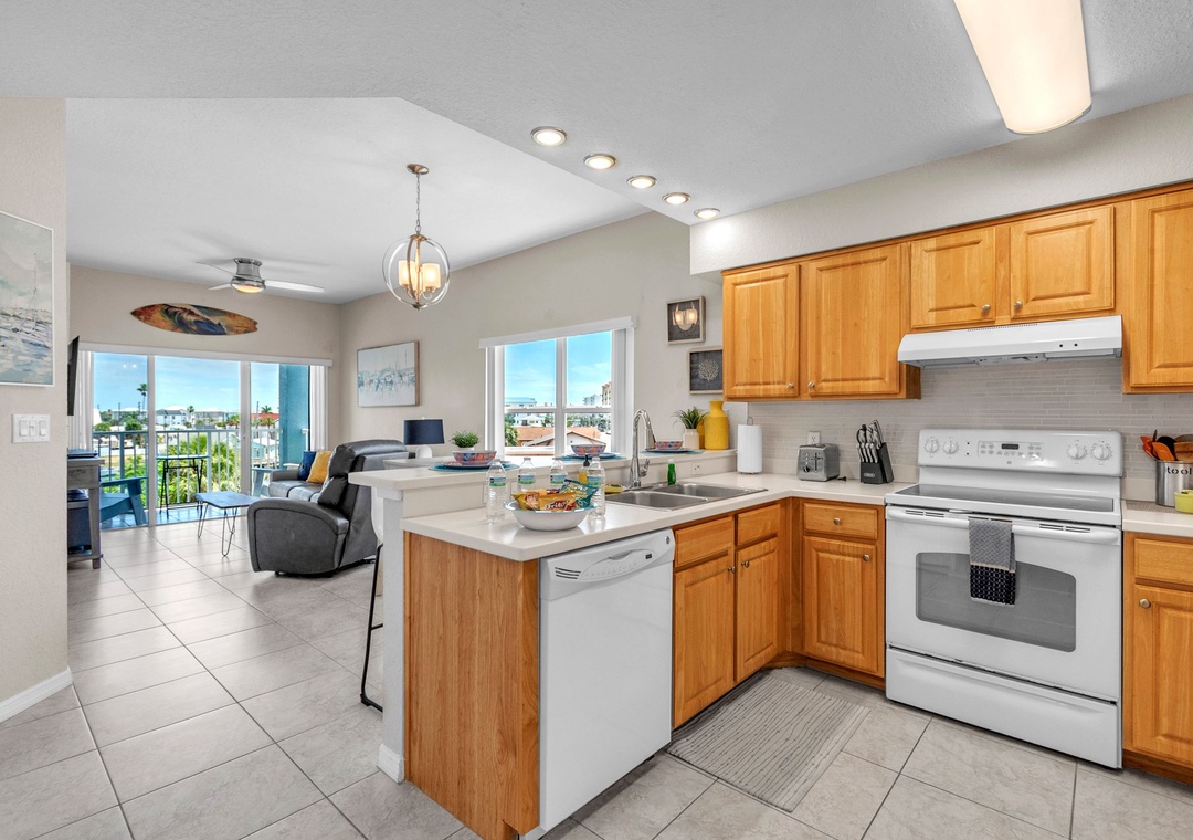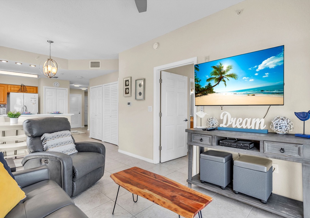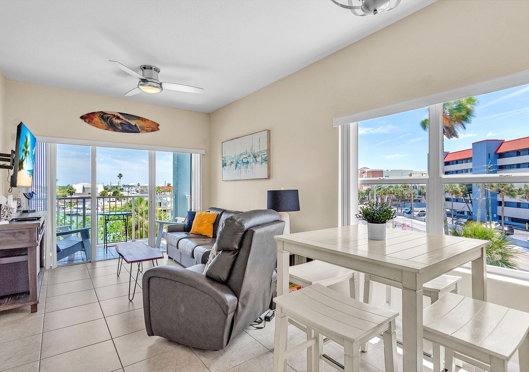 The inviting living room features balcony access, a large smart TV, comfortable couch (folds down to sofa sleeper if needed), and recliner—perfect for relaxing after a day at the beach. The open living, dining, and kitchen area includes a dining table for four plus additional seating at the kitchen counter, creating a great space to gather and enjoy meals together. The spacious kitchen is fully equipped with all major appliances, cookware, dishes, and utensils, making it easy to feel right at home whether cooking in or enjoying takeout.