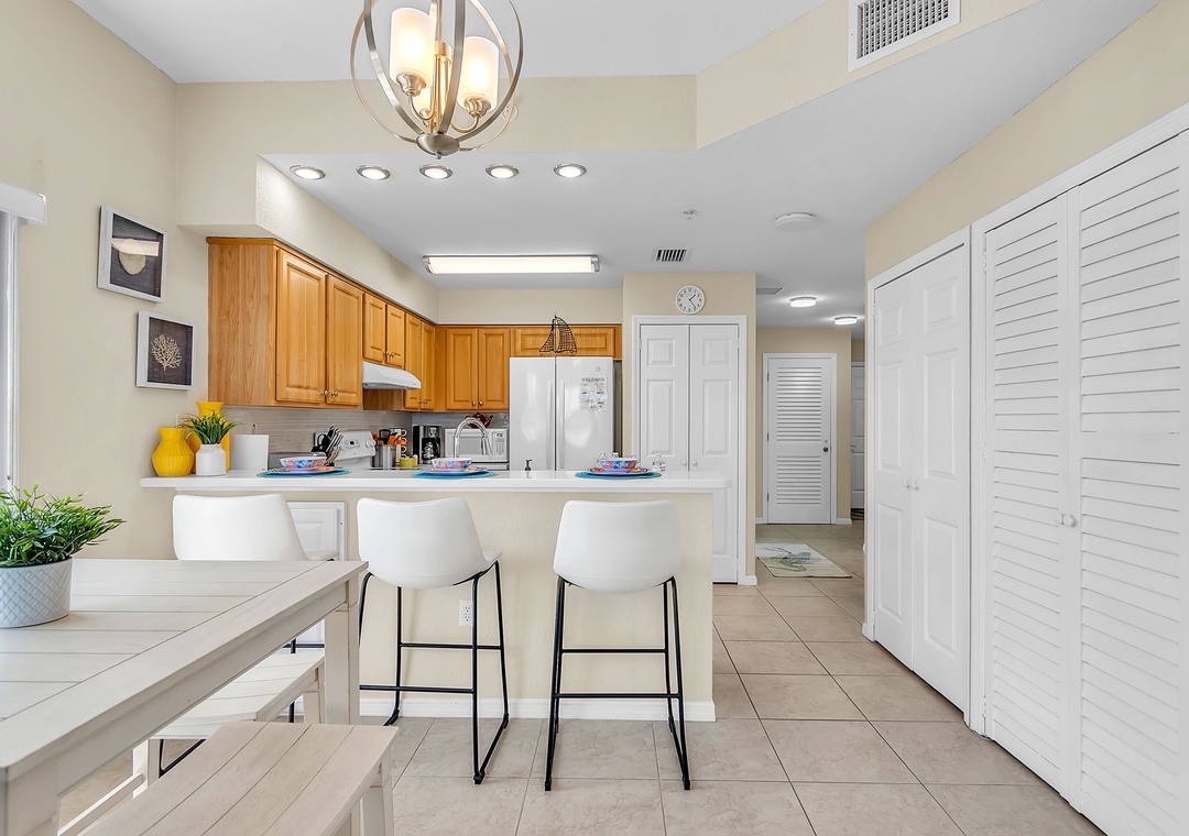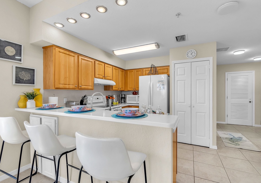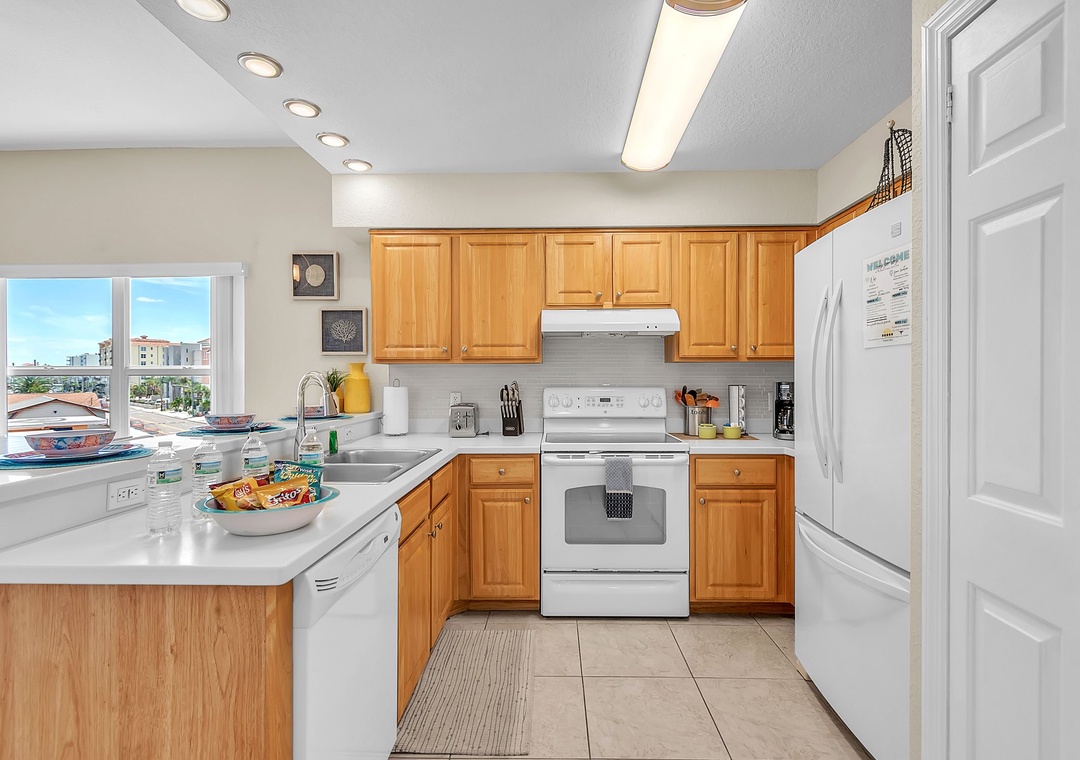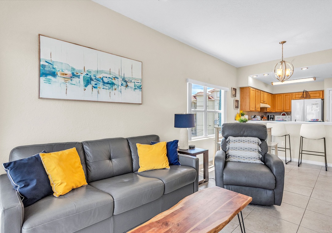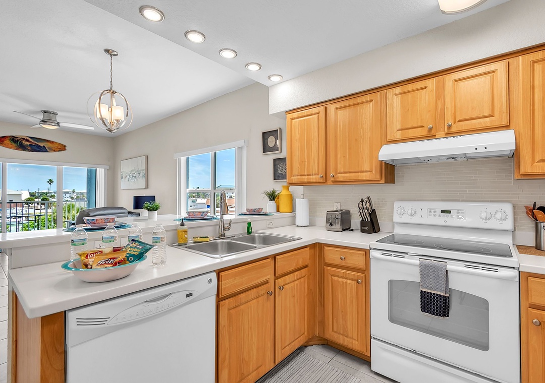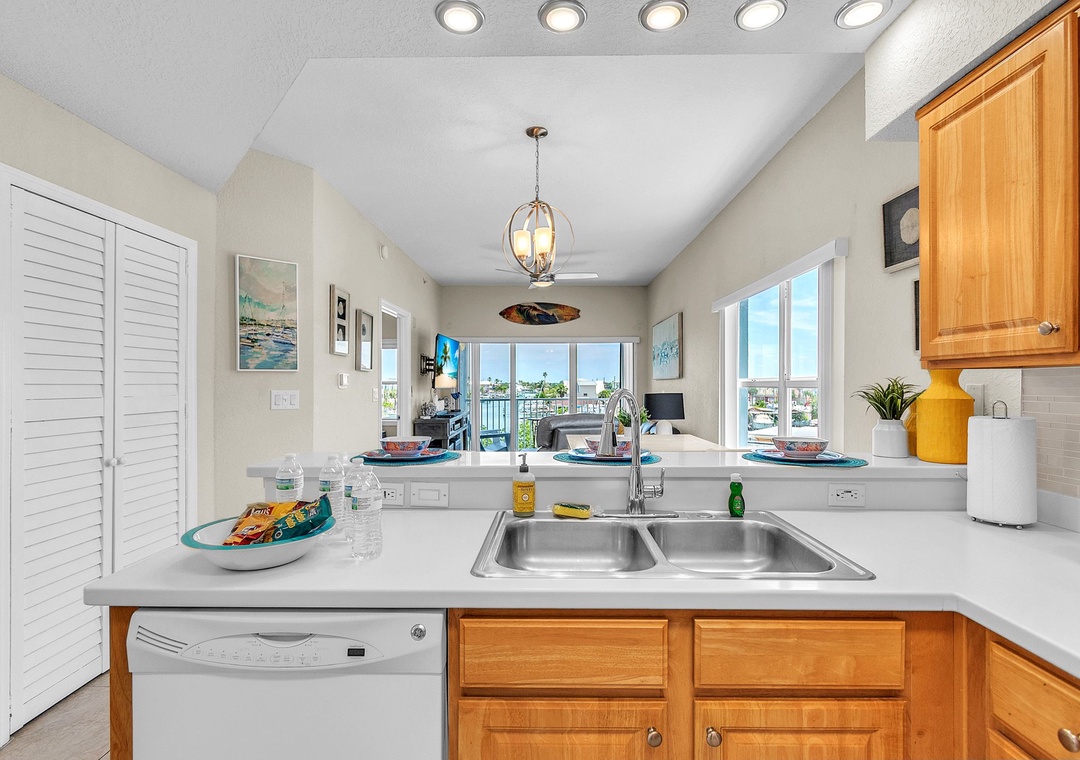 The inviting living room features balcony access, a large smart TV, comfortable couch (folds down to sofa sleeper if needed), and recliner—perfect for relaxing after a day at the beach. The open living, dining, and kitchen area includes a dining table for four plus additional seating at the kitchen counter, creating a great space to gather and enjoy meals together. The spacious kitchen is fully equipped with all major appliances, cookware, dishes, and utensils, making it easy to feel right at home whether cooking in or enjoying takeout.