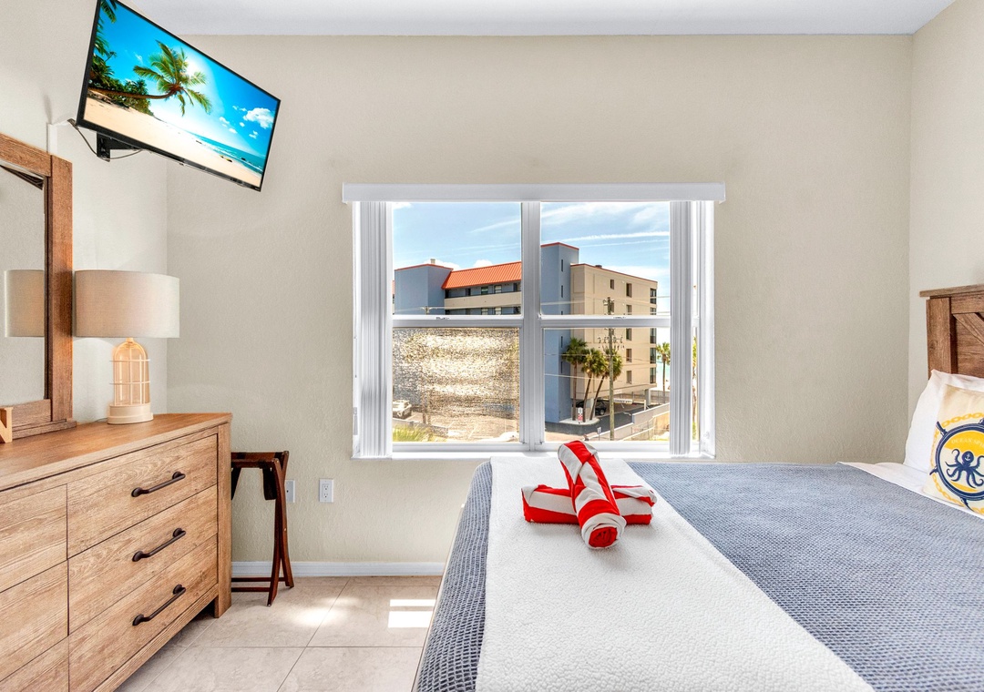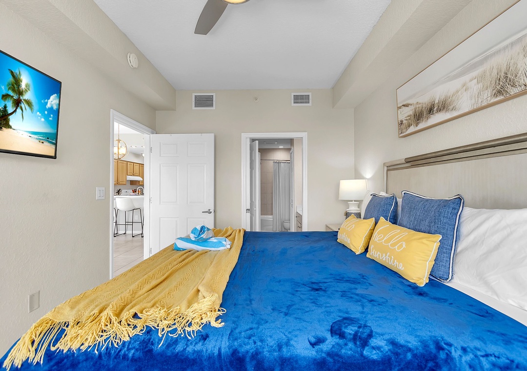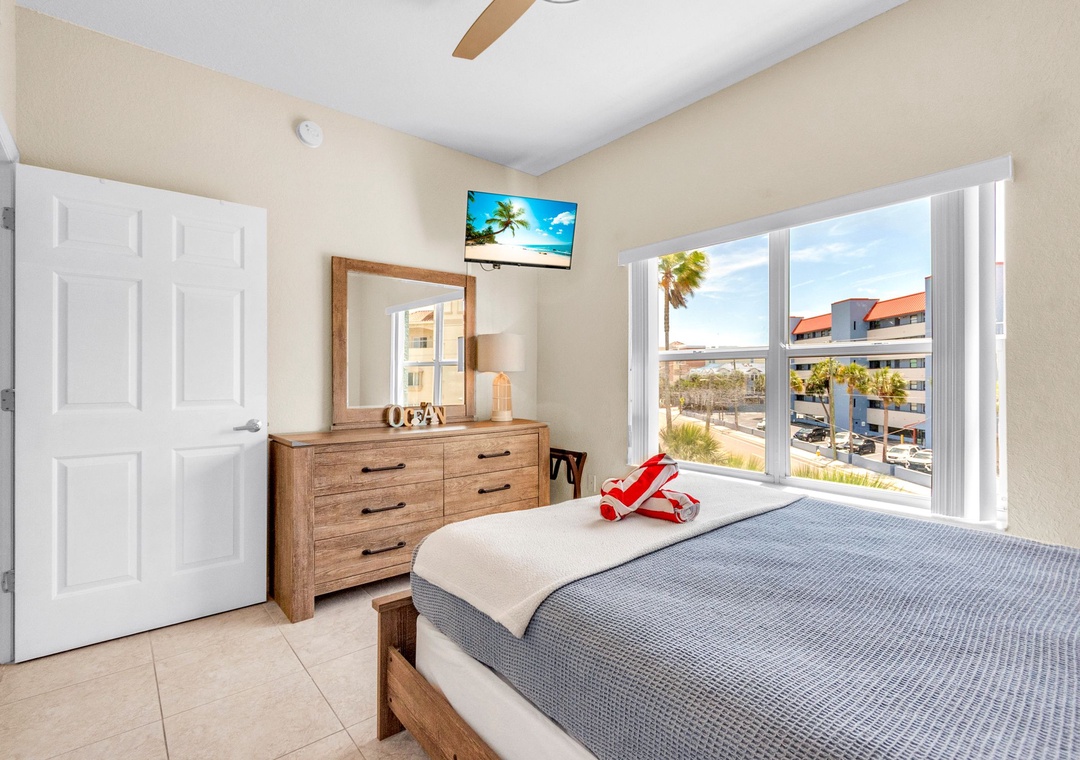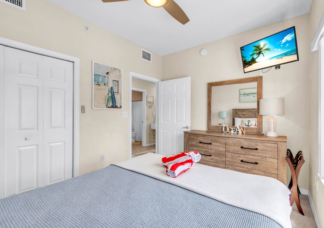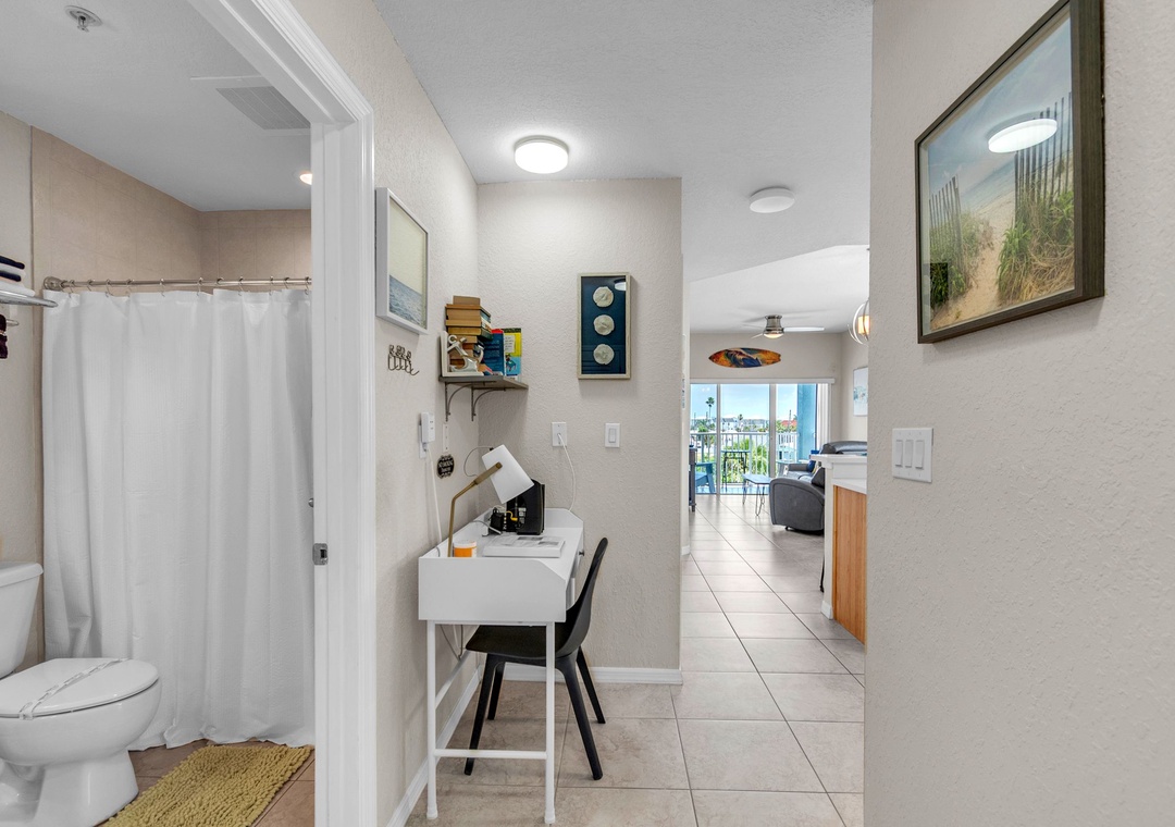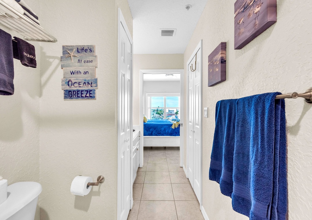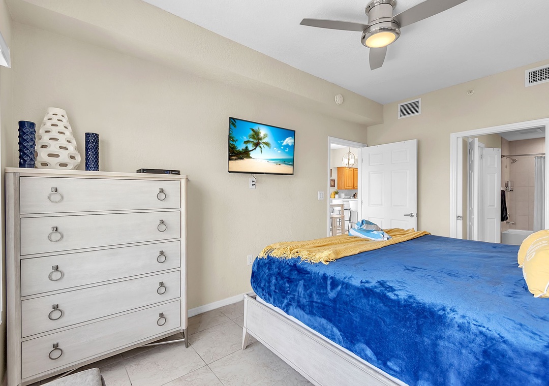 The master bedroom offers a king bed, smart TV, ample closet space, and an attached bathroom with a tub/shower combo. The guest bedroom includes a queen bed and smart TV, with a nearby guest bathroom featuring a walk-in shower. A dedicated desk space adds convenience for remote work or planning your beach days. Additional features include an in-unit washer and dryer and a private balcony off the living room with stunning Intracoastal views and overlooking the pool area—an ideal spot to unwind and take in the coastal scenery.
