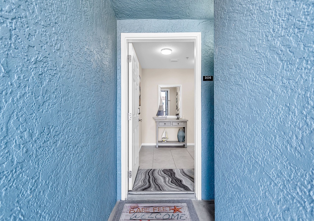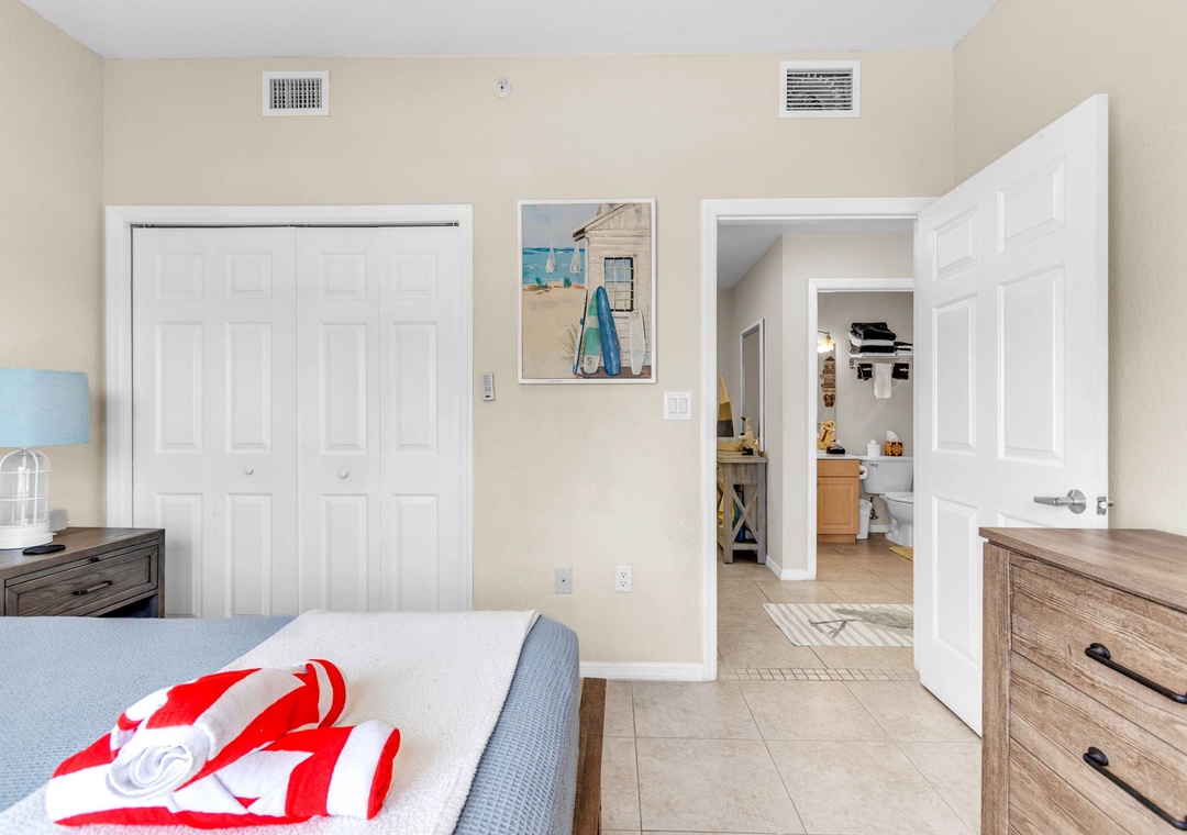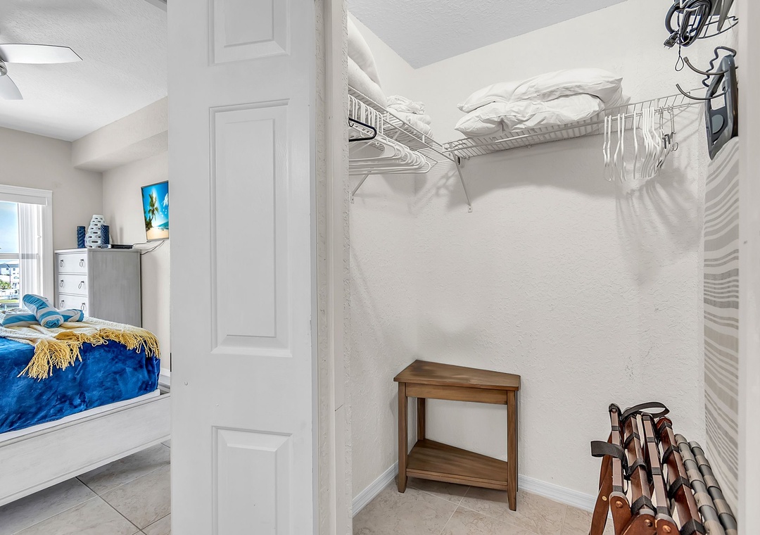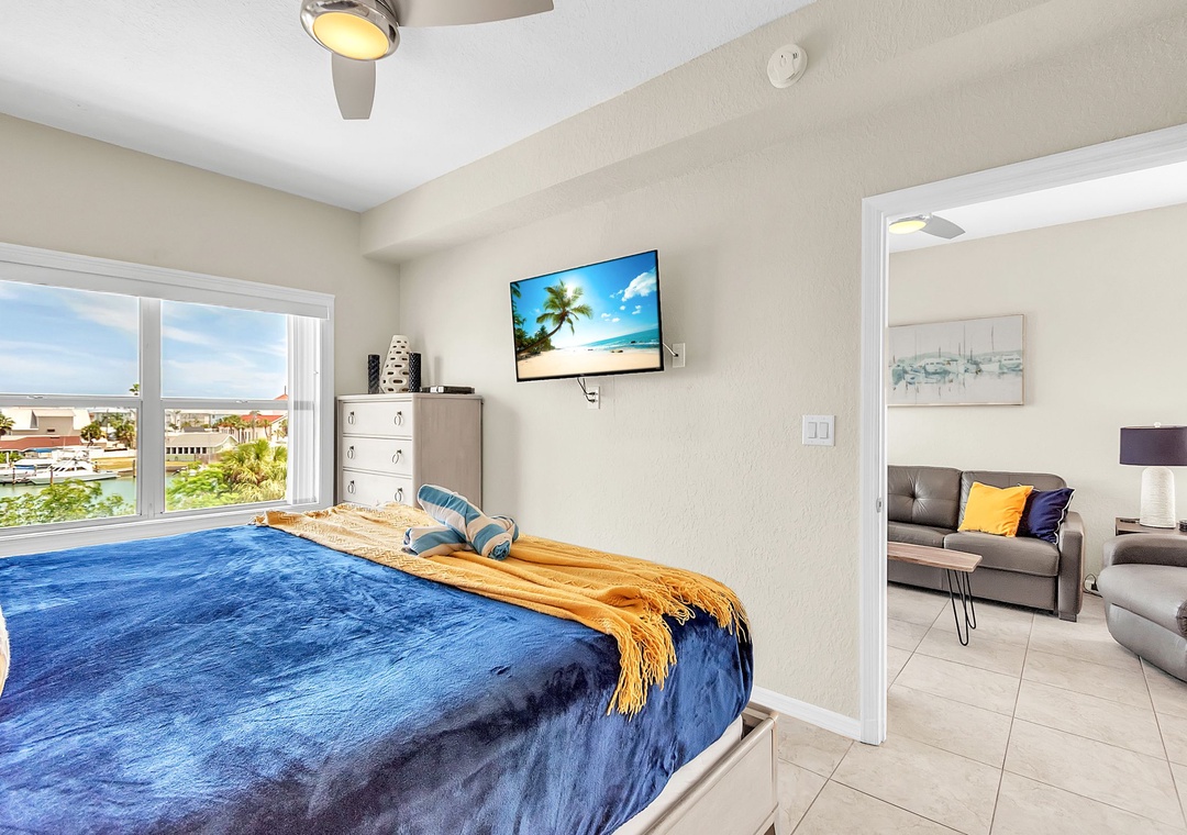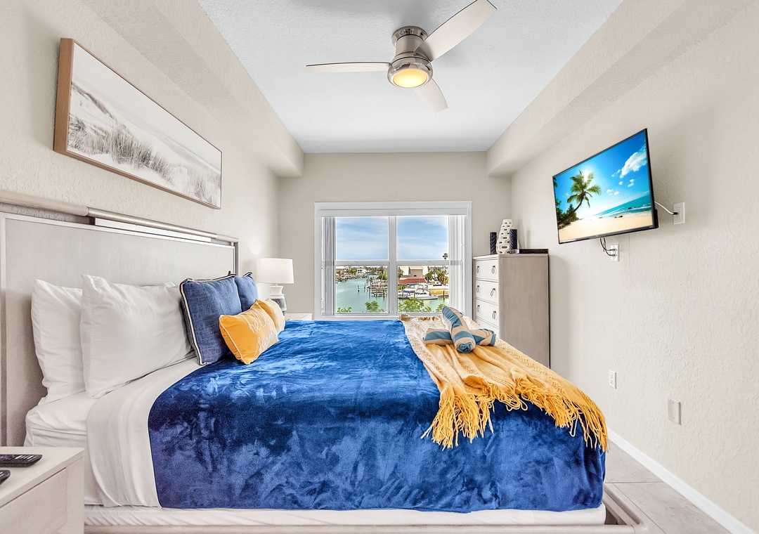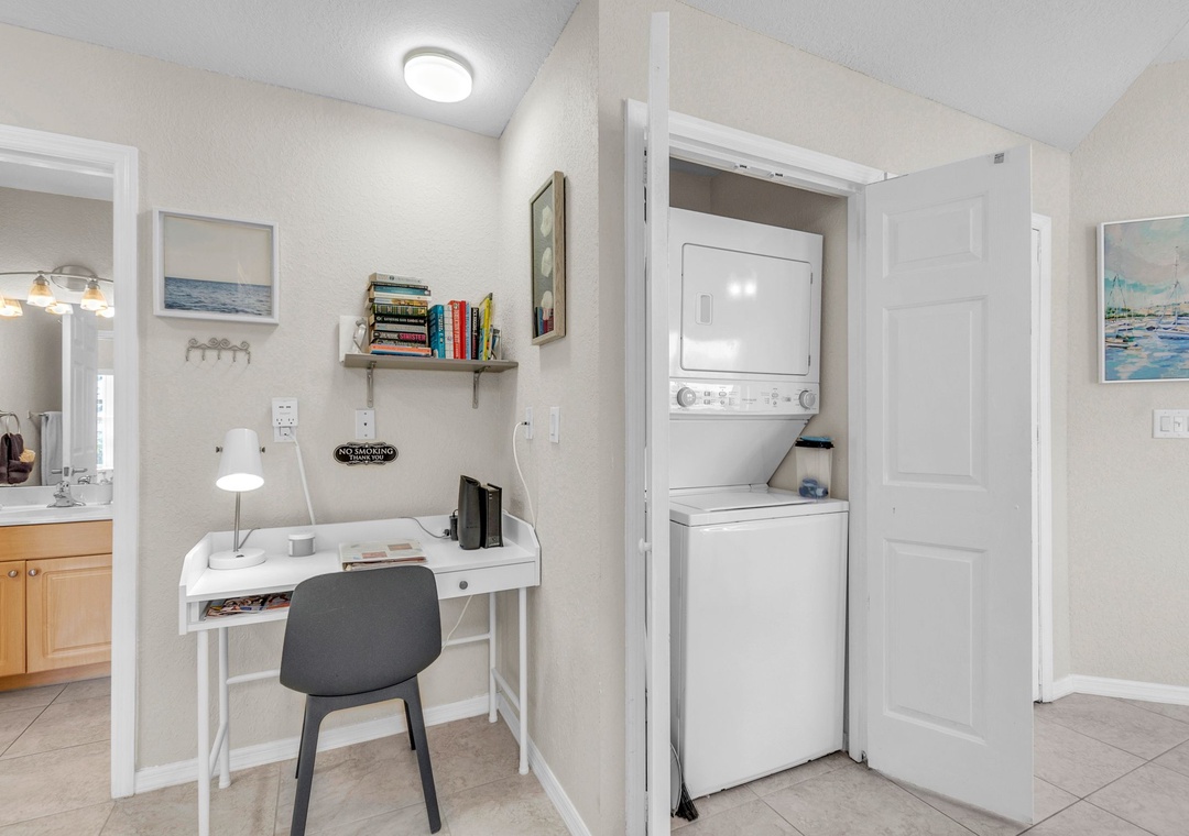 The master bedroom offers a king bed, smart TV, ample closet space, and an attached bathroom with a tub/shower combo. The guest bedroom includes a queen bed and smart TV, with a nearby guest bathroom featuring a walk-in shower. A dedicated desk space adds convenience for remote work or planning your beach days. Additional features include an in-unit washer and dryer and a private balcony off the living room with stunning Intracoastal views and overlooking the pool area—an ideal spot to unwind and take in the coastal scenery.
