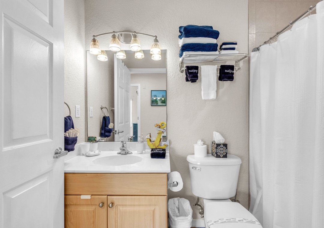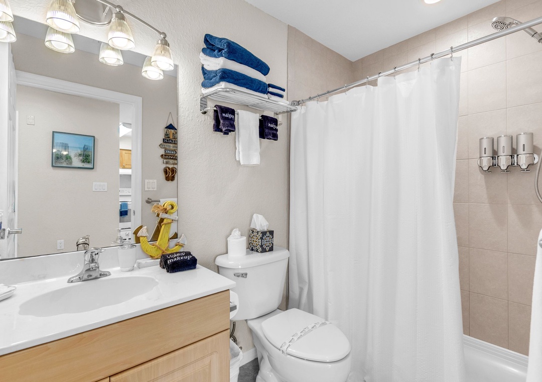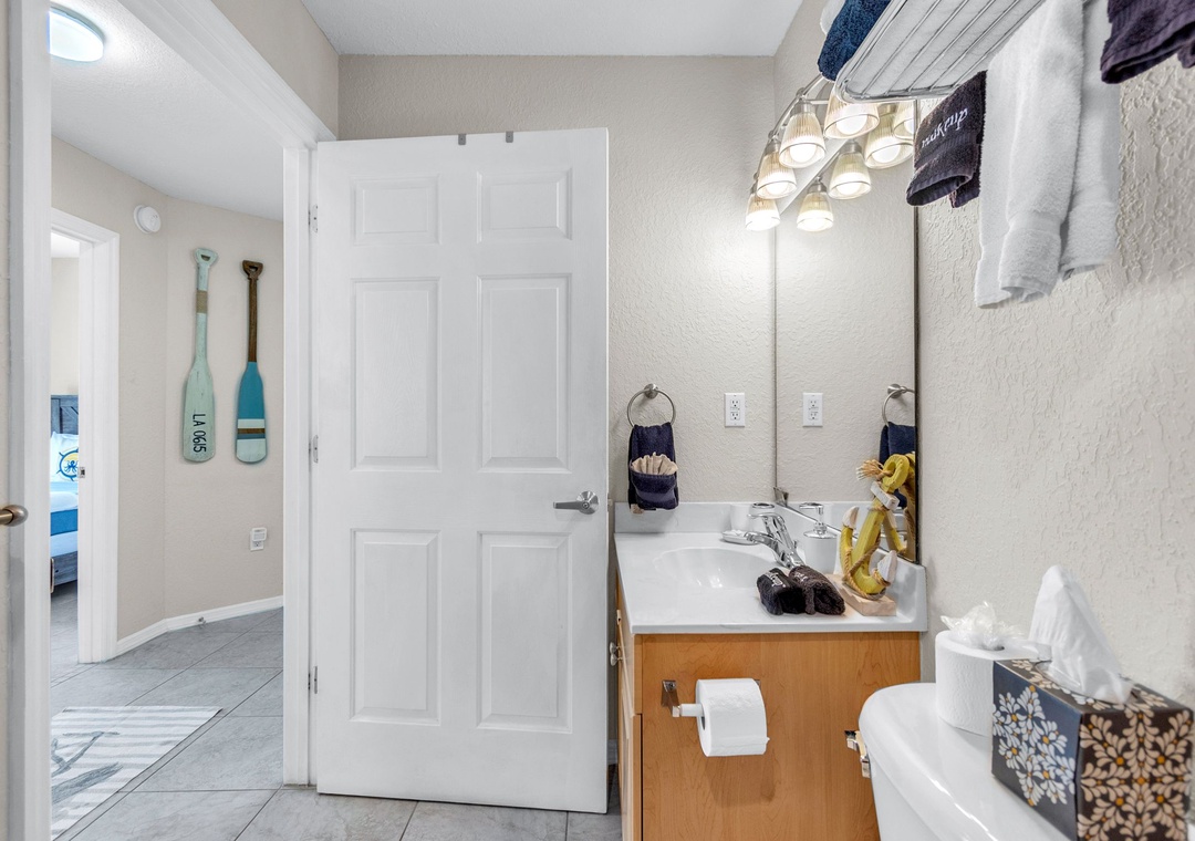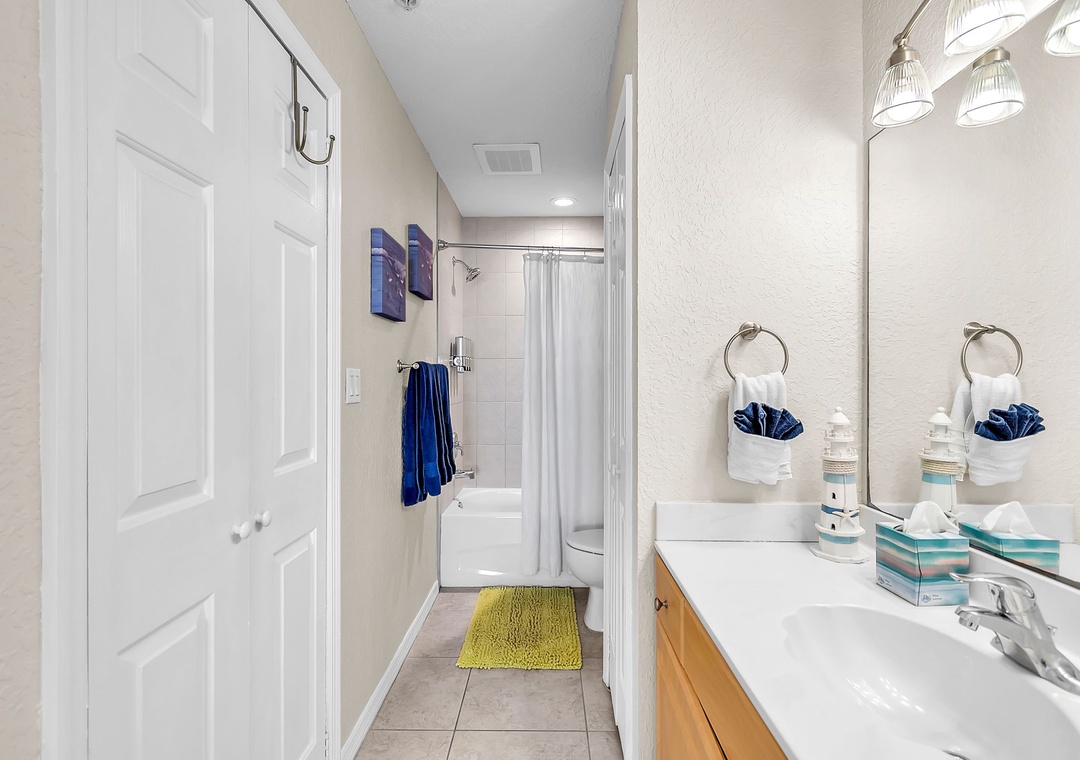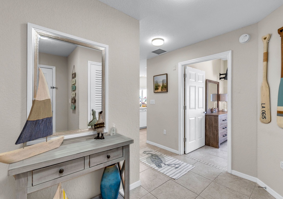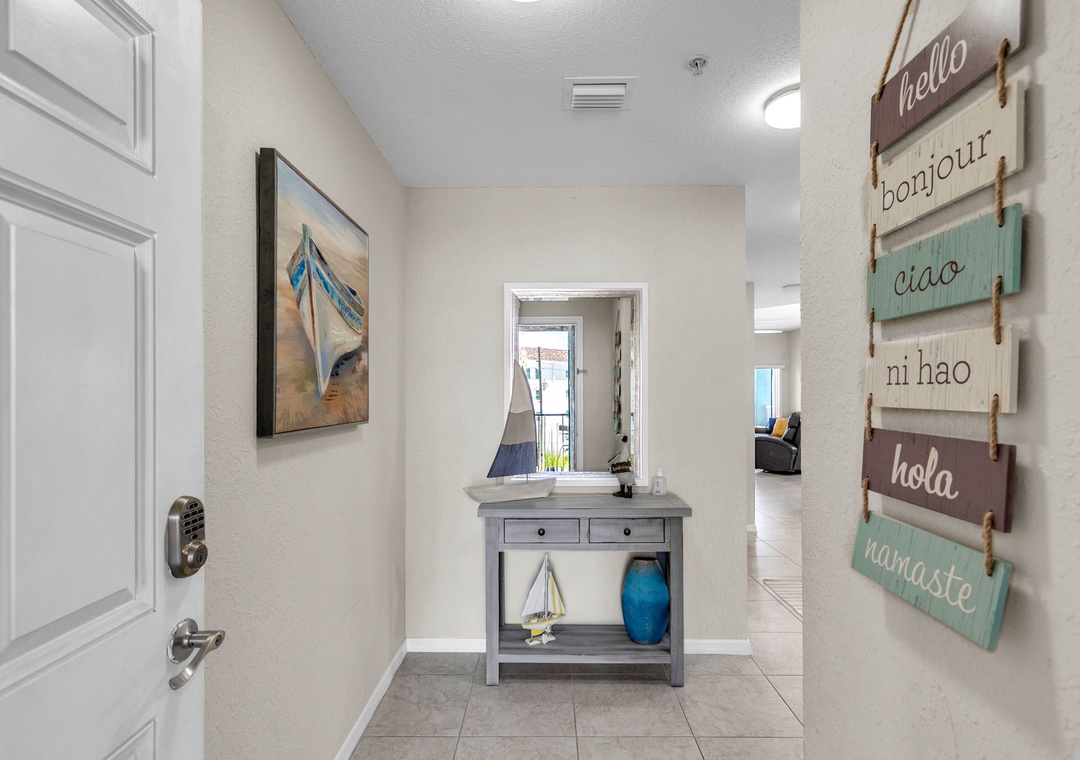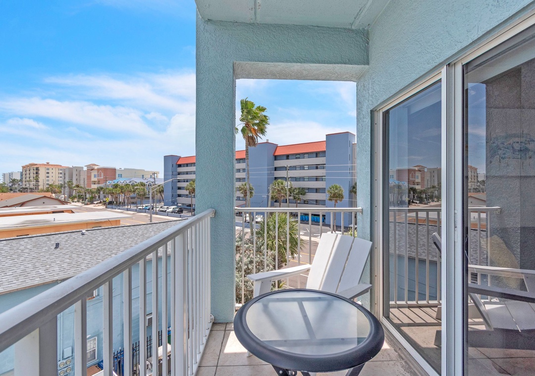 The master bedroom offers a king bed, smart TV, ample closet space, and an attached bathroom with a tub/shower combo. The guest bedroom includes a queen bed and smart TV, with a nearby guest bathroom featuring a walk-in shower. A dedicated desk space adds convenience for remote work or planning your beach days. Additional features include an in-unit washer and dryer and a private balcony off the living room with stunning Intracoastal views and overlooking the pool area—an ideal spot to unwind and take in the coastal scenery.