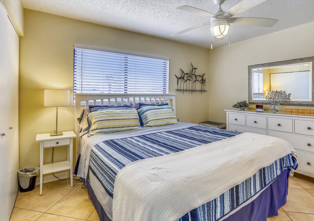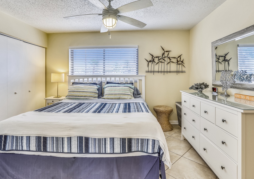 This condo is located in the popular Sunset Beach neighborhood of Treasure Island right on the beach. It has 1-bedroom, 1-bath and was completely remodeled. The fully equipped kitchen has all you need to prepare a nice meal. Pretty tile flooring throughout and tasteful décor. The comfortable living area features a 50” flat screen TV. There is a king bed and another flat screen TV in the bedroom. Coin operated washer/dryer on site. The living room is on the beach side of the condo and it has a large window facing the Gulf of Mexico. The view is fantastic! Free WiFi and free parking is available.