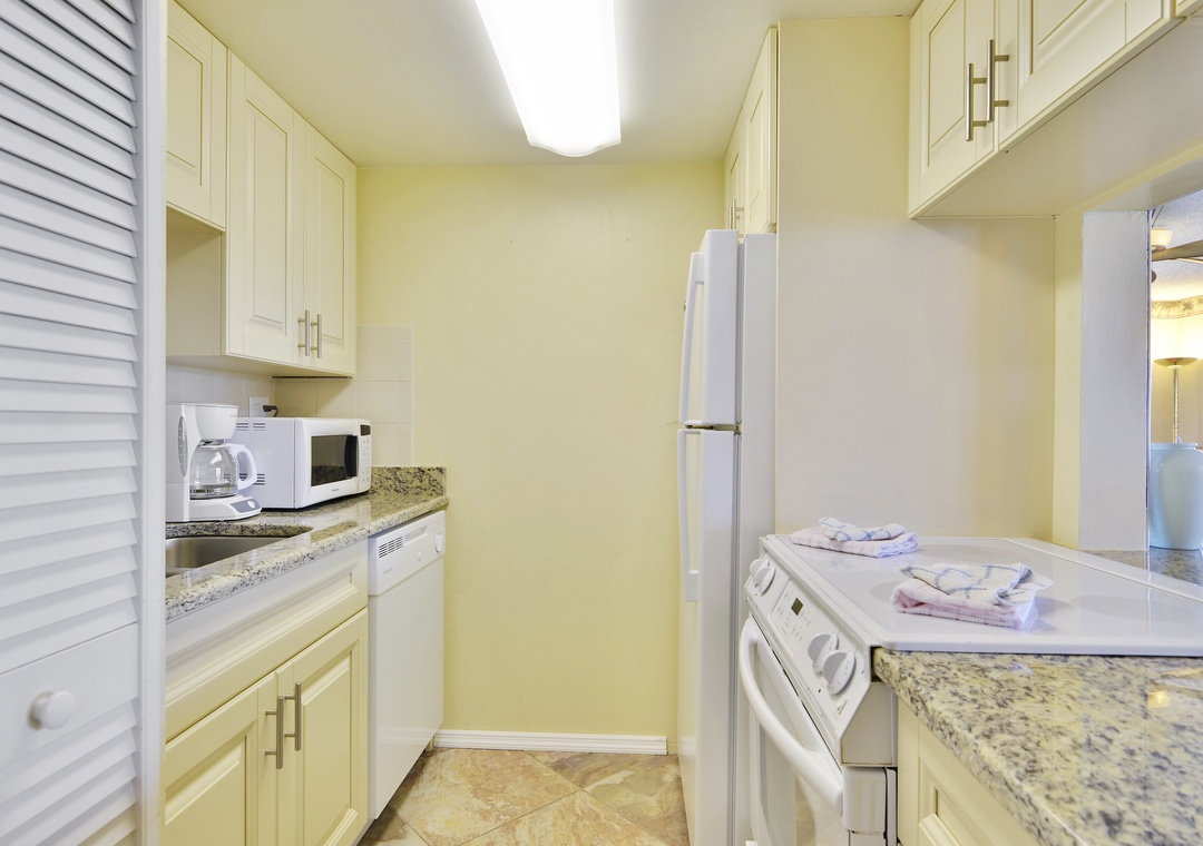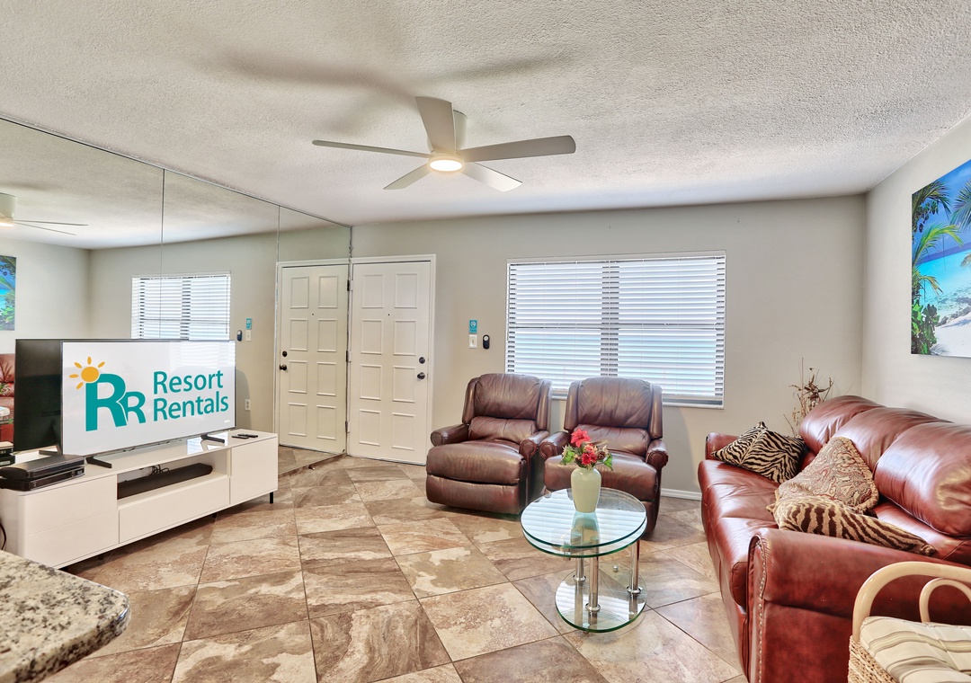 The spacious living area features a comfy couch, two recliners, and a large-screen TV—perfect for unwinding after a day at the beach. Whip up quick meals in the fully stocked kitchen, then retreat to the serene master bedroom with a plush king-sized bed. The modern bathroom offers a sleek walk-in shower. Free Wi-Fi included, plus coin-operated laundry on each floor for your convenience.