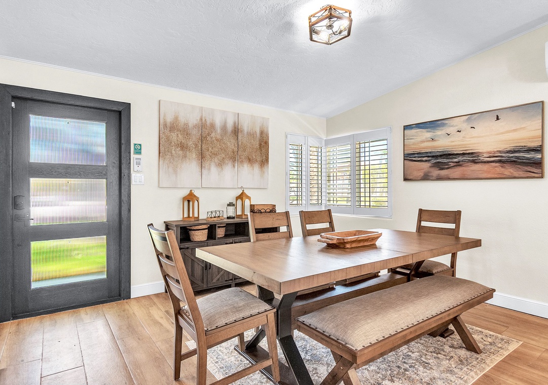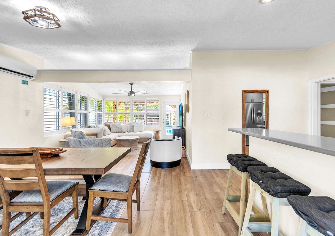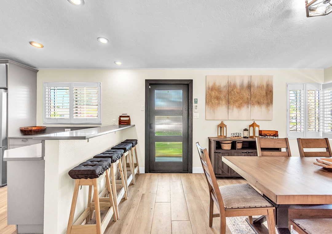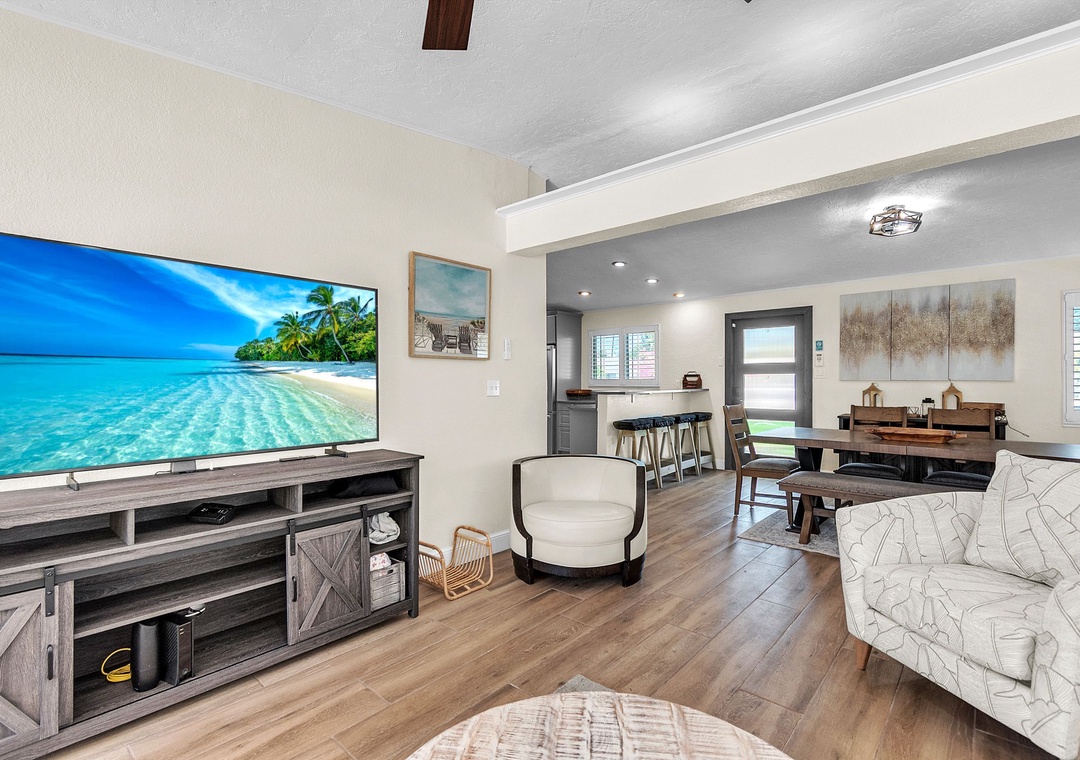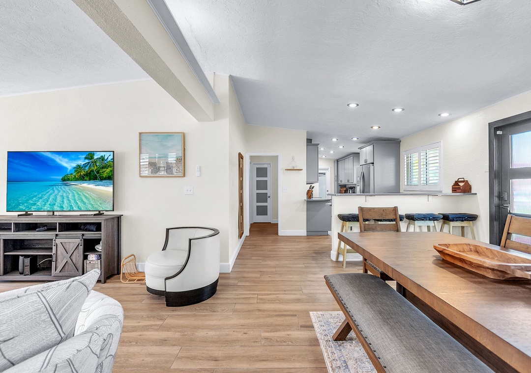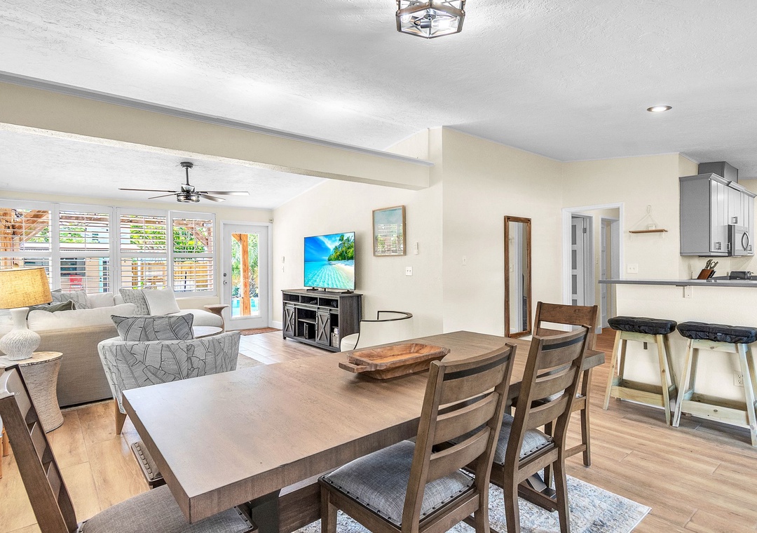 Inside, the home features an open and inviting layout. The living room is generously sized with an oversized sectional sofa, two additional chairs, a Smart TV, and direct access to the patio and pool area. The space flows seamlessly into the dining area and fully updated kitchen, creating the perfect setting for gathering together. The dining table comfortably seats five and is ideal for meals or game nights. The kitchen is equipped with stainless steel appliances, extra counter seating, and is fully stocked with cookware, dishes, utensils, and a drip coffee maker—everything you need to feel right at home.