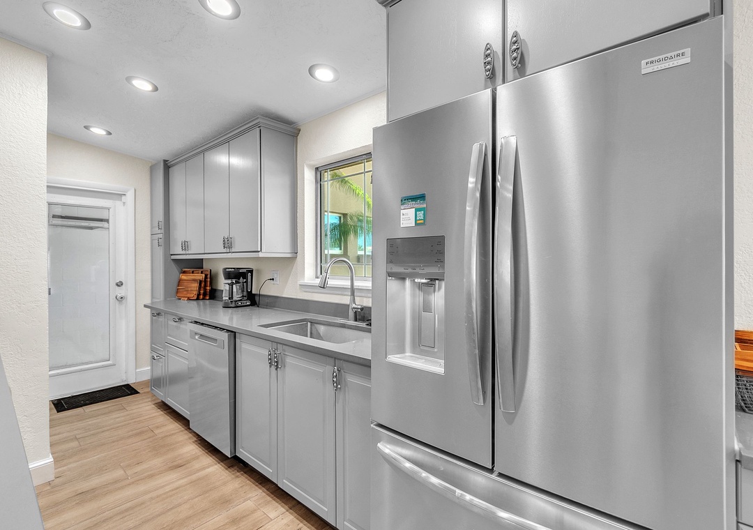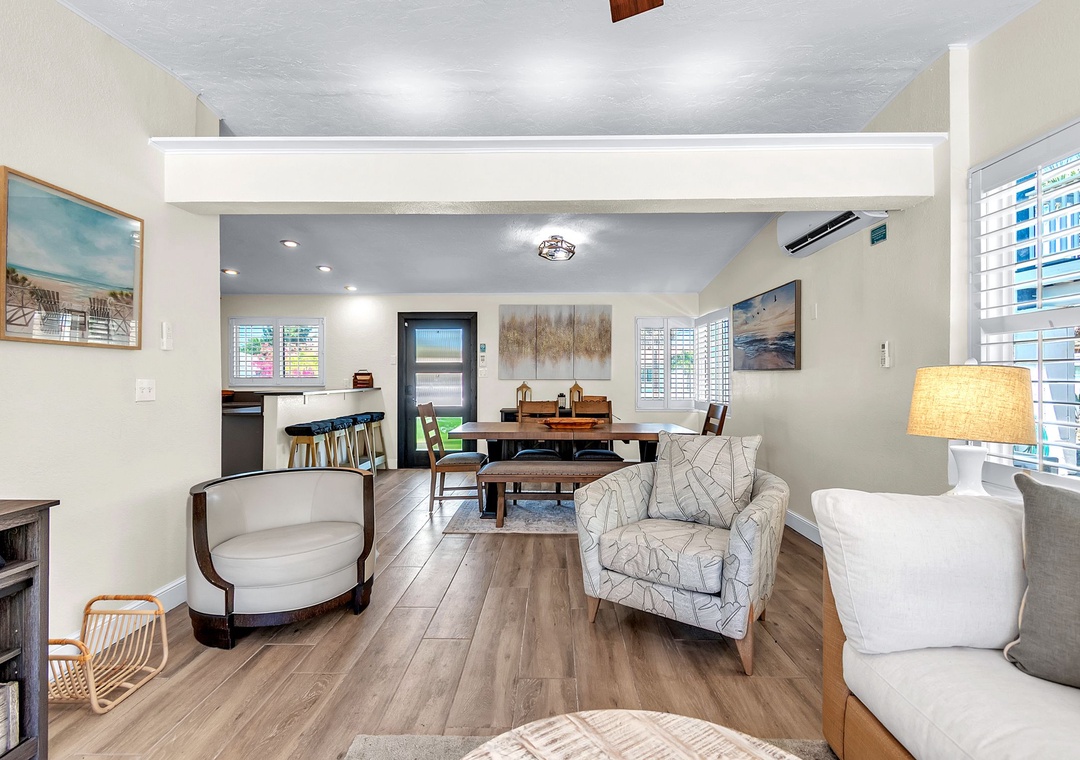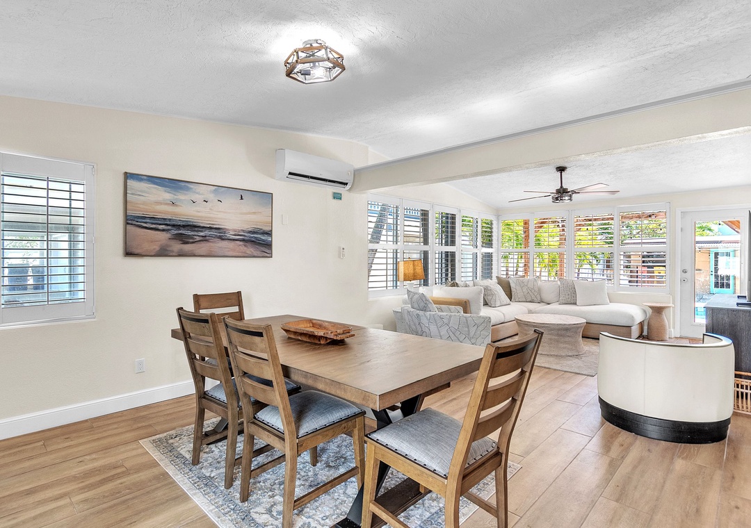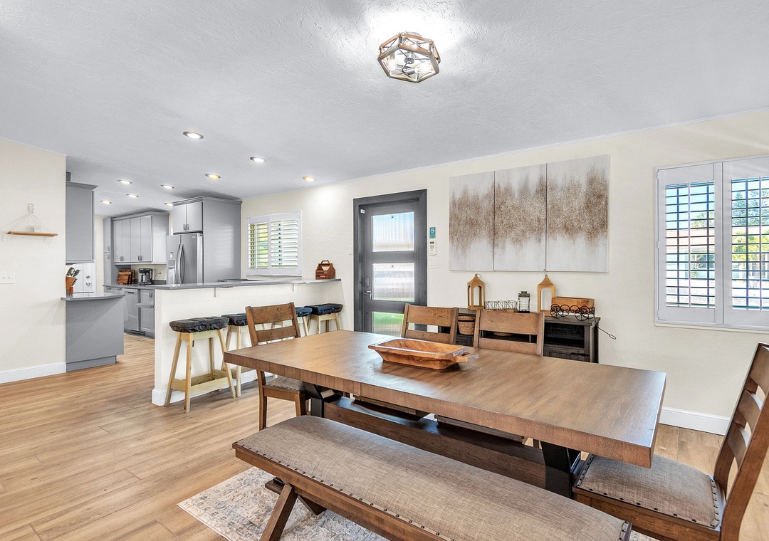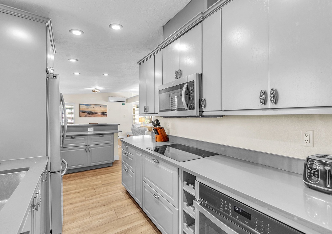 Inside, the home features an open and inviting layout. The living room is generously sized with an oversized sectional sofa, two additional chairs, a Smart TV, and direct access to the patio and pool area. The space flows seamlessly into the dining area and fully updated kitchen, creating the perfect setting for gathering together. The dining table comfortably seats five and is ideal for meals or game nights. The kitchen is equipped with stainless steel appliances, extra counter seating, and is fully stocked with cookware, dishes, utensils, and a drip coffee maker—everything you need to feel right at home.