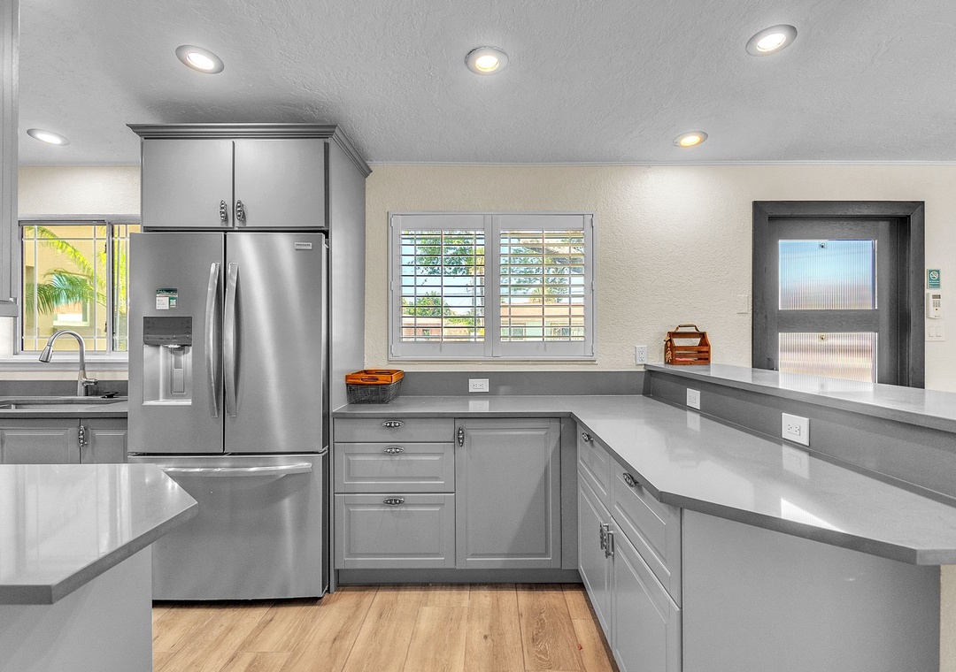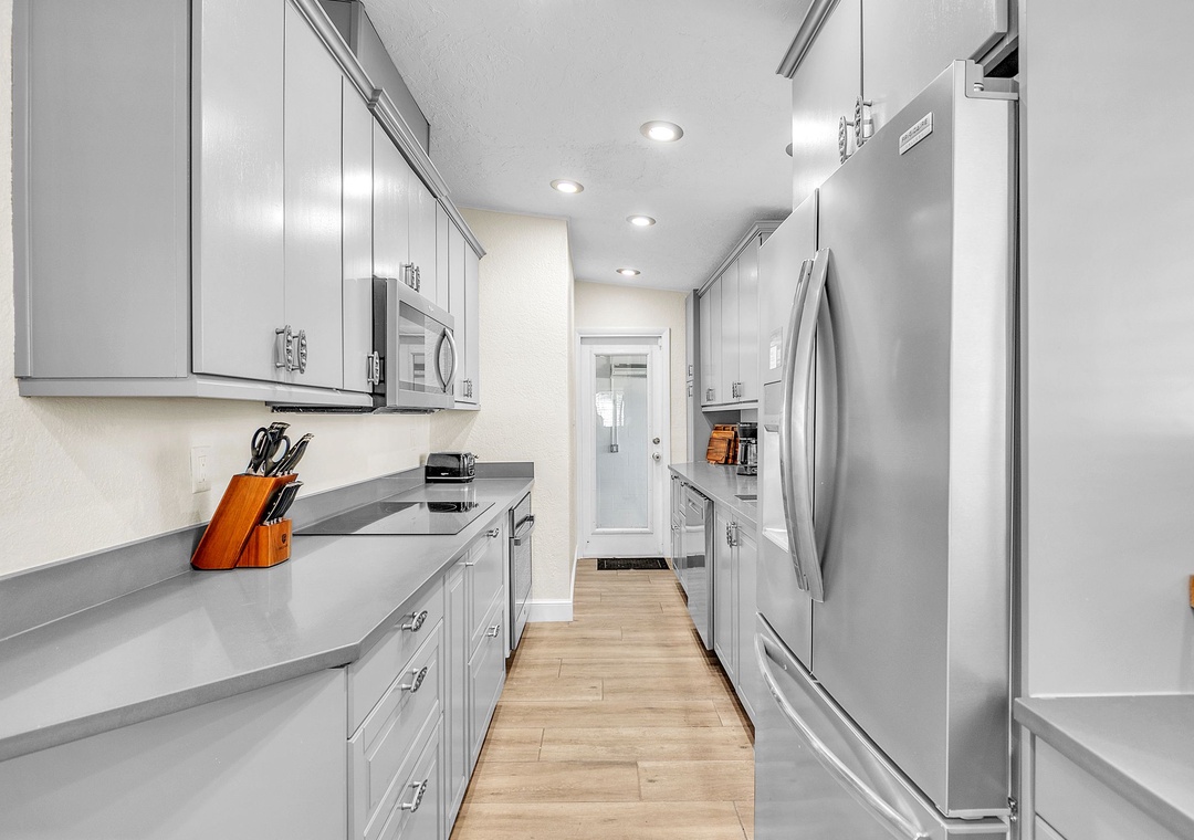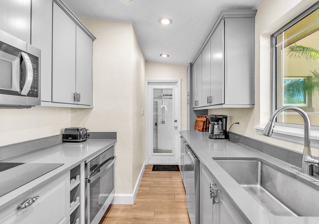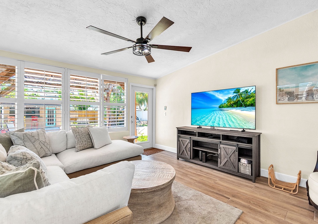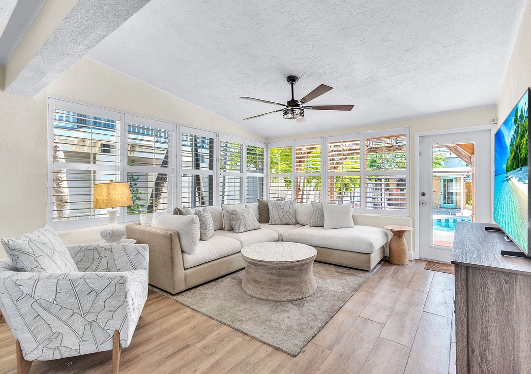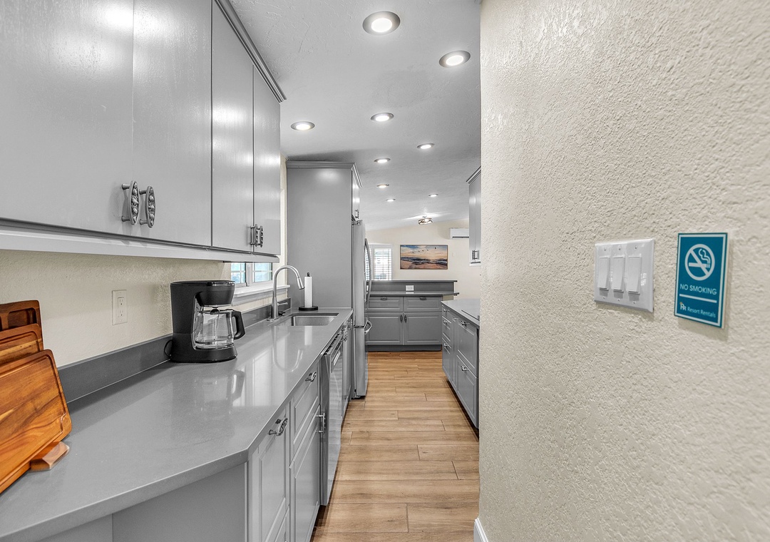 Inside, the home features an open and inviting layout. The living room is generously sized with an oversized sectional sofa, two additional chairs, a Smart TV, and direct access to the patio and pool area. The space flows seamlessly into the dining area and fully updated kitchen, creating the perfect setting for gathering together. The dining table comfortably seats five and is ideal for meals or game nights. The kitchen is equipped with stainless steel appliances, extra counter seating, and is fully stocked with cookware, dishes, utensils, and a drip coffee maker—everything you need to feel right at home.